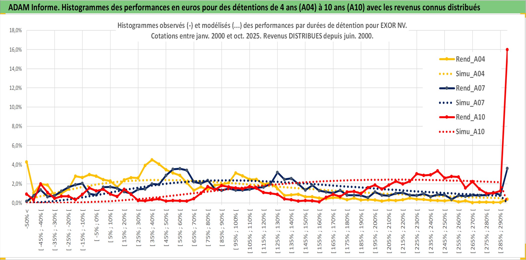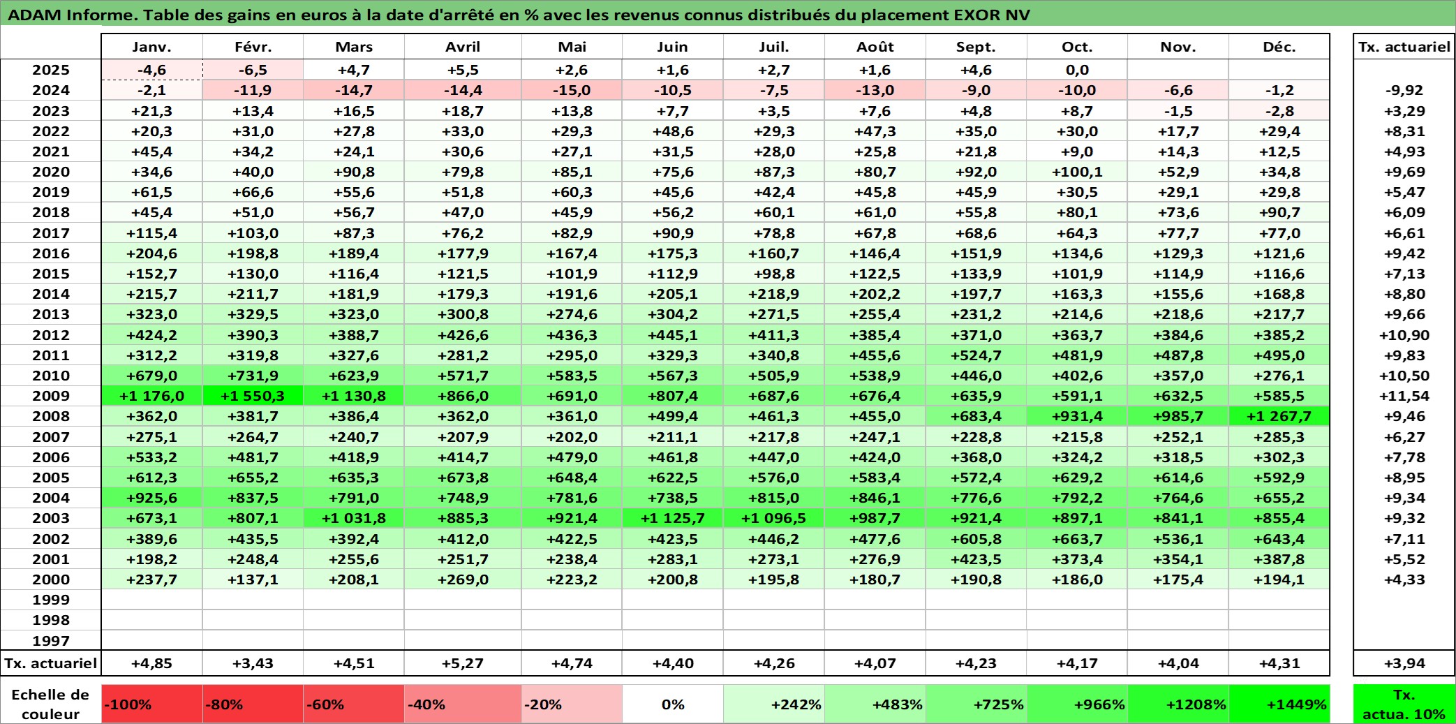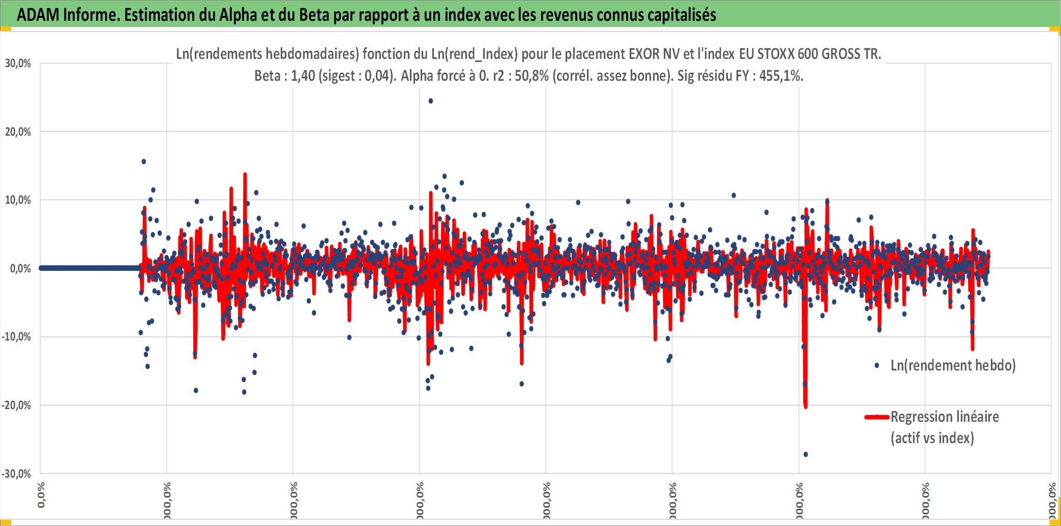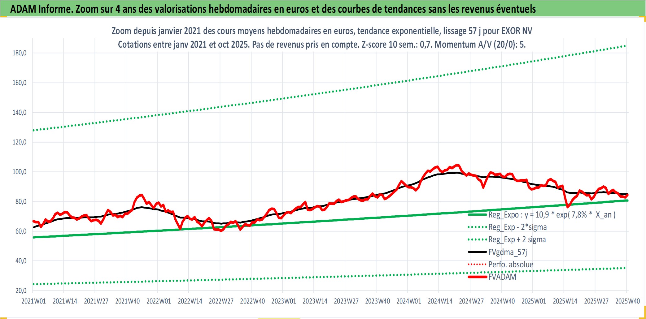 Site dédié aux investisseursPage dédiée sur site financeAnalyse des valorisations hebdomadaires de l'action EXOR NV. Cet actif est cote en EUR. Les valorisations couvrent les semaines 2000W01 a 2025W40. Les revenus de cet actif financier sont pris en compte depuis la semaine 2000W25. La note globale ESG de cet actif est estimee a 15.0 (apres rebasage entre 0 et 20).