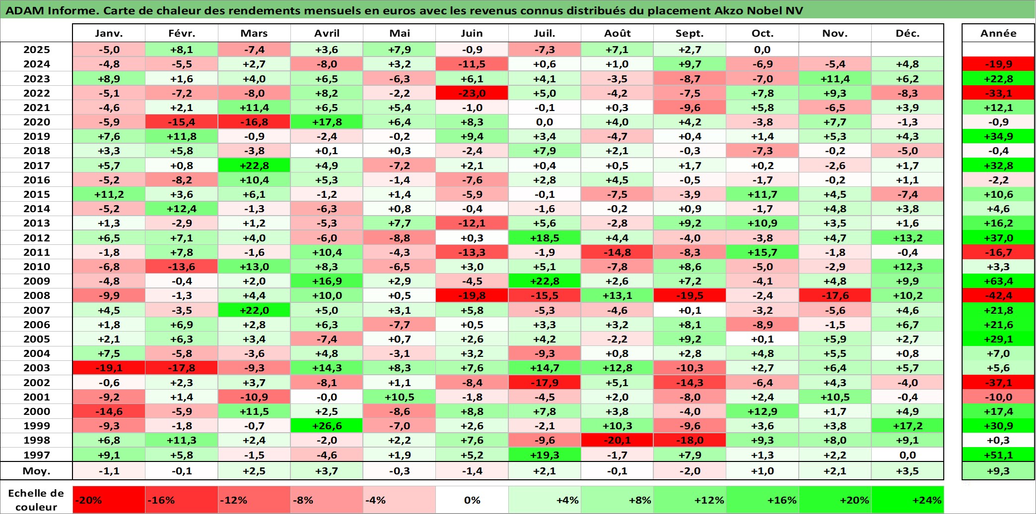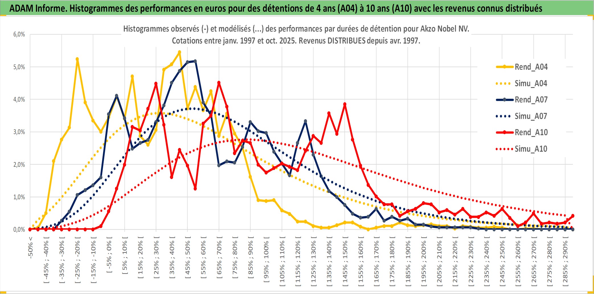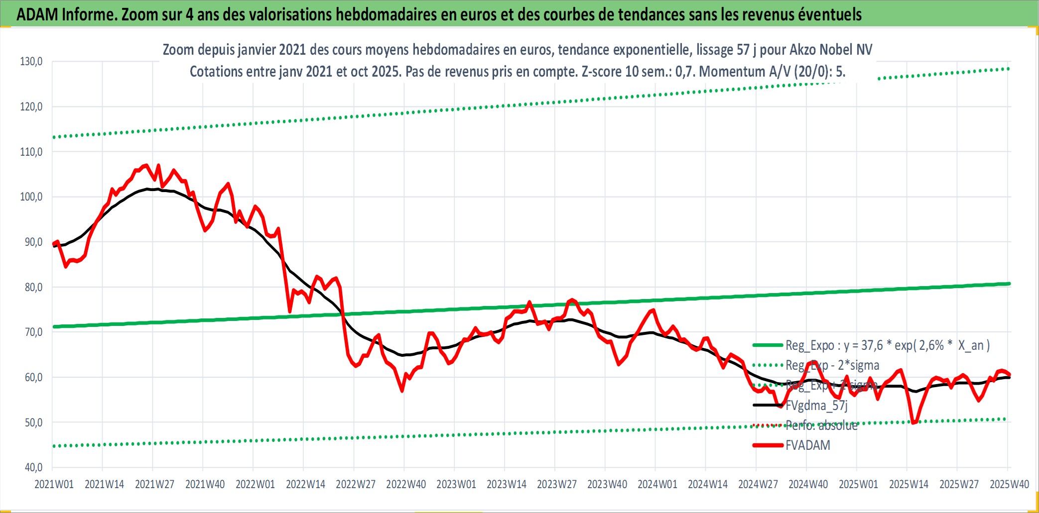 Site dédié aux investisseursPage dédiée sur site financeAnalyse des valorisations hebdomadaires de l'action Akzo Nobel NV. Cet actif est cote en EUR. Les valorisations couvrent les semaines 1997W01 a 2025W40. Les revenus de cet actif financier sont pris en compte depuis la semaine 1997W18. La note globale ESG de cet actif est estimee a 11.0 (apres rebasage entre 0 et 20).