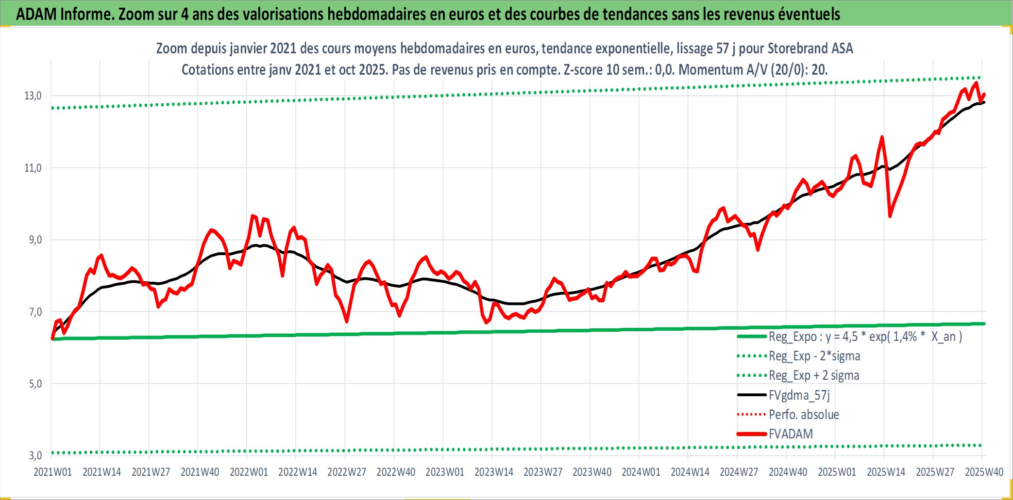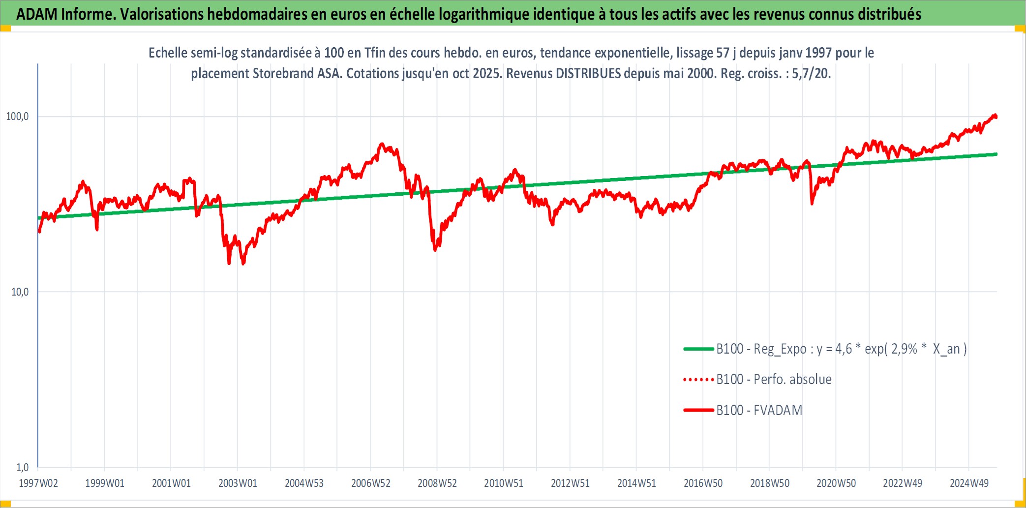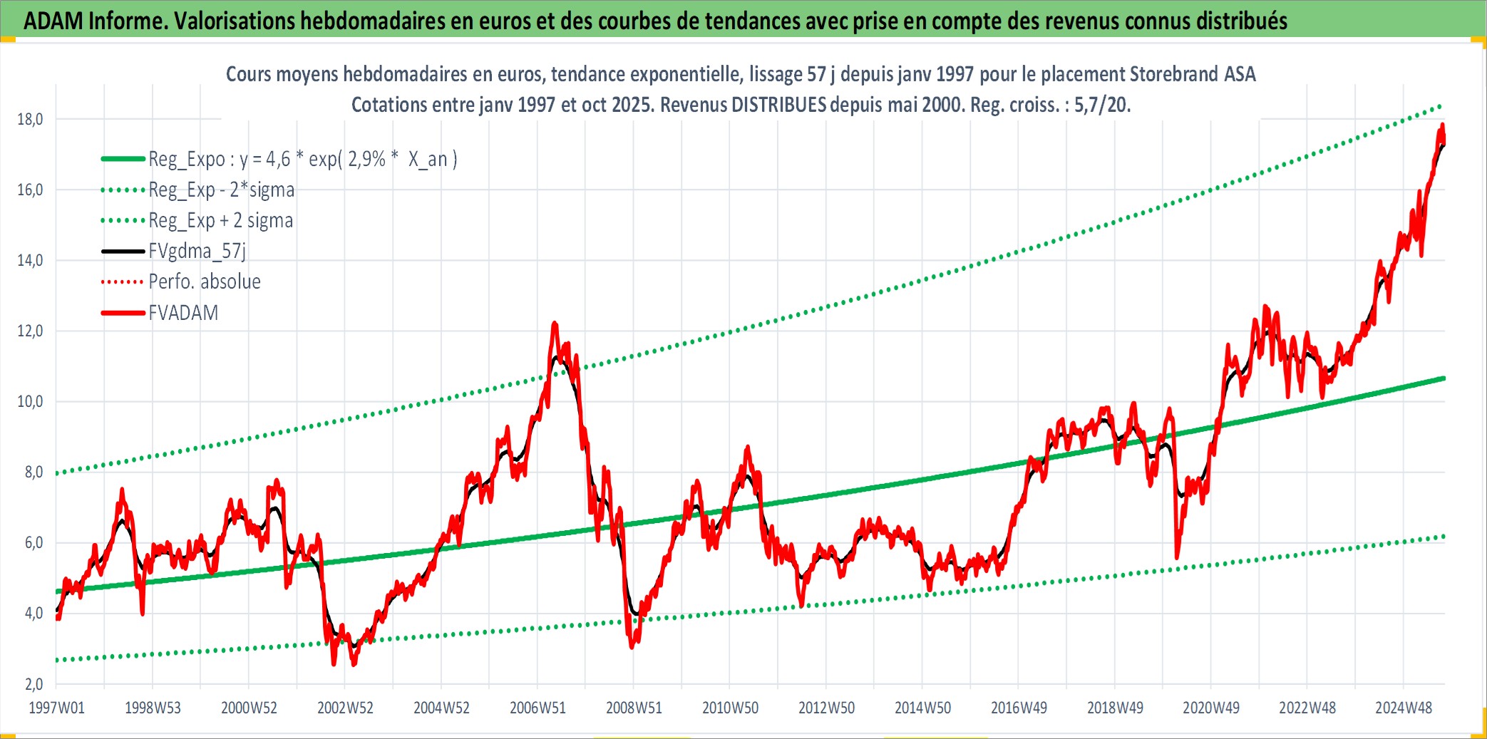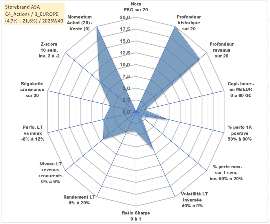 Site dédié aux investisseursPage dédiée sur site financeAnalyse des valorisations hebdomadaires de l'action Storebrand ASA. Cet actif est cote en NOK. Les valorisations sont en contrevaleur EURO et couvrent les semaines 1997W01 a 2025W40. Les revenus de cet actif financier sont pris en compte depuis la semaine 2000W18. La note ESG de cet actif n'est pas connue.