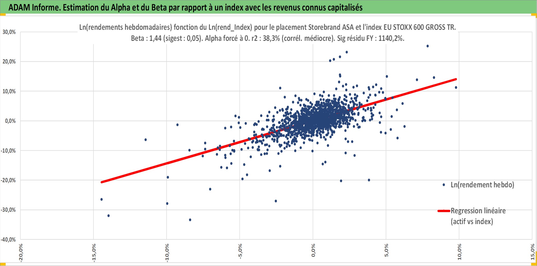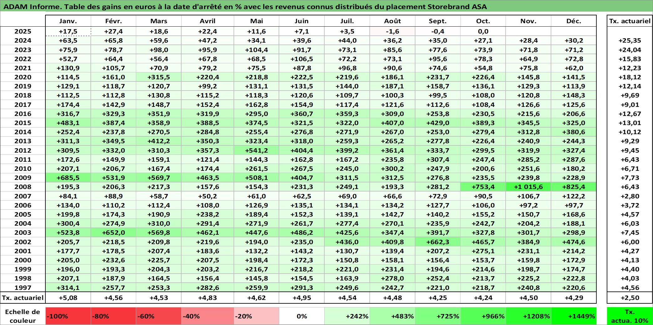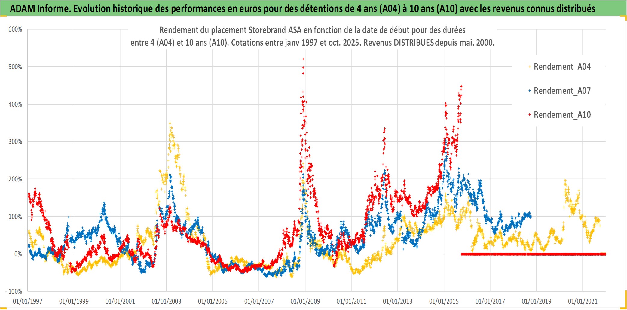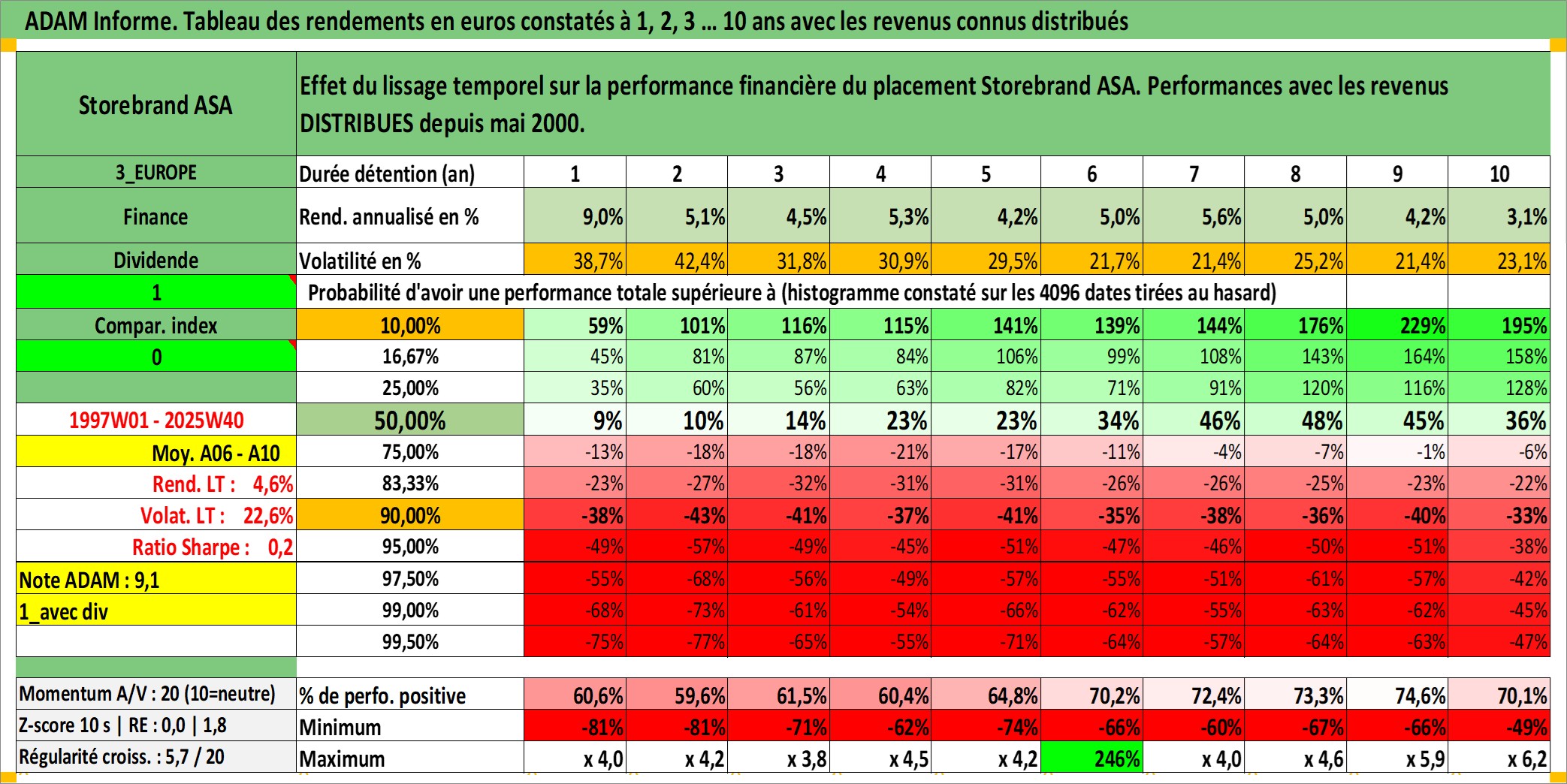 Site dédié aux investisseursPage dédiée sur site financeAnalyse des valorisations hebdomadaires de l'action Storebrand ASA. Cet actif est cote en NOK. Les valorisations sont en contrevaleur EURO et couvrent les semaines 1997W01 a 2025W40. Les revenus de cet actif financier sont pris en compte depuis la semaine 2000W18. La note ESG de cet actif n'est pas connue.