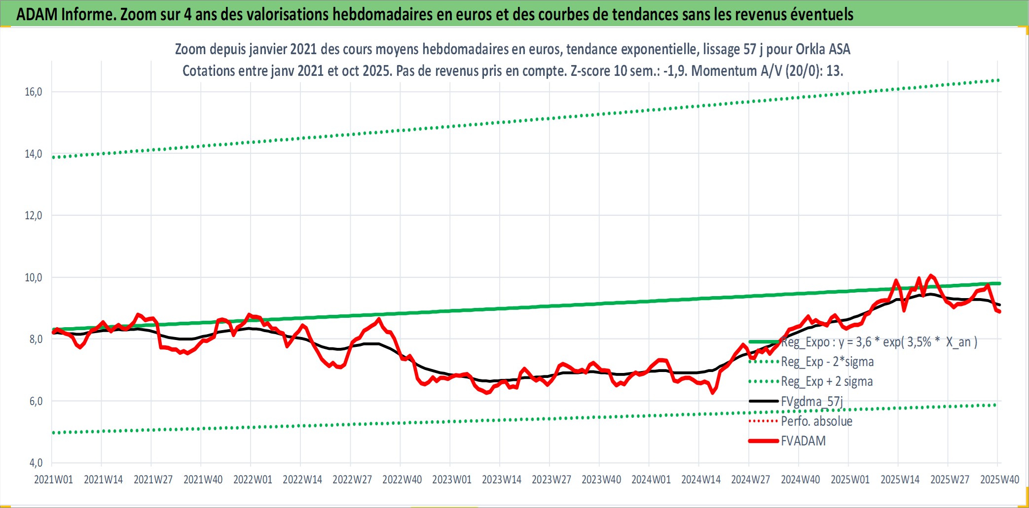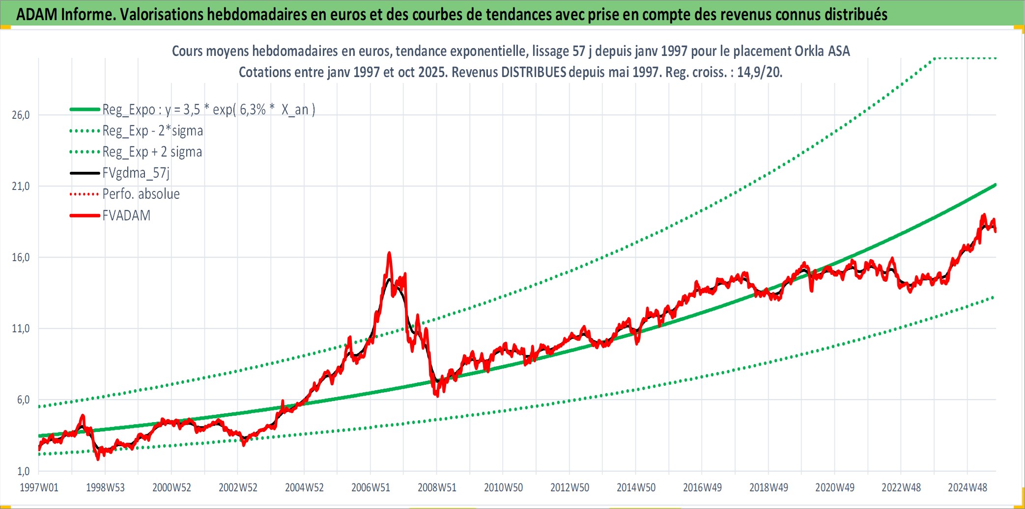 Site dédié aux investisseursPage dédiée sur site financeAnalyse des valorisations hebdomadaires de l'action Orkla ASA. Cet actif est cote en NOK. Les valorisations sont en contrevaleur EURO et couvrent les semaines 1997W01 a 2025W40. Les revenus de cet actif financier sont pris en compte depuis la semaine 1997W19. La note globale ESG de cet actif est estimee a 11.0 (apres rebasage entre 0 et 20).