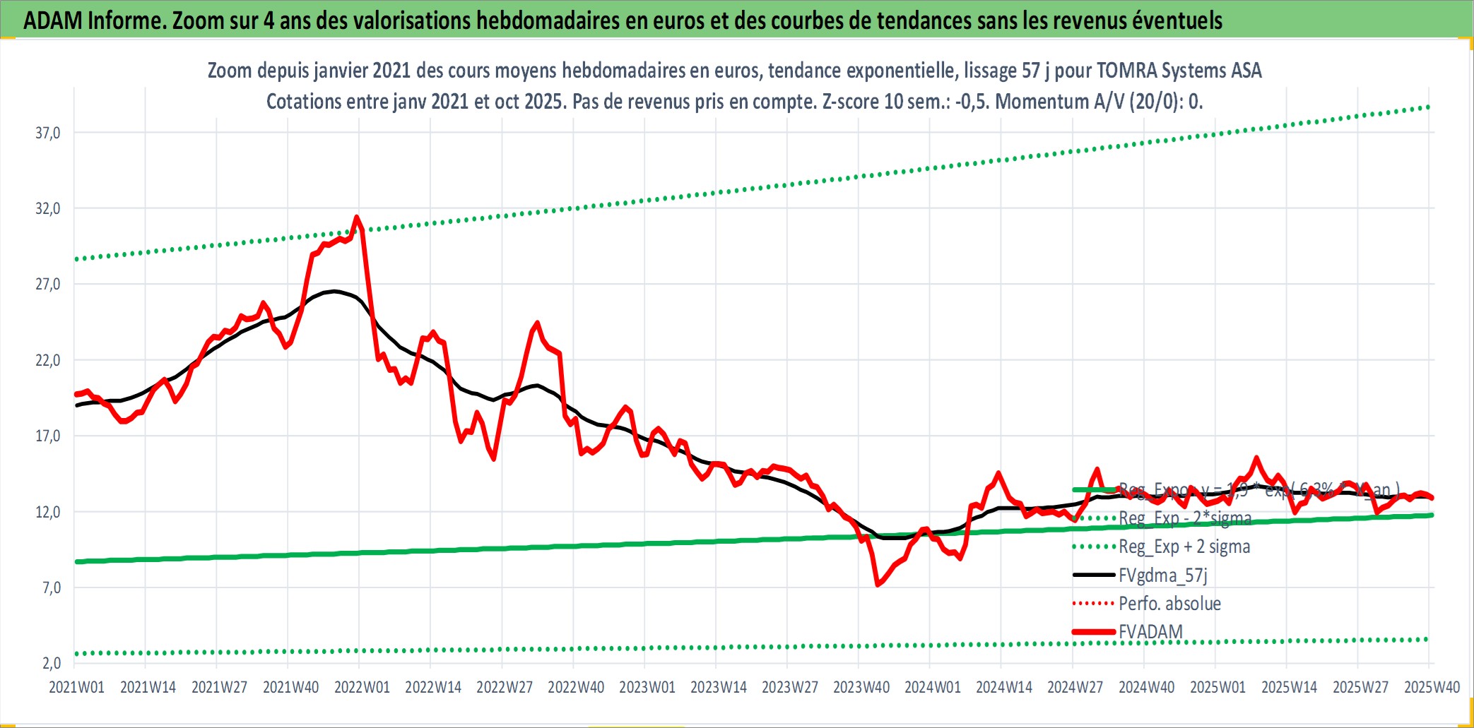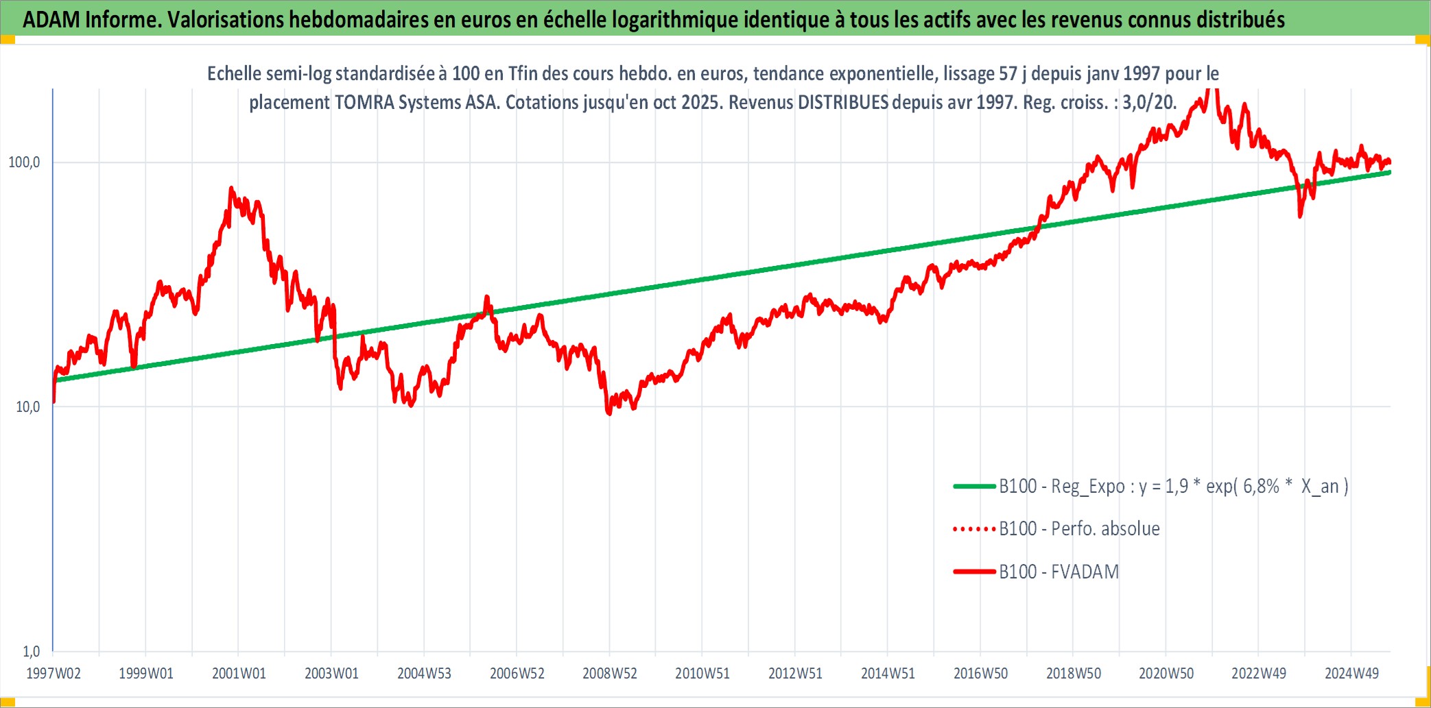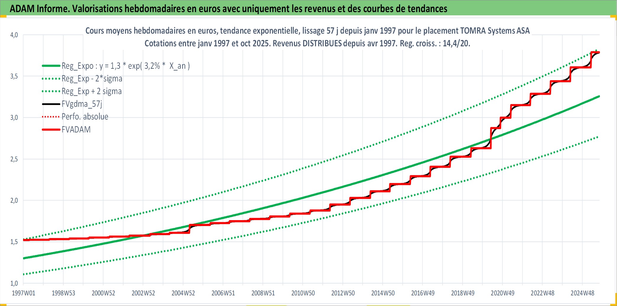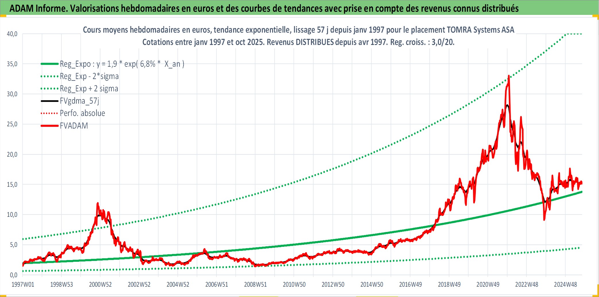Site dédié aux investisseursPage dédiée sur site financeAnalyse des valorisations hebdomadaires de l'action TOMRA Systems ASA. Cet actif est cote en NOK. Les valorisations sont en contrevaleur EURO et couvrent les semaines 1997W01 a 2025W40. Les revenus de cet actif financier sont pris en compte depuis la semaine 1997W16. La note ESG de cet actif n'est pas connue.