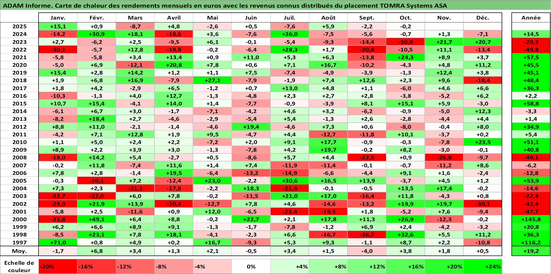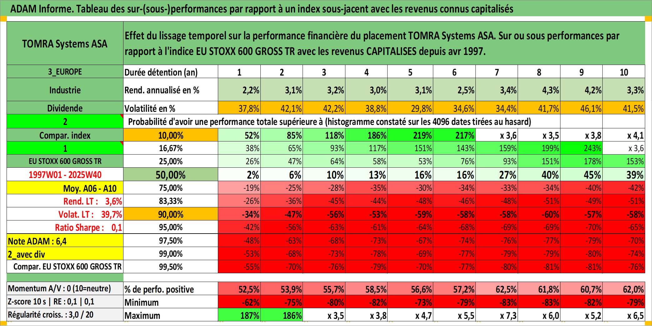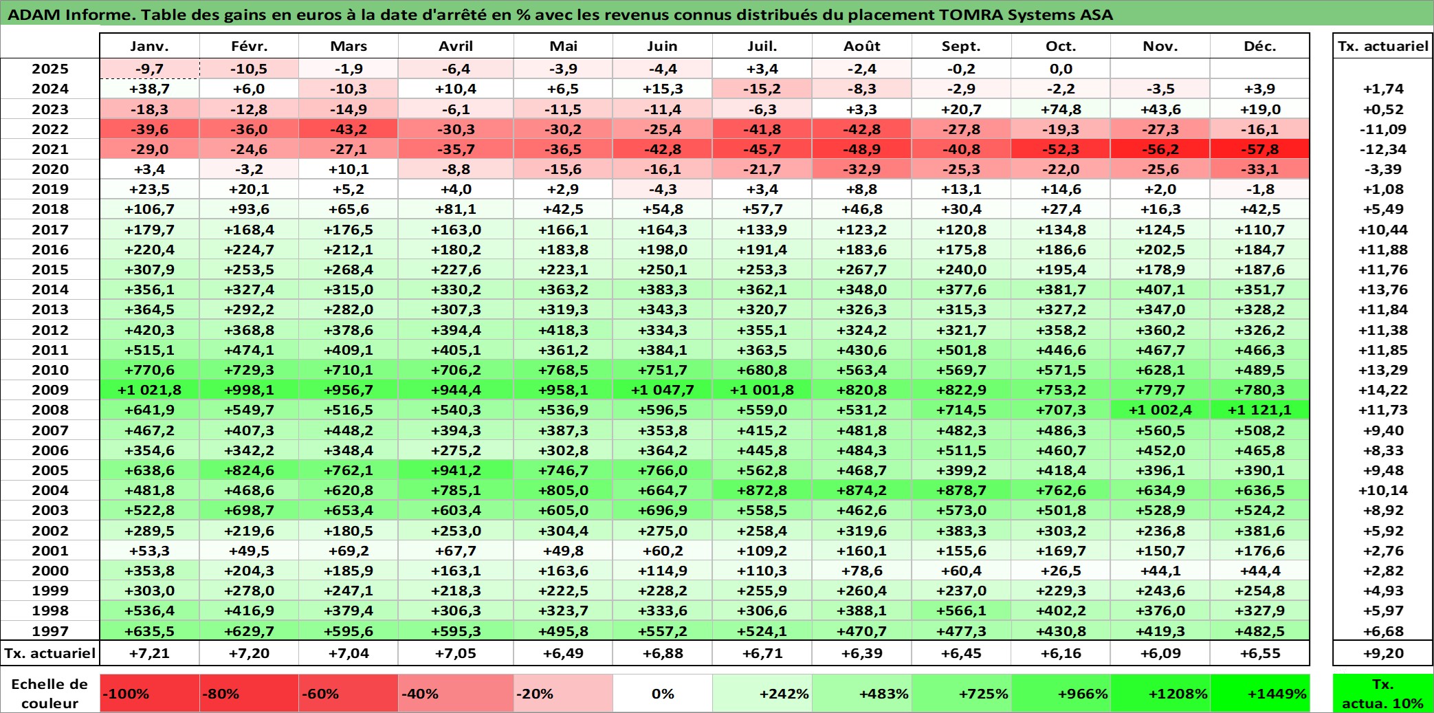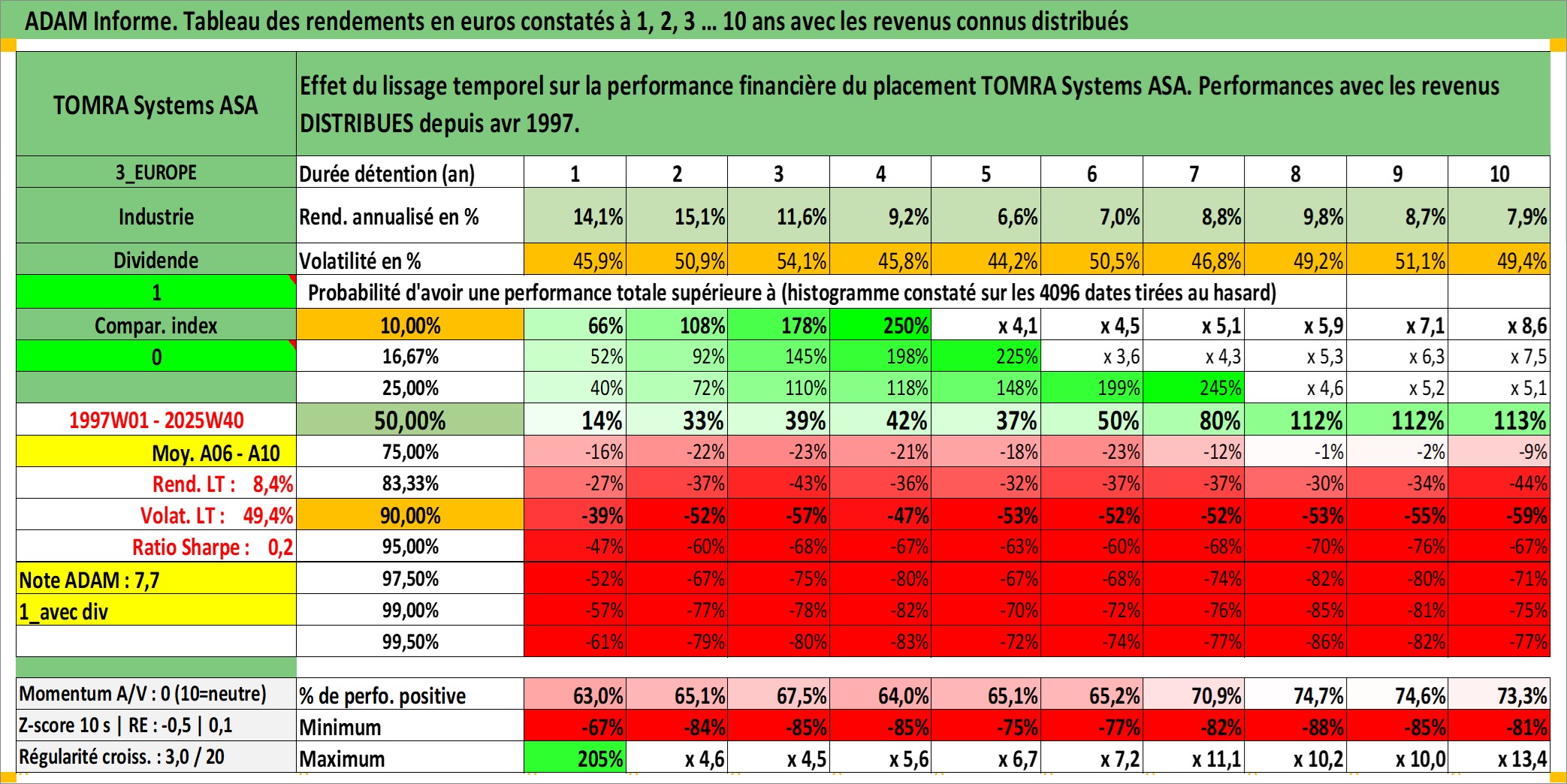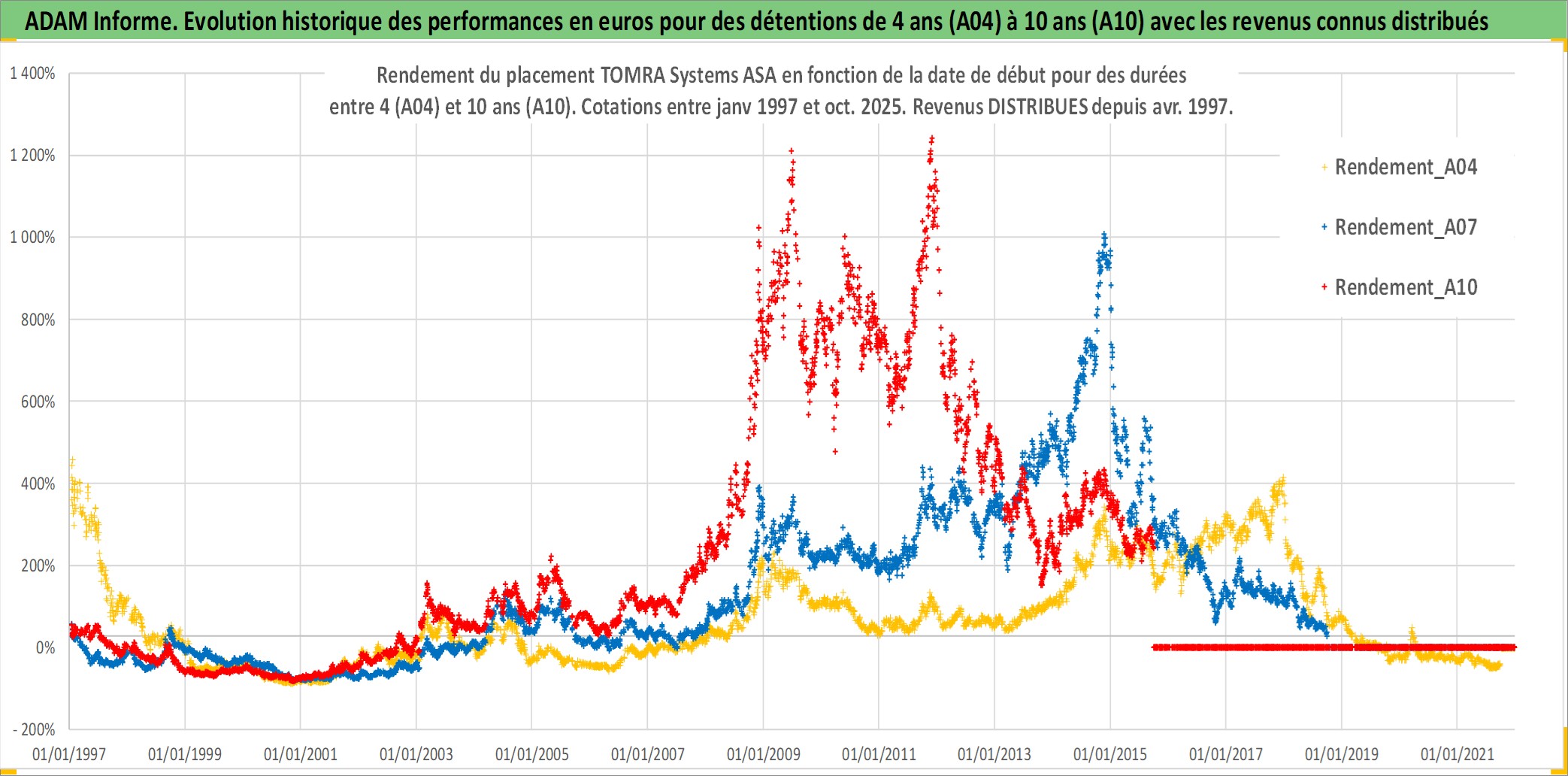 Site dédié aux investisseursPage dédiée sur site financeAnalyse des valorisations hebdomadaires de l'action TOMRA Systems ASA. Cet actif est cote en NOK. Les valorisations sont en contrevaleur EURO et couvrent les semaines 1997W01 a 2025W40. Les revenus de cet actif financier sont pris en compte depuis la semaine 1997W16. La note ESG de cet actif n'est pas connue.