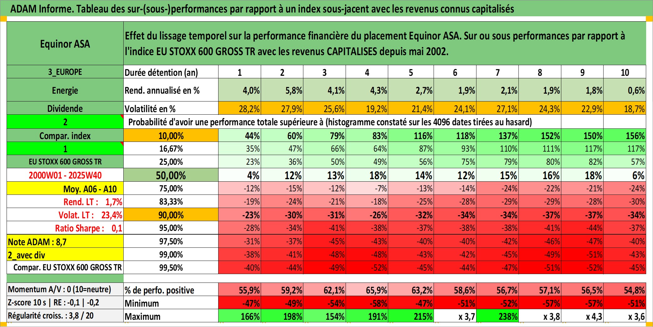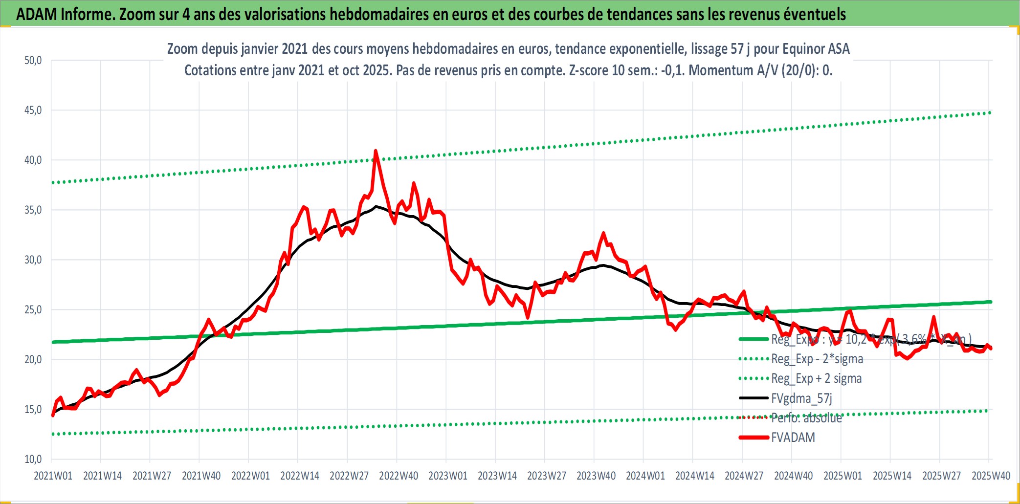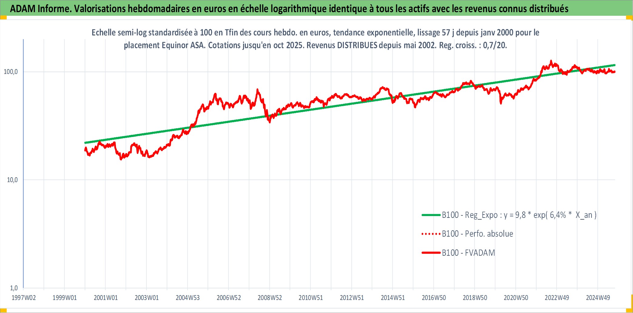 Site dédié aux investisseursPage dédiée sur site financeAnalyse des valorisations hebdomadaires de l'action Equinor ASA. Cet actif est cote en NOK. Les valorisations sont en contrevaleur EURO et couvrent les semaines 2000W01 a 2025W40. Les revenus de cet actif financier sont pris en compte depuis la semaine 2002W19. La note globale ESG de cet actif est estimee a 4.0 (apres rebasage entre 0 et 20).