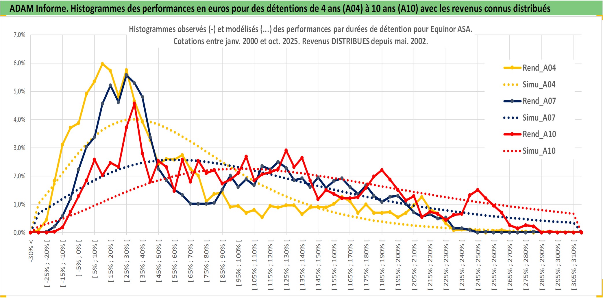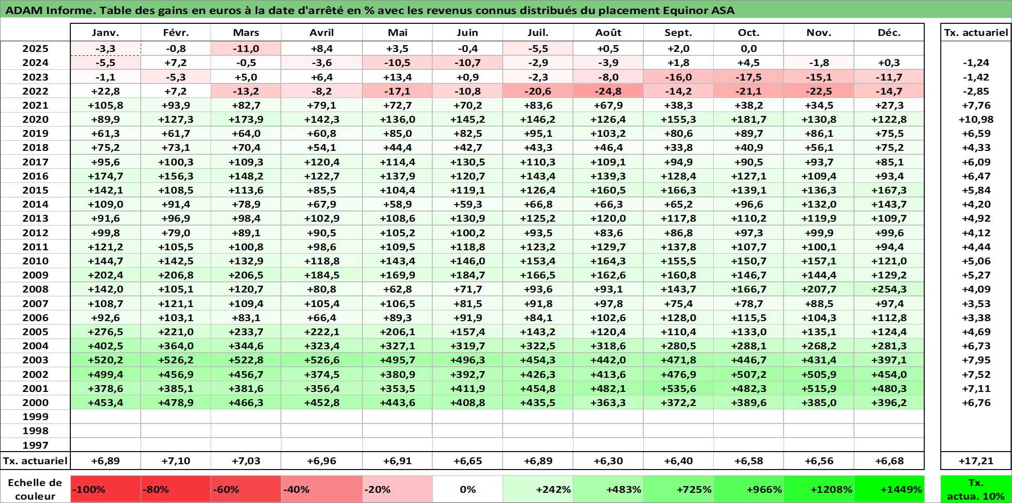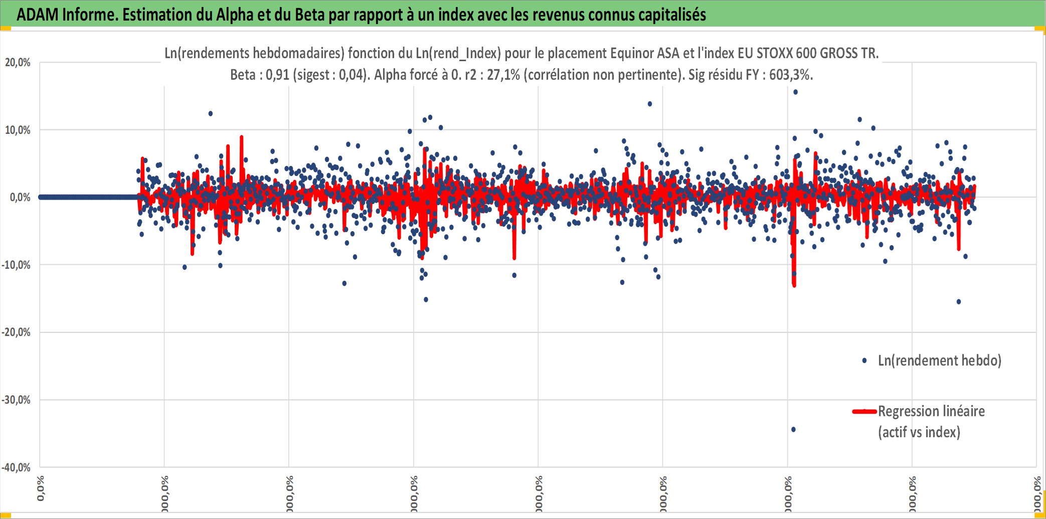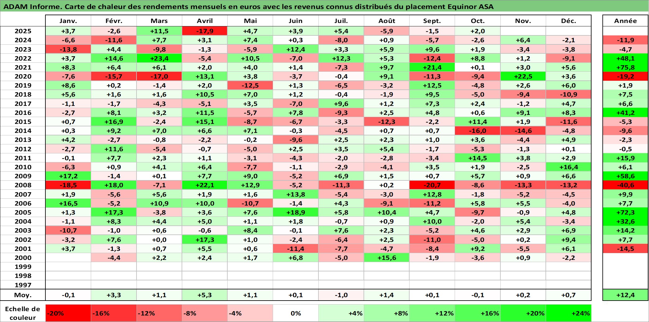Site dédié aux investisseursPage dédiée sur site financeAnalyse des valorisations hebdomadaires de l'action Equinor ASA. Cet actif est cote en NOK. Les valorisations sont en contrevaleur EURO et couvrent les semaines 2000W01 a 2025W40. Les revenus de cet actif financier sont pris en compte depuis la semaine 2002W19. La note globale ESG de cet actif est estimee a 4.0 (apres rebasage entre 0 et 20).