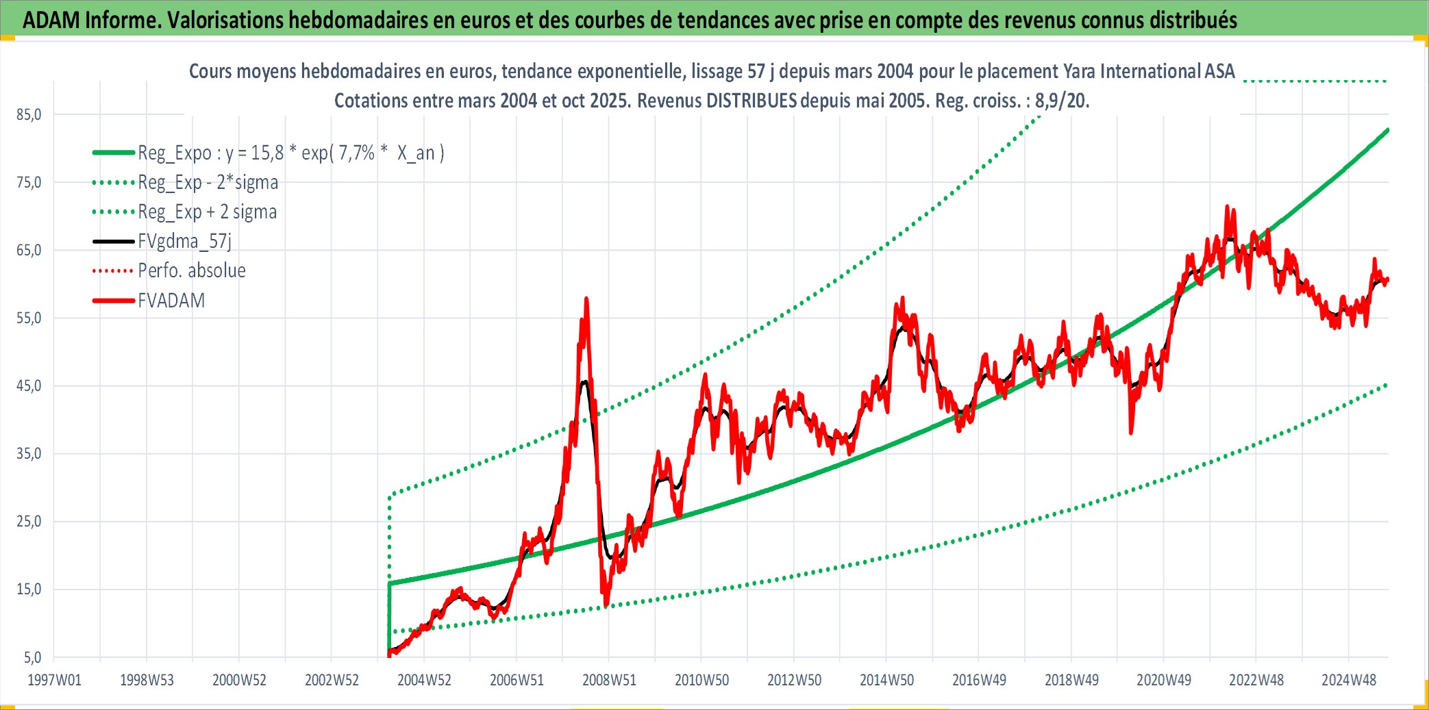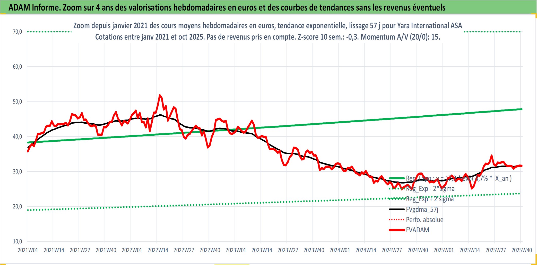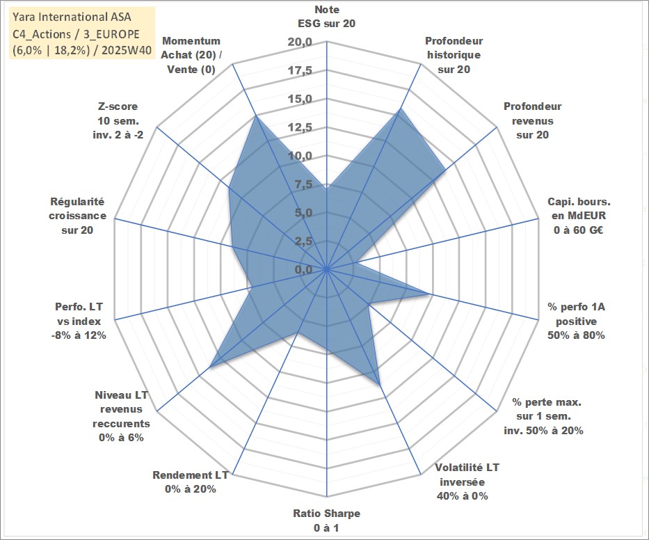 Site dédié aux investisseursPage dédiée sur site financeAnalyse des valorisations hebdomadaires de l'action Yara International ASA. Cet actif est cote en NOK. Les valorisations sont en contrevaleur EURO et couvrent les semaines 2004W13 a 2025W40. Les revenus de cet actif financier sont pris en compte depuis la semaine 2005W20. La note globale ESG de cet actif est estimee a 7.0 (apres rebasage entre 0 et 20).