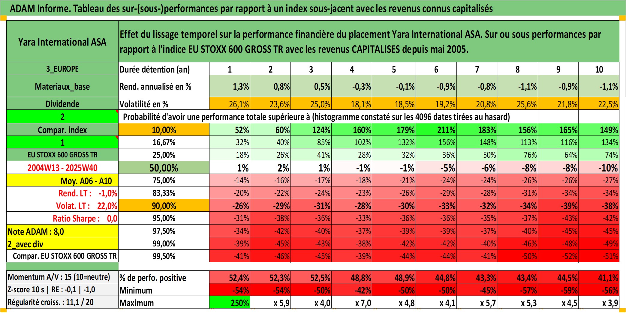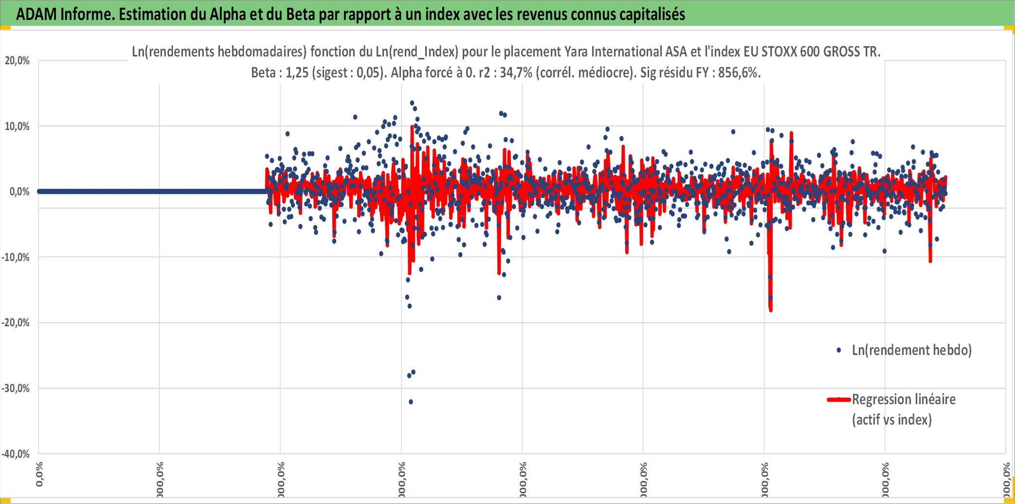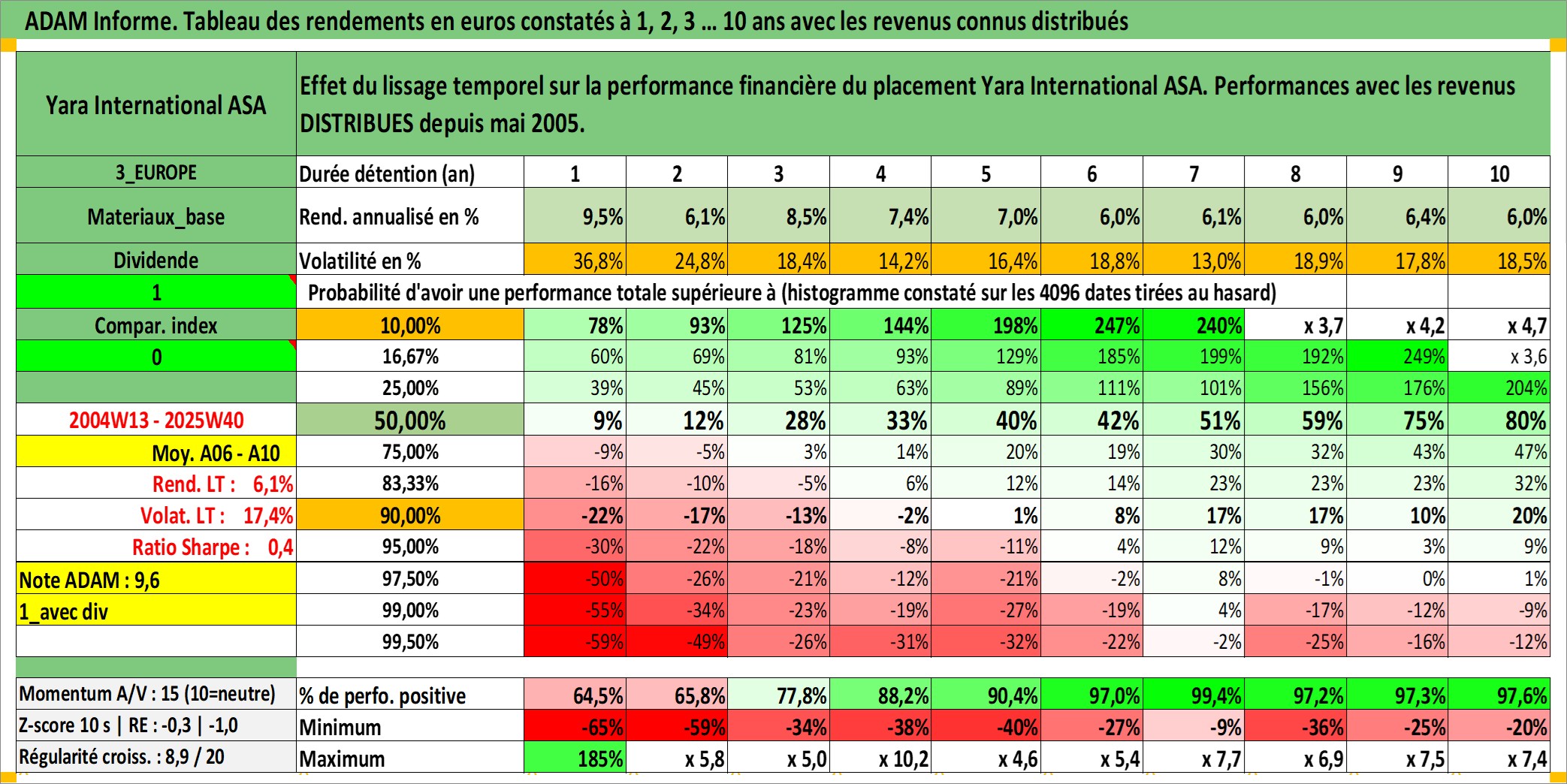 Site dédié aux investisseursPage dédiée sur site financeAnalyse des valorisations hebdomadaires de l'action Yara International ASA. Cet actif est cote en NOK. Les valorisations sont en contrevaleur EURO et couvrent les semaines 2004W13 a 2025W40. Les revenus de cet actif financier sont pris en compte depuis la semaine 2005W20. La note globale ESG de cet actif est estimee a 7.0 (apres rebasage entre 0 et 20).