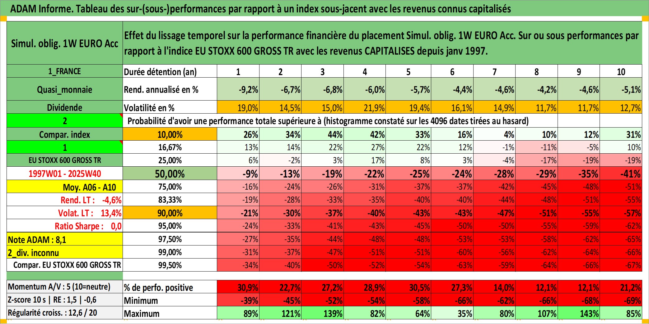 Site dédié aux investisseursPage dédiée sur site financeAnalyse des valorisations hebdomadaires de l'action Simul. oblig. 1W EURO Acc. Cet actif est cote en EUR. Les valorisations couvrent les semaines 1997W01 a 2025W40. Les revenus de cet actif financier sont pris en compte depuis la semaine 1997W01. La note ESG de cet actif n'est pas connue.