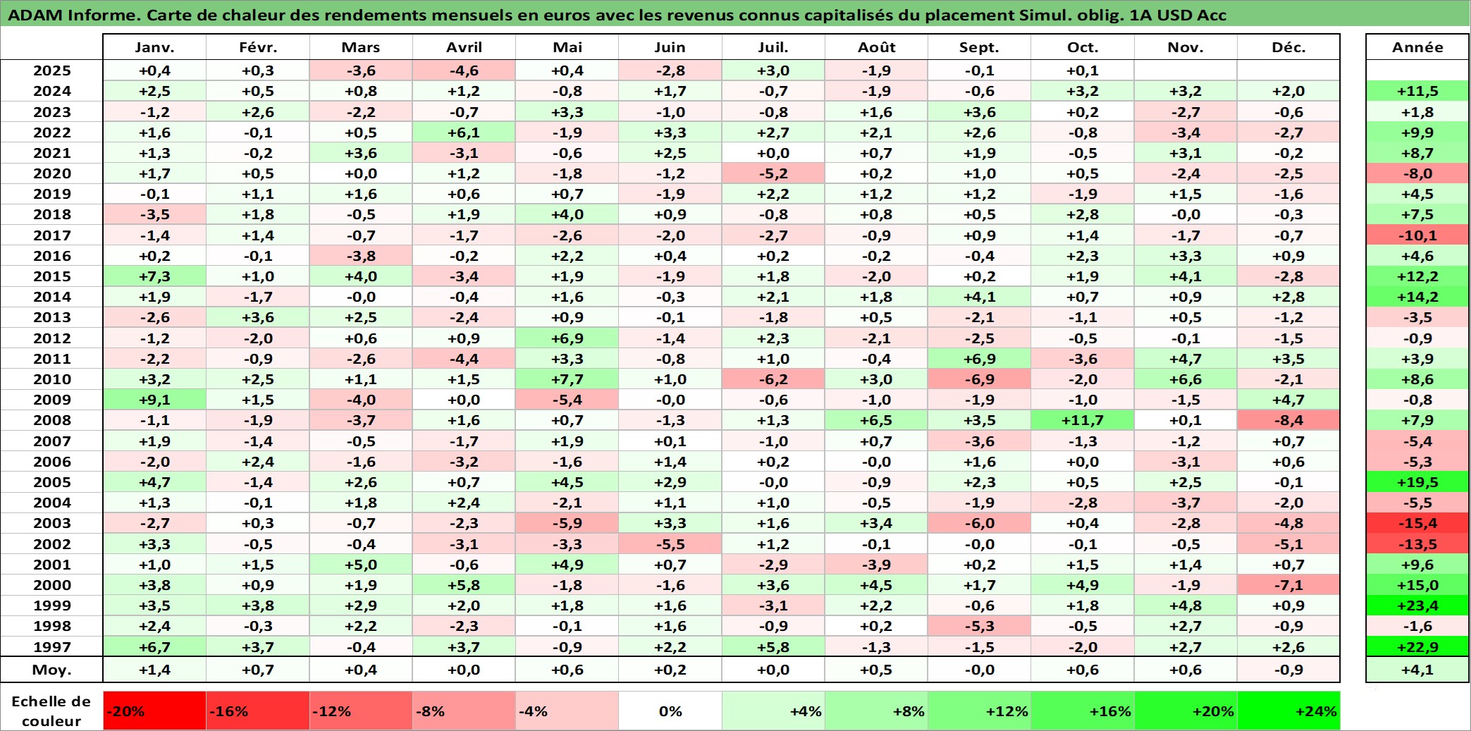 Site dédié aux investisseursPage dédiée sur site financeAnalyse des valorisations hebdomadaires de l'action Simul. oblig. 1A USD Acc. Cet actif est cote en USD. Les valorisations sont en contrevaleur EURO et couvrent les semaines 1997W01 a 2025W40. Les revenus de cet actif financier sont pris en compte depuis la semaine 1997W01. La note ESG de cet actif n'est pas connue.