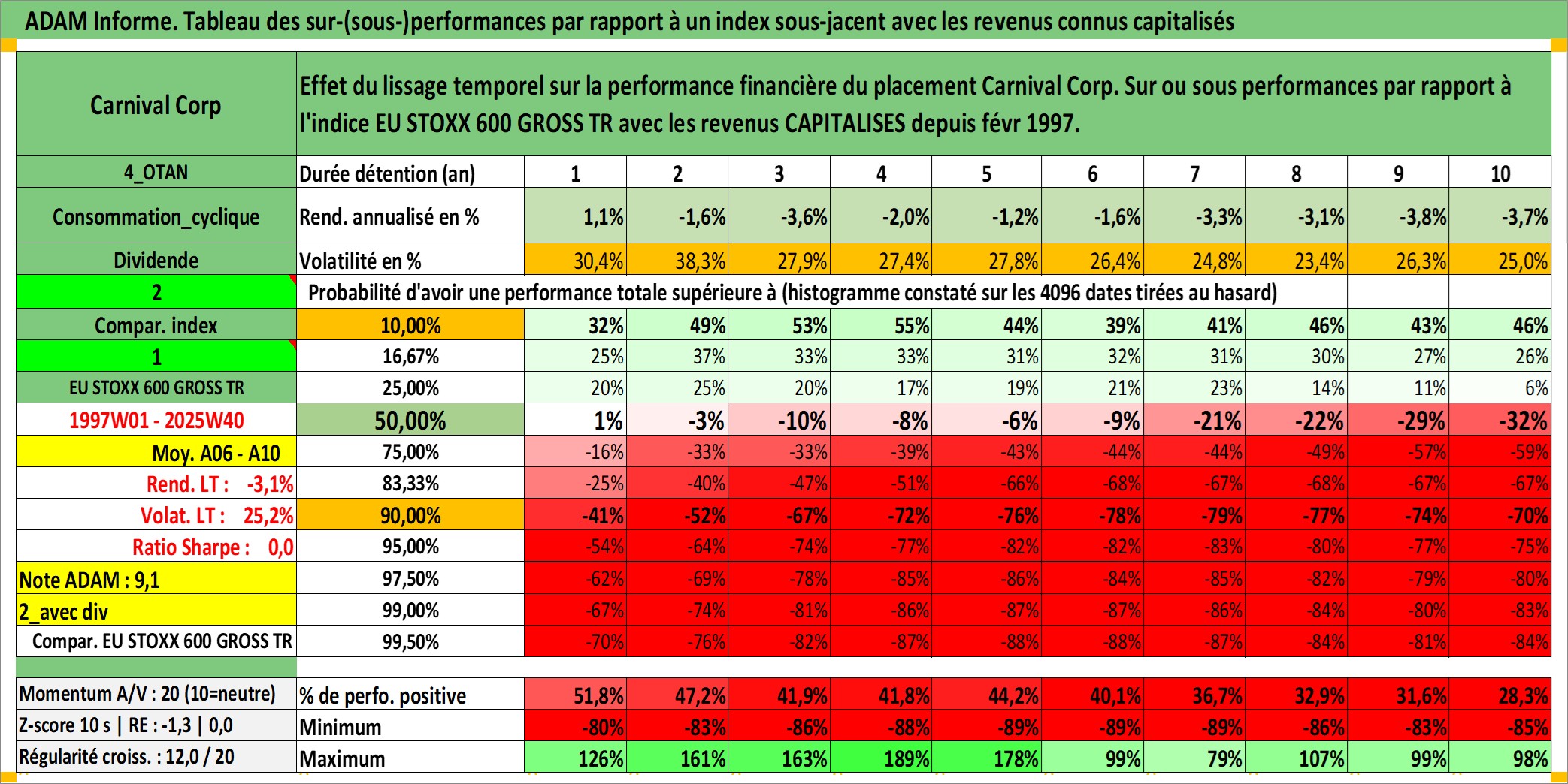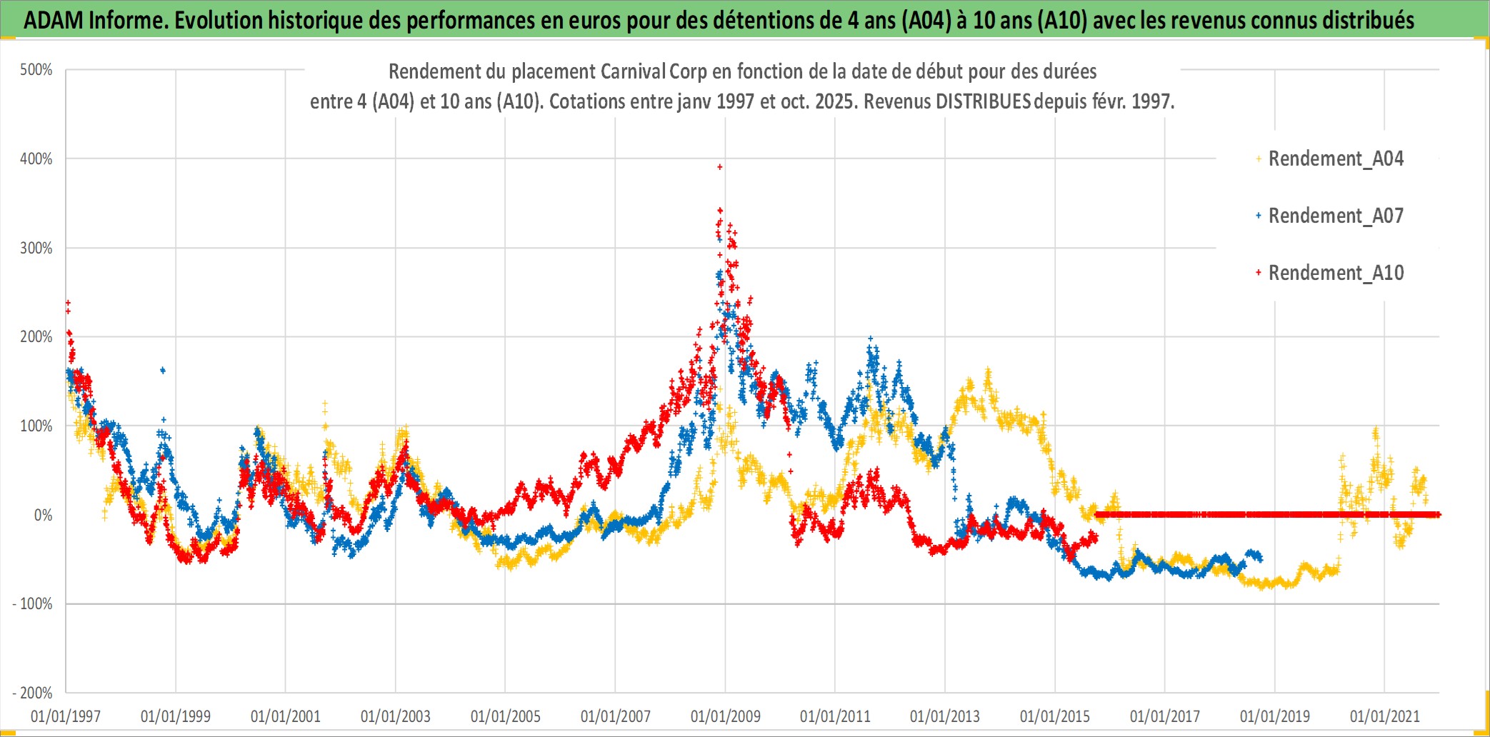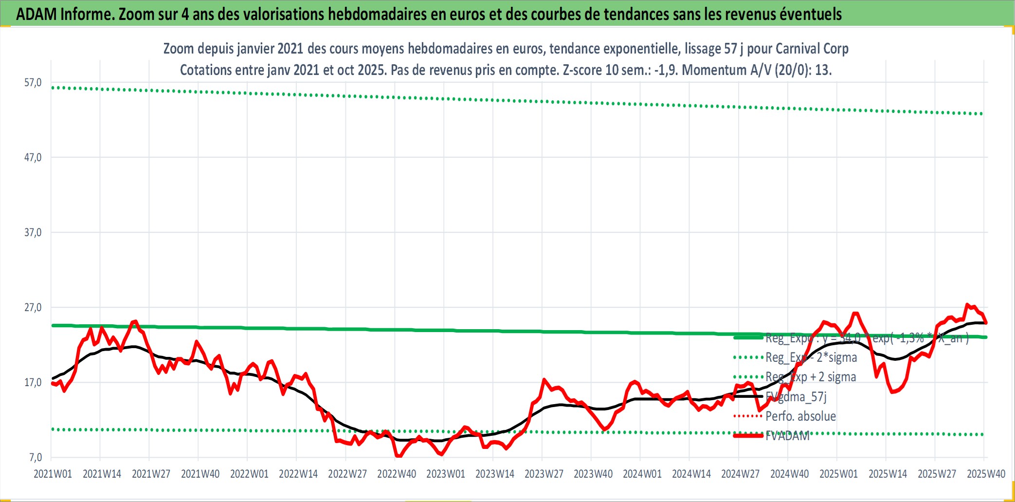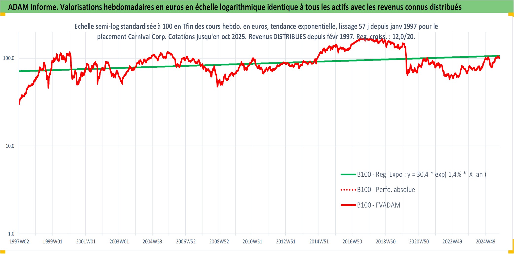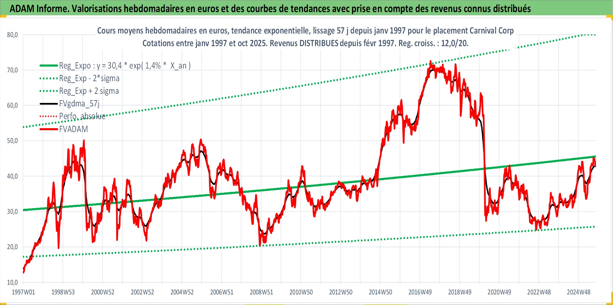 Site dédié aux investisseursPage dédiée sur site financeAnalyse des valorisations hebdomadaires de l'action Carnival Corp. Cet actif est cote en USD. Les valorisations sont en contrevaleur EURO et couvrent les semaines 1997W01 a 2025W40. Les revenus de cet actif financier sont pris en compte depuis la semaine 1997W09. La note globale ESG de cet actif est estimee a 8.0 (apres rebasage entre 0 et 20).