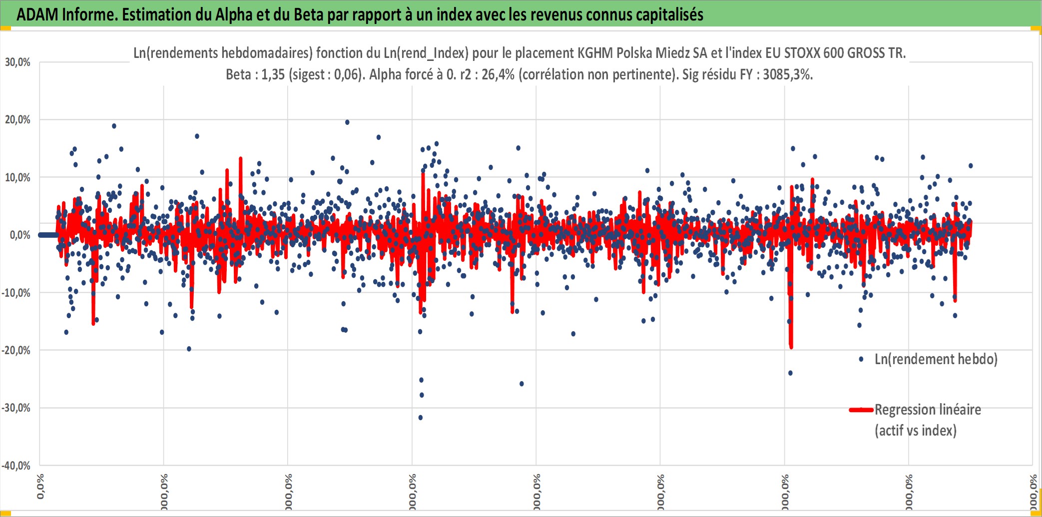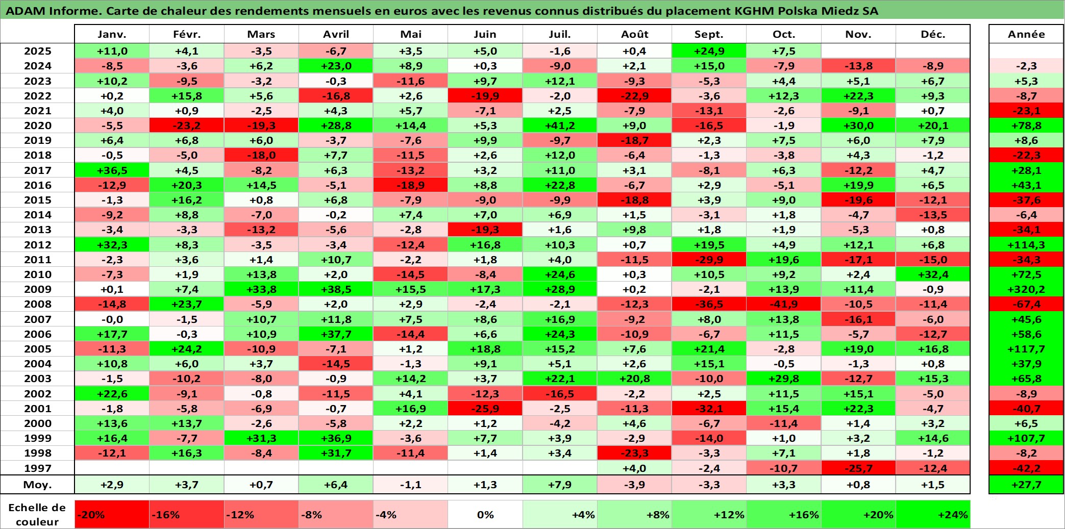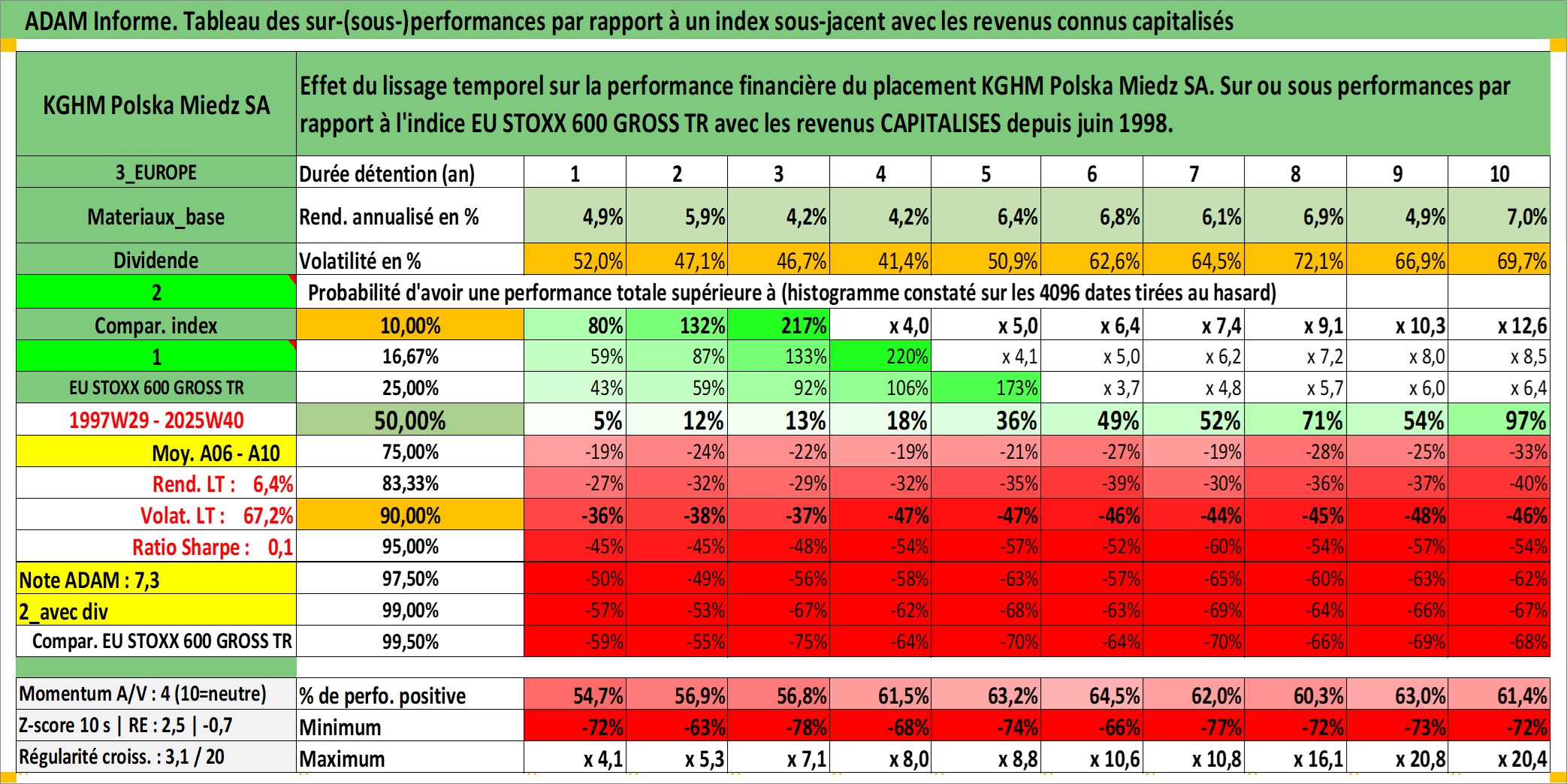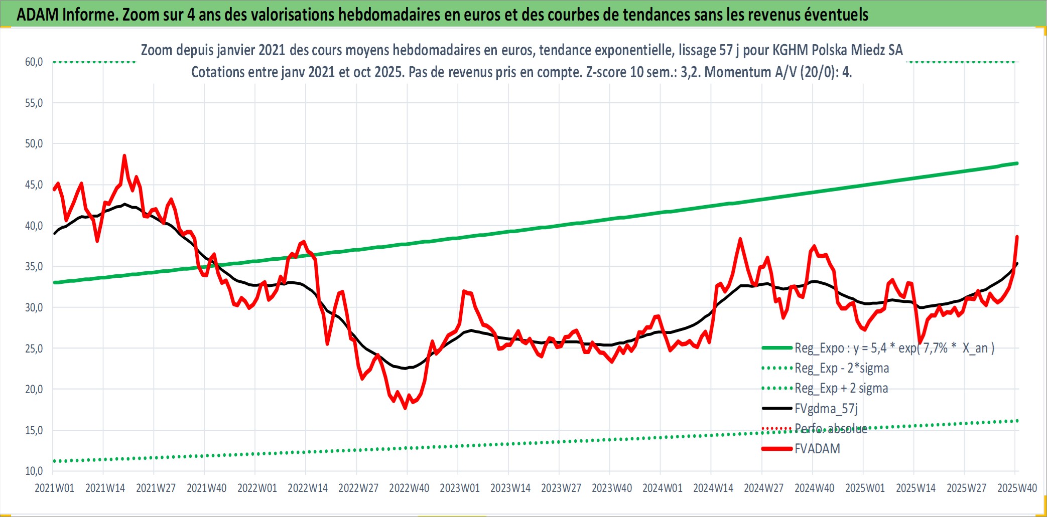 Site dédié aux investisseursPage dédiée sur site financeAnalyse des valorisations hebdomadaires de l'action KGHM Polska Miedz SA. Cet actif est cote en PLN. Les valorisations sont en contrevaleur EURO et couvrent les semaines 1997W29 a 2025W40. Les revenus de cet actif financier sont pris en compte depuis la semaine 1998W26. La note globale ESG de cet actif est estimee a 3.0 (apres rebasage entre 0 et 20).