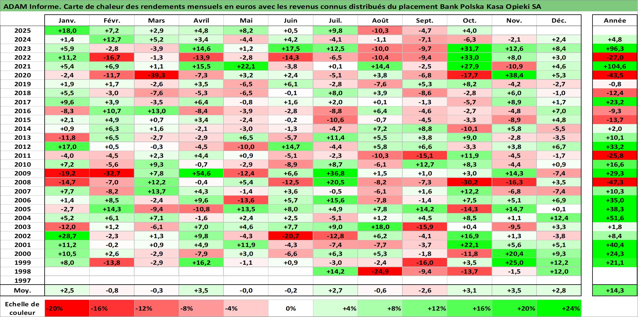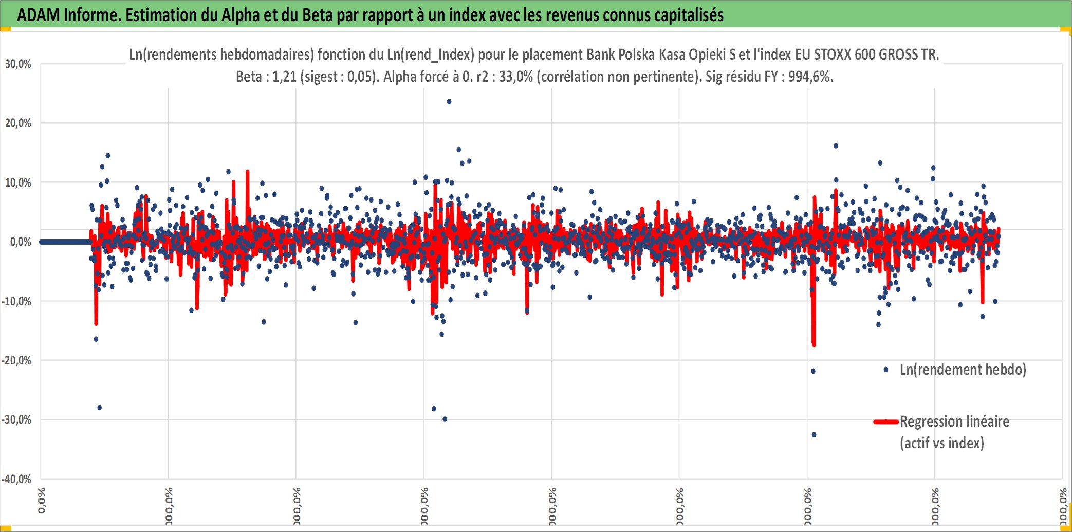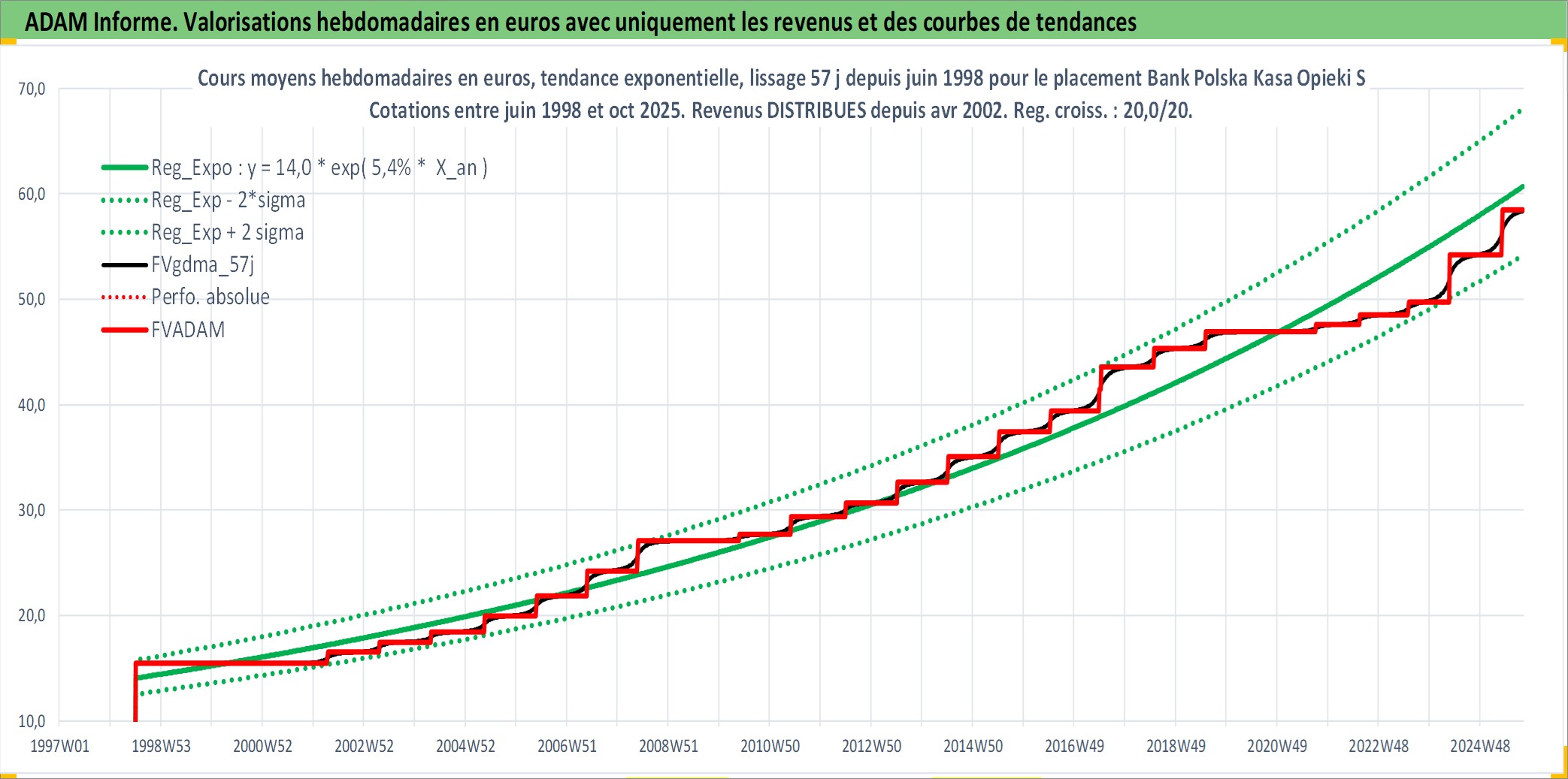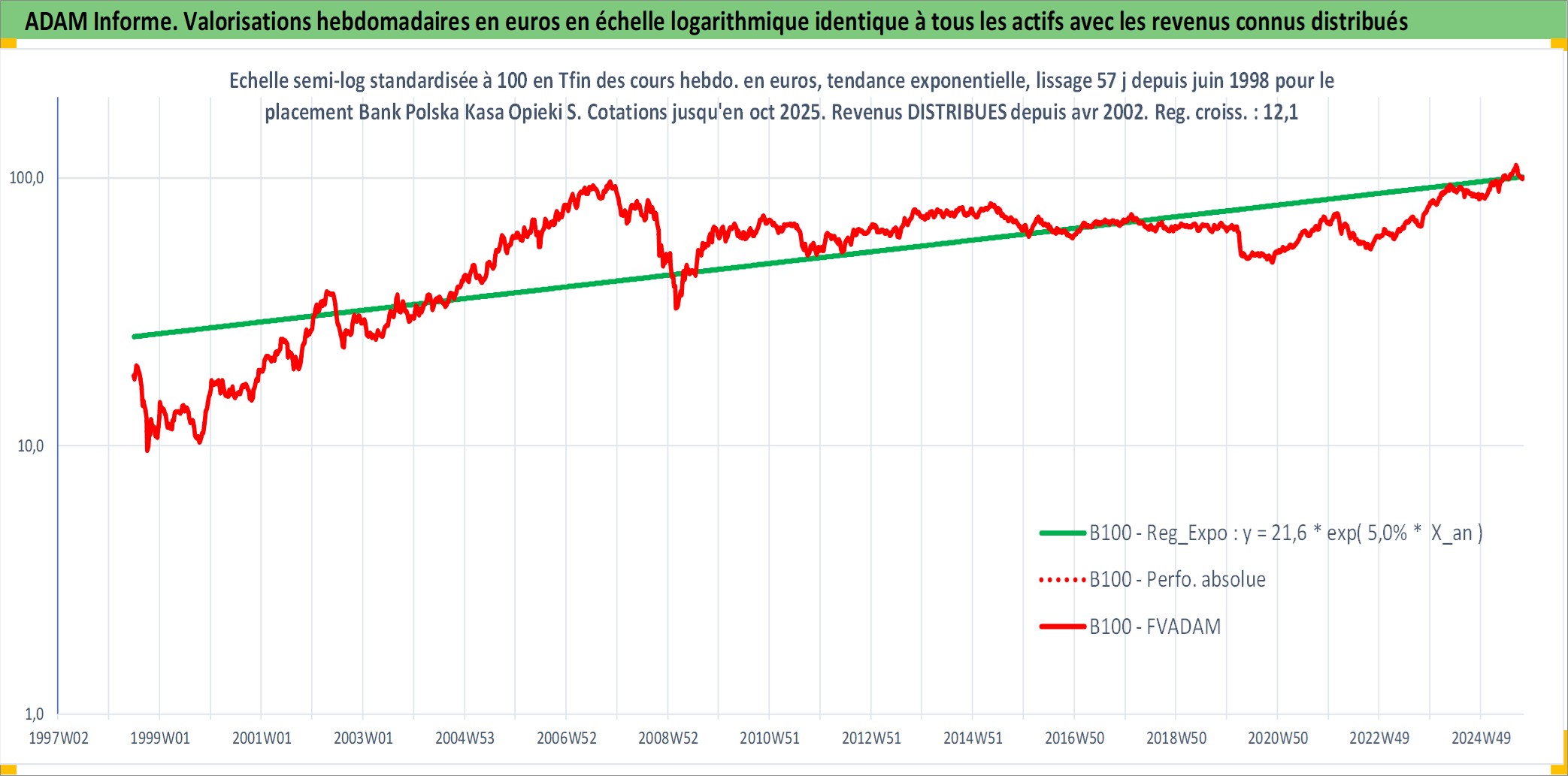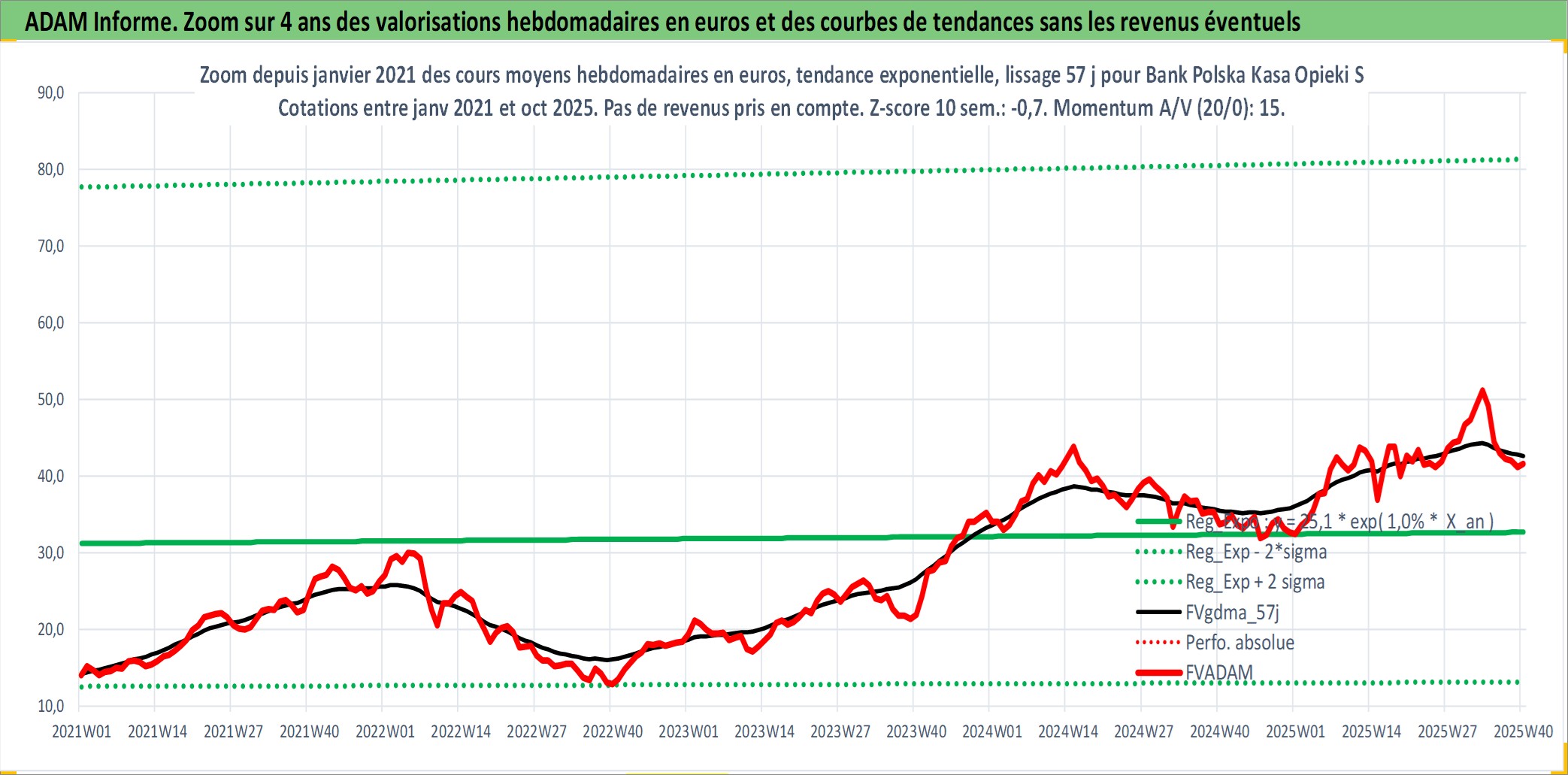 Site dédié aux investisseursPage dédiée sur site financeAnalyse des valorisations hebdomadaires de l'action Bank Polska Kasa Opieki SA. Cet actif est cote en PLN. Les valorisations sont en contrevaleur EURO et couvrent les semaines 1998W27 a 2025W40. Les revenus de cet actif financier sont pris en compte depuis la semaine 2002W15. La note globale ESG de cet actif est estimee a 7.0 (apres rebasage entre 0 et 20).