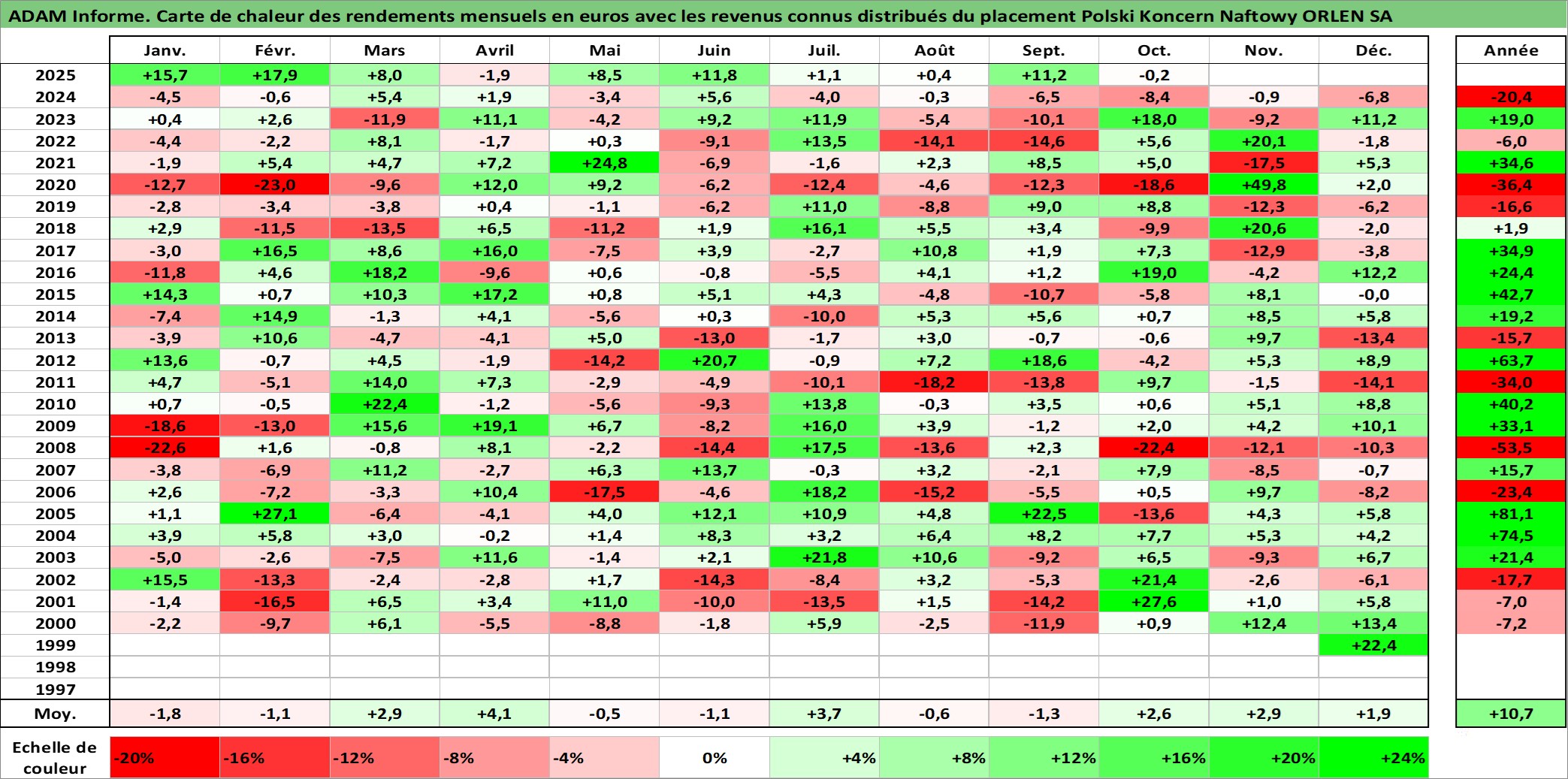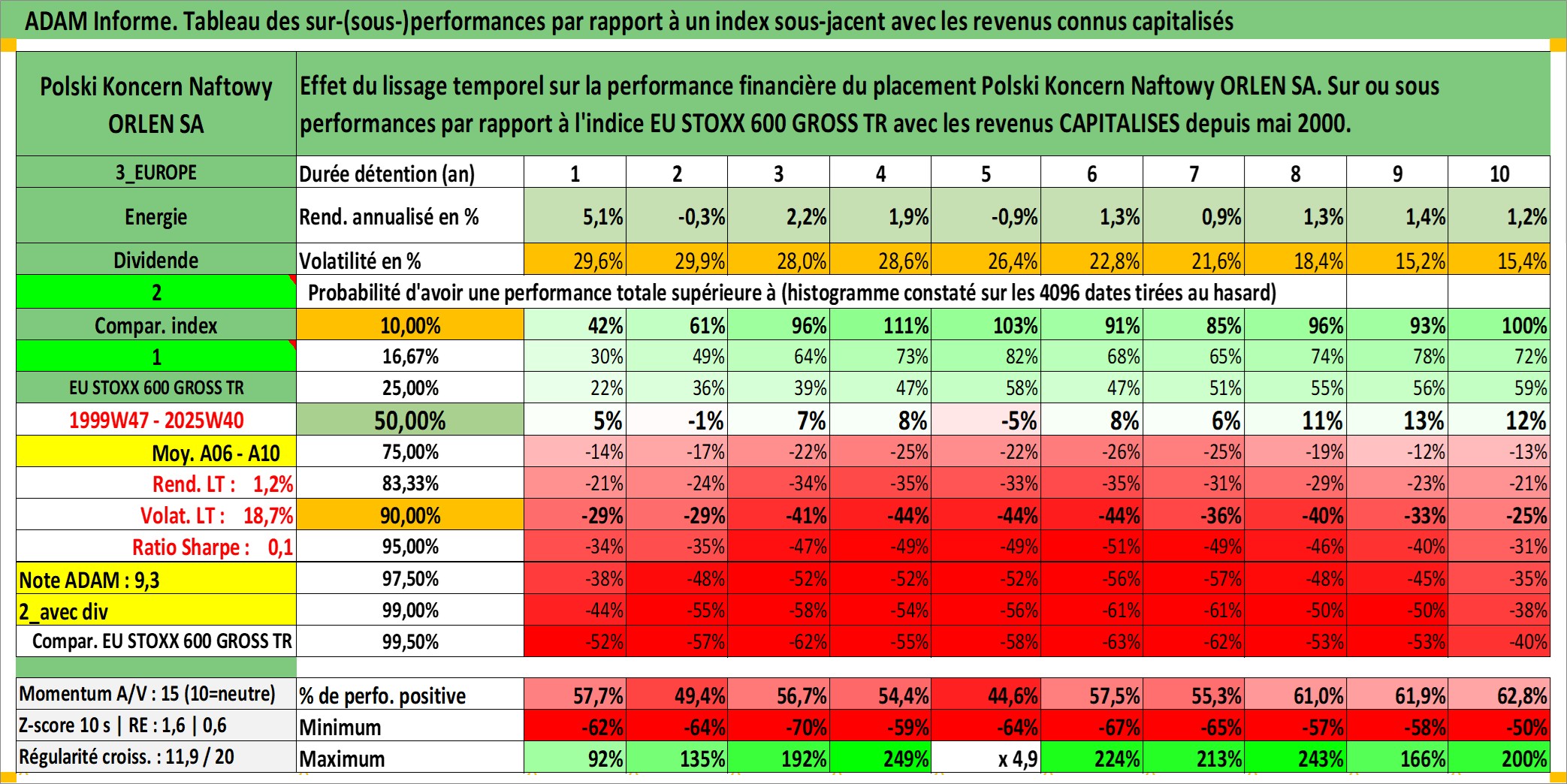 Site dédié aux investisseursPage dédiée sur site financeAnalyse des valorisations hebdomadaires de l'action Polski Koncern Naftowy ORLEN SA. Cet actif est cote en PLN. Les valorisations sont en contrevaleur EURO et couvrent les semaines 1999W47 a 2025W40. Les revenus de cet actif financier sont pris en compte depuis la semaine 2000W22. La note globale ESG de cet actif est estimee a 7.0 (apres rebasage entre 0 et 20).