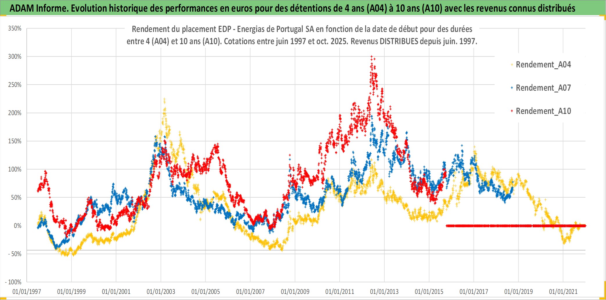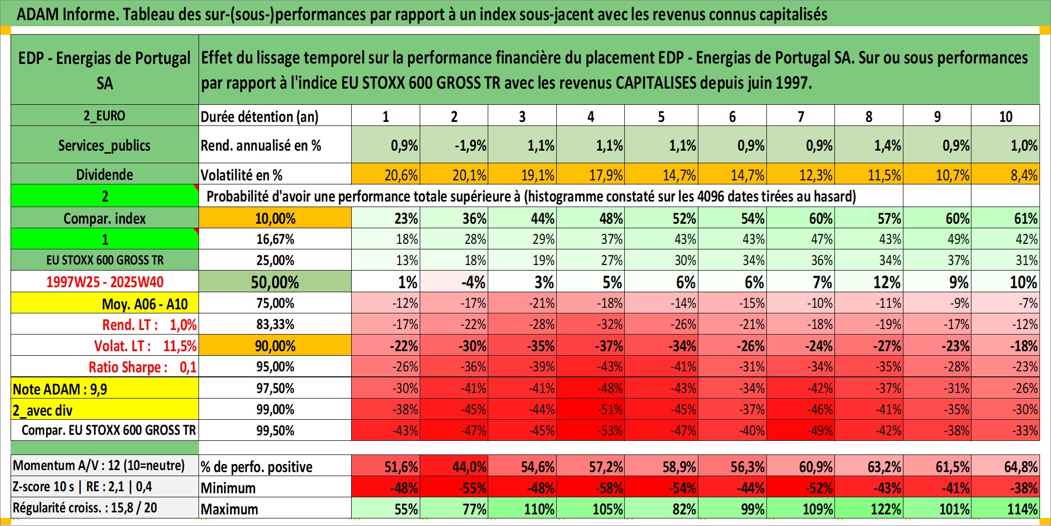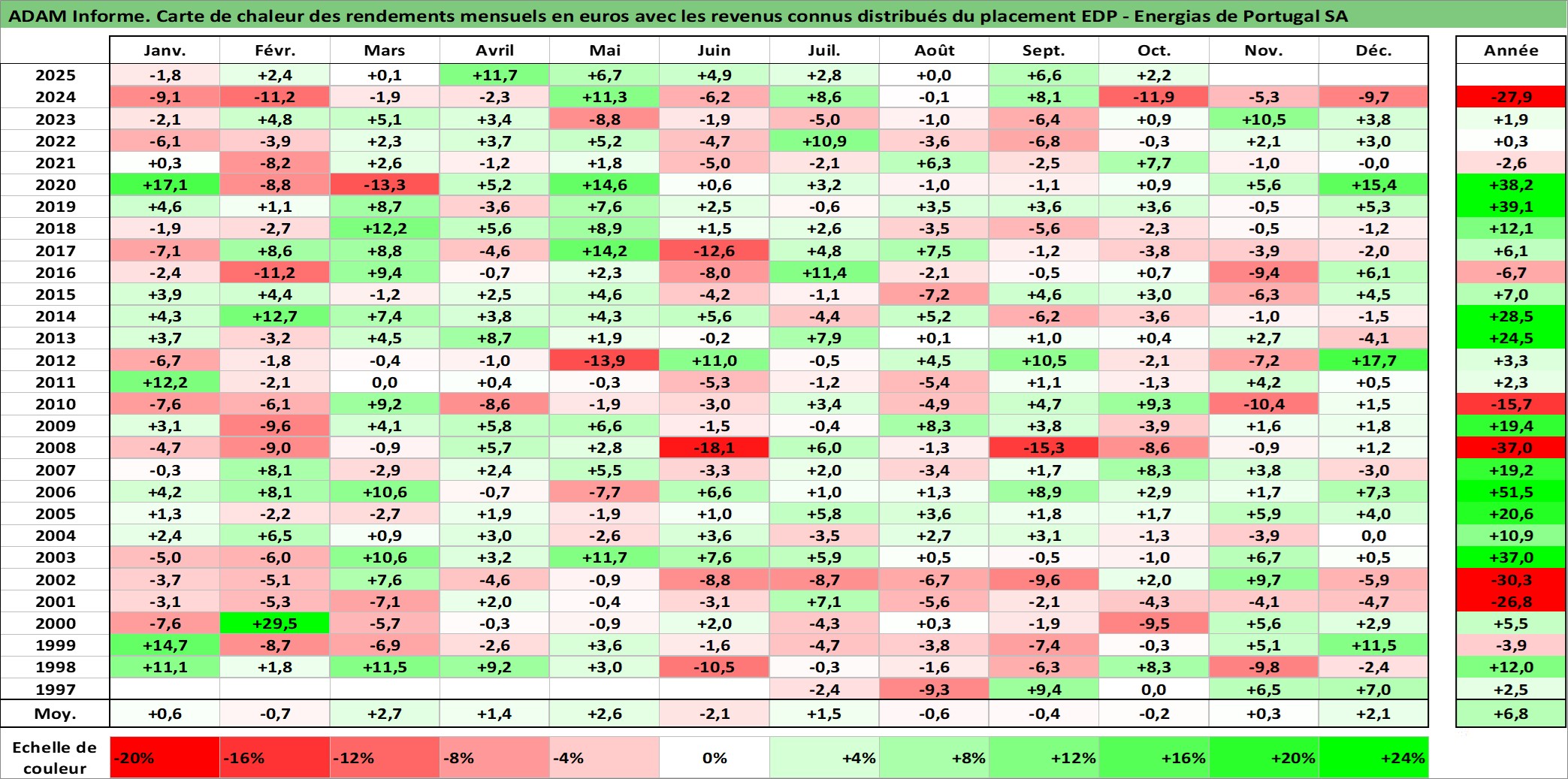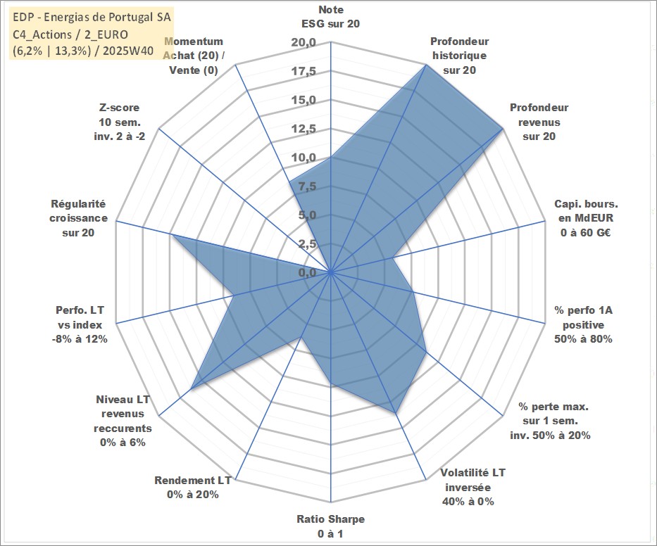Site dédié aux investisseursPage dédiée sur site financeAnalyse des valorisations hebdomadaires de l'action EDP - Energias de Portugal SA. Cet actif est cote en EUR. Les valorisations couvrent les semaines 1997W25 a 2025W40. Les revenus de cet actif financier sont pris en compte depuis la semaine 1997W26. La note globale ESG de cet actif est estimee a 10.0 (apres rebasage entre 0 et 20).