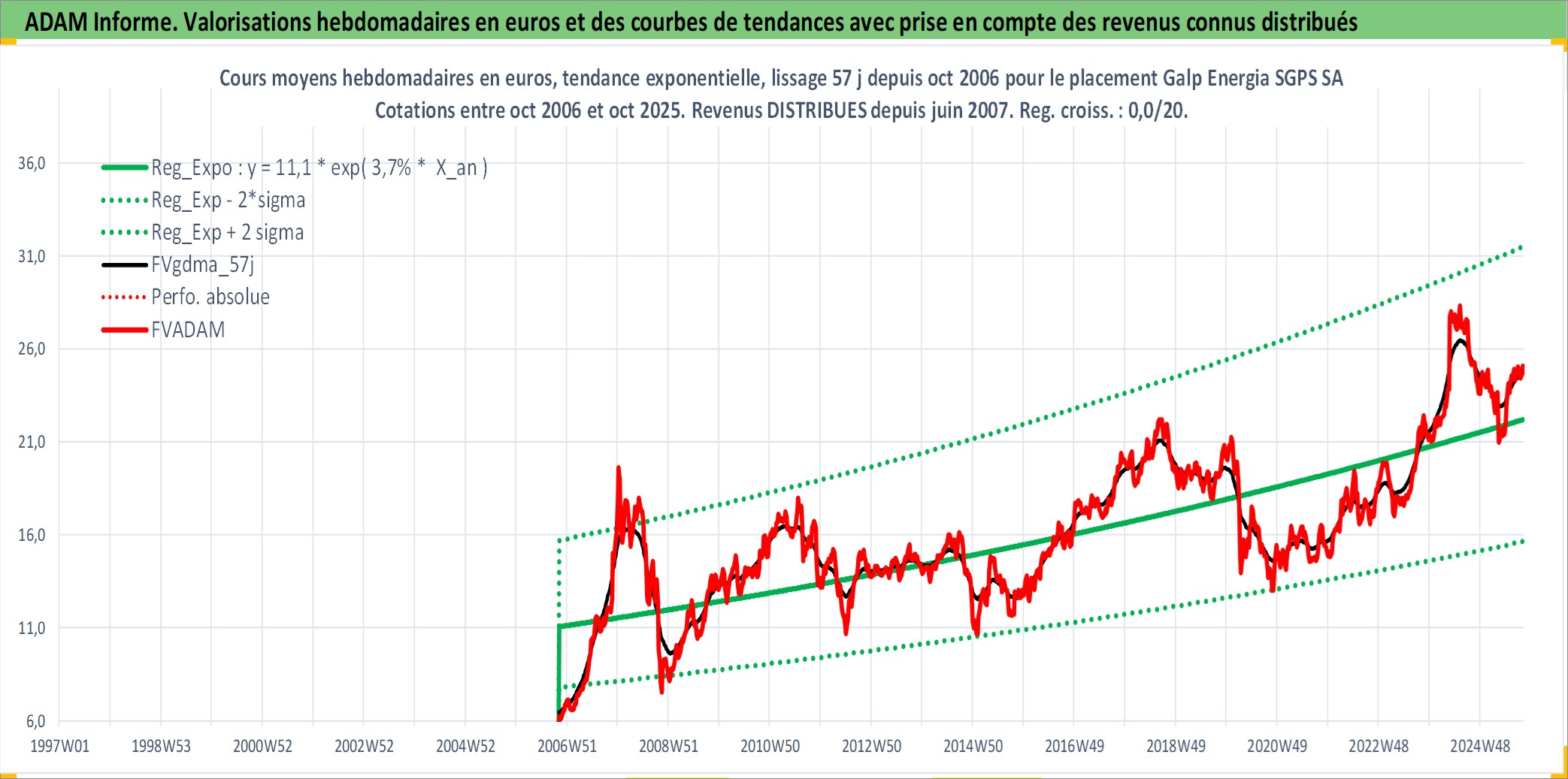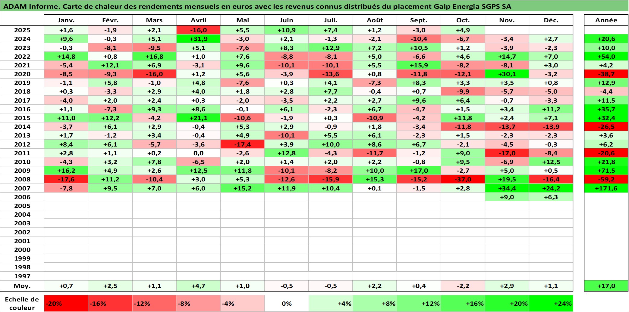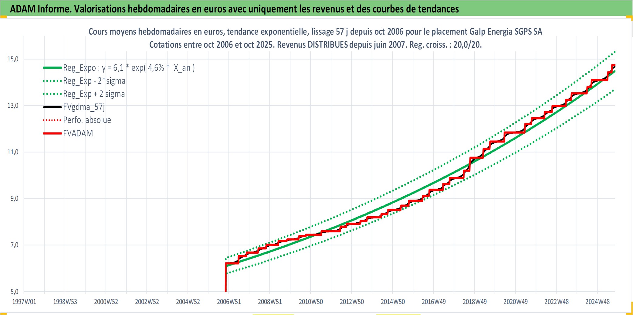 Site dédié aux investisseursPage dédiée sur site financeAnalyse des valorisations hebdomadaires de l'action Galp Energia SGPS SA. Cet actif est cote en EUR. Les valorisations couvrent les semaines 2006W43 a 2025W40. Les revenus de cet actif financier sont pris en compte depuis la semaine 2007W24. La note globale ESG de cet actif est estimee a 7.0 (apres rebasage entre 0 et 20).
