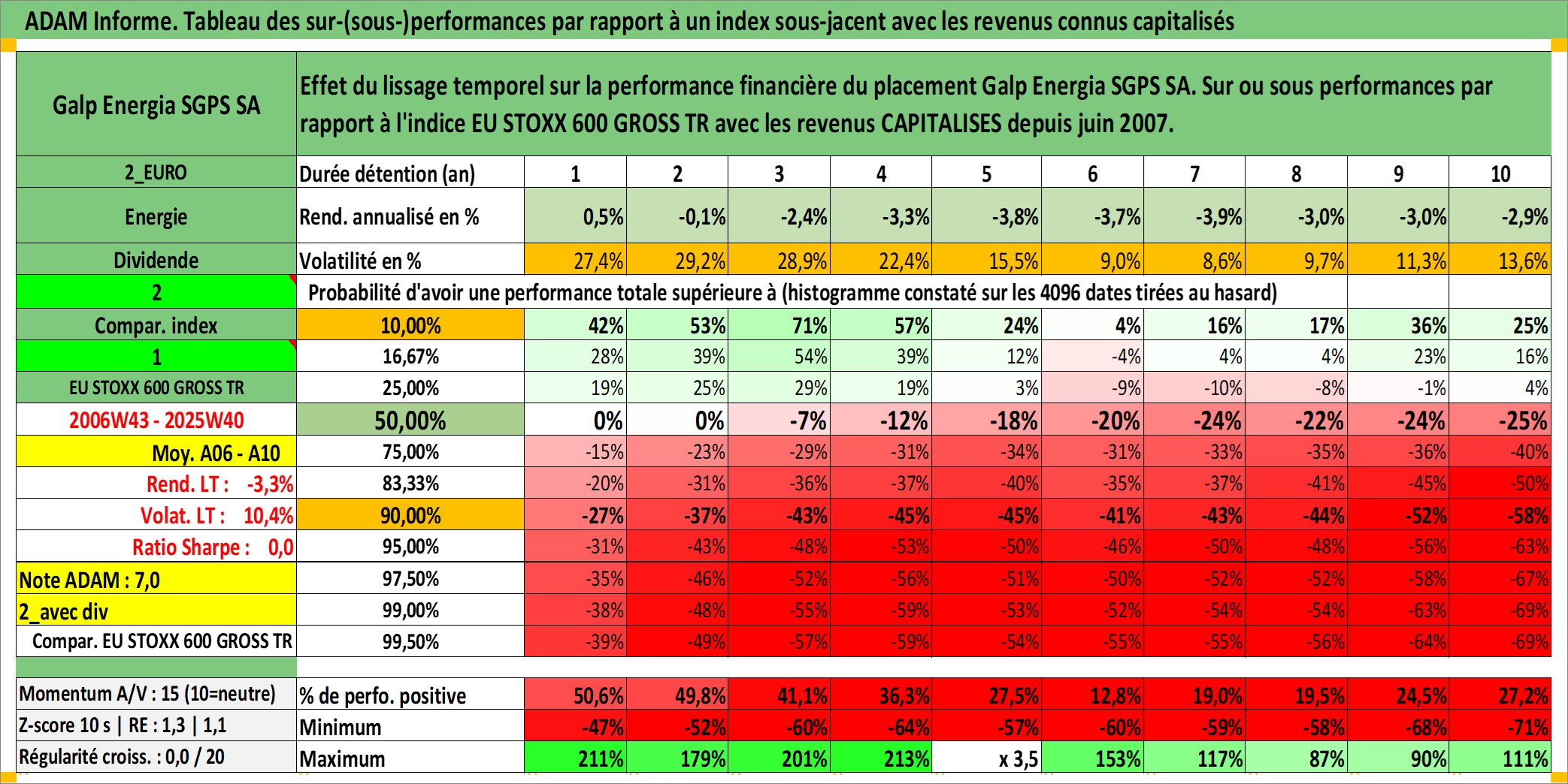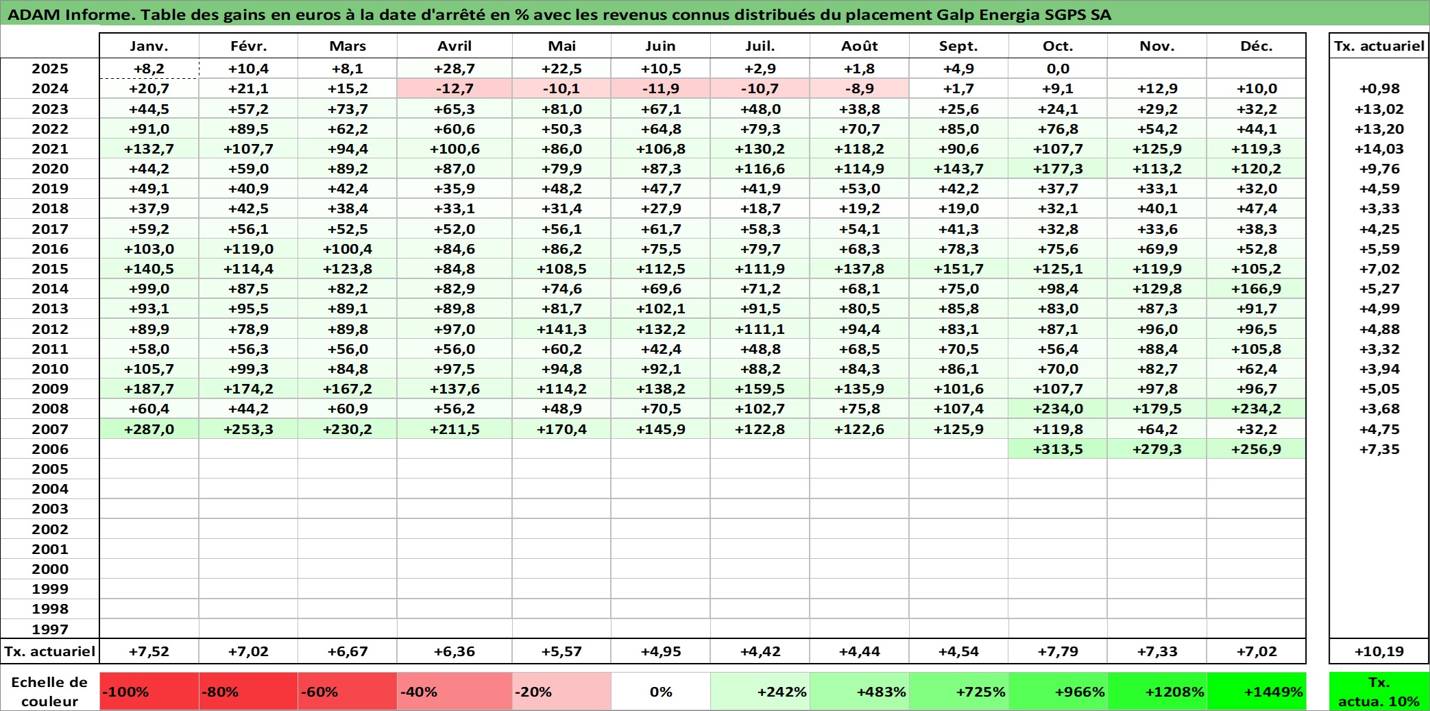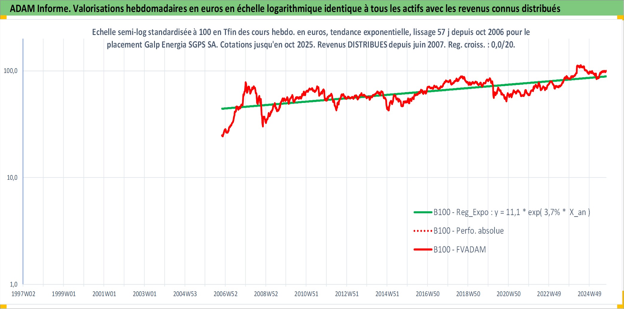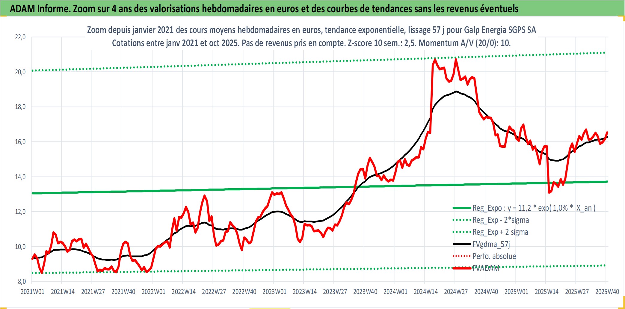 Site dédié aux investisseursPage dédiée sur site financeAnalyse des valorisations hebdomadaires de l'action Galp Energia SGPS SA. Cet actif est cote en EUR. Les valorisations couvrent les semaines 2006W43 a 2025W40. Les revenus de cet actif financier sont pris en compte depuis la semaine 2007W24. La note globale ESG de cet actif est estimee a 7.0 (apres rebasage entre 0 et 20).