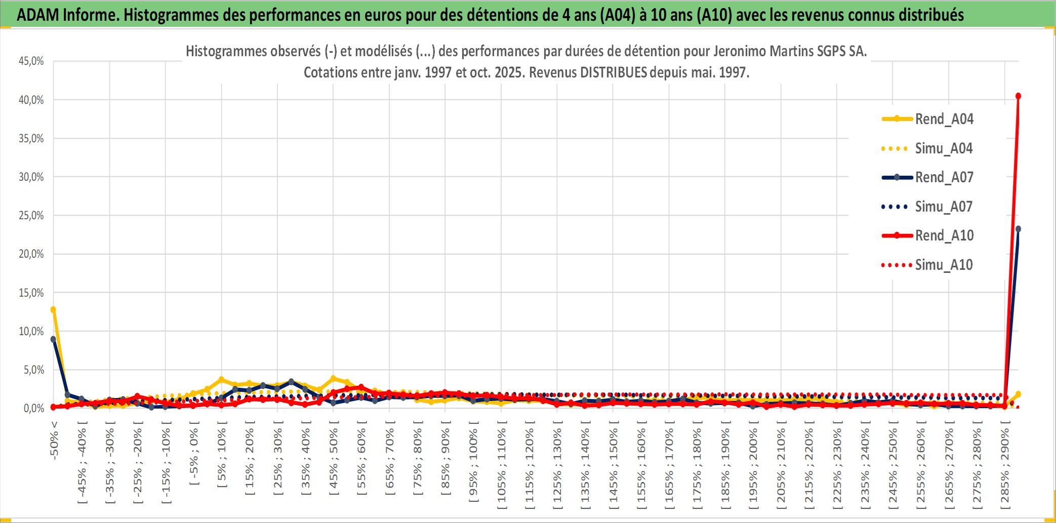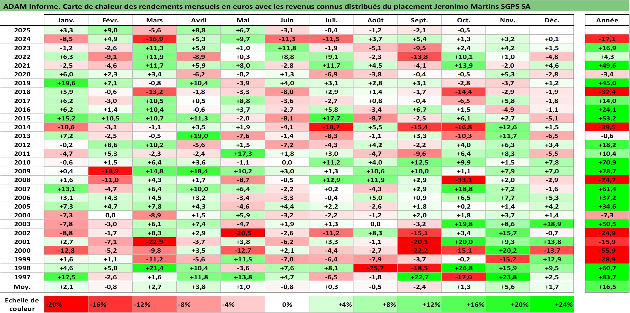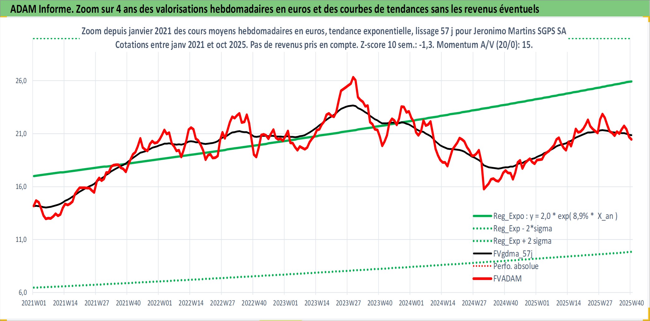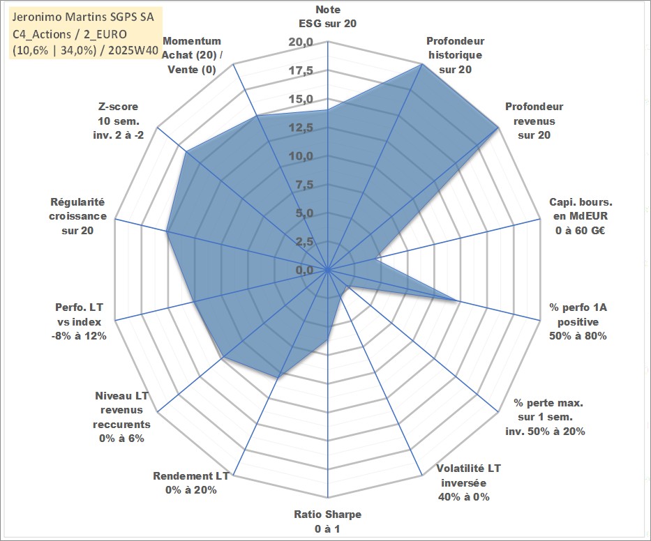 Site dédié aux investisseursPage dédiée sur site financeAnalyse des valorisations hebdomadaires de l'action Jeronimo Martins SGPS SA. Cet actif est cote en EUR. Les valorisations couvrent les semaines 1997W01 a 2025W40. Les revenus de cet actif financier sont pris en compte depuis la semaine 1997W20. La note globale ESG de cet actif est estimee a 14.0 (apres rebasage entre 0 et 20).