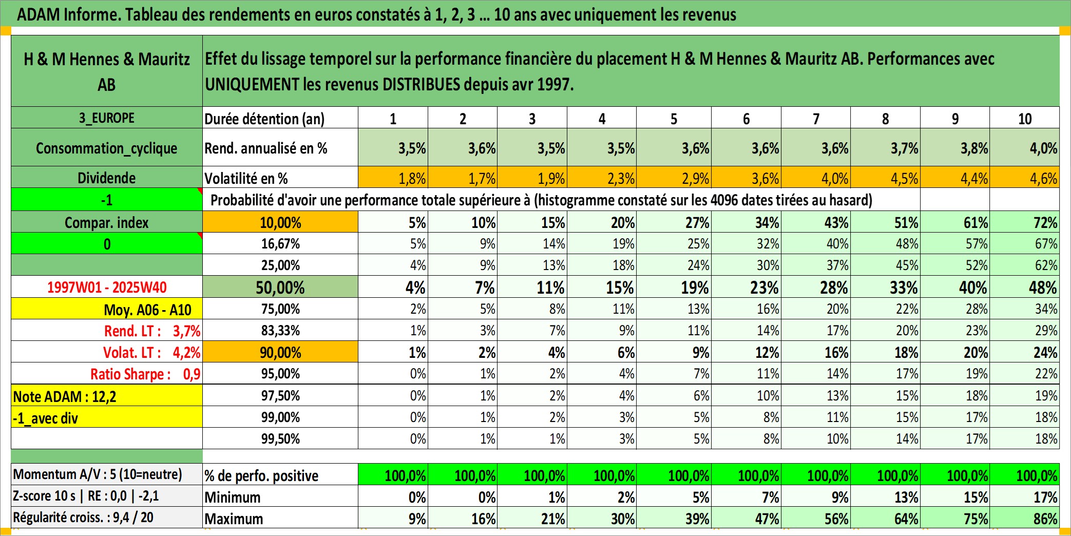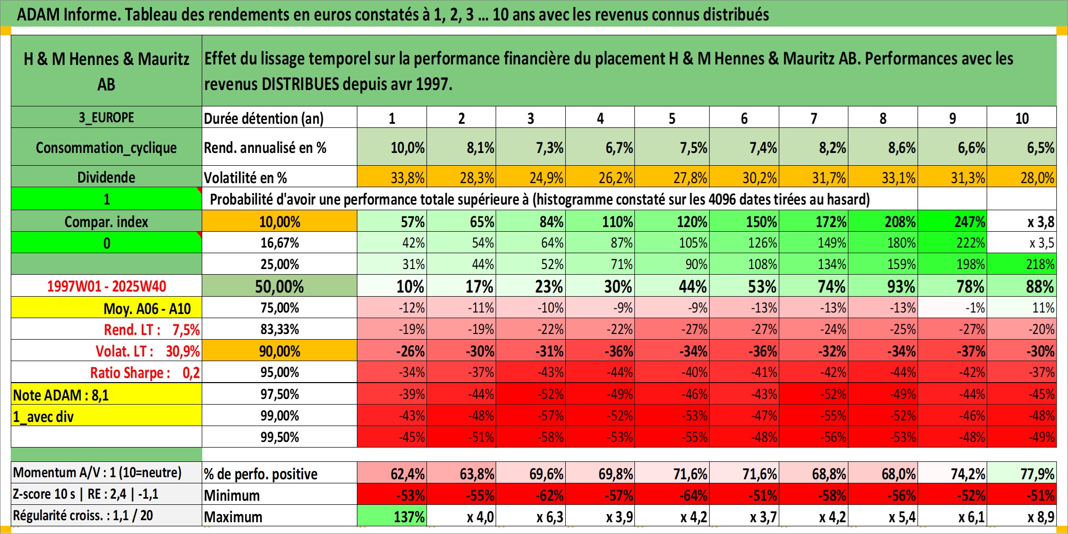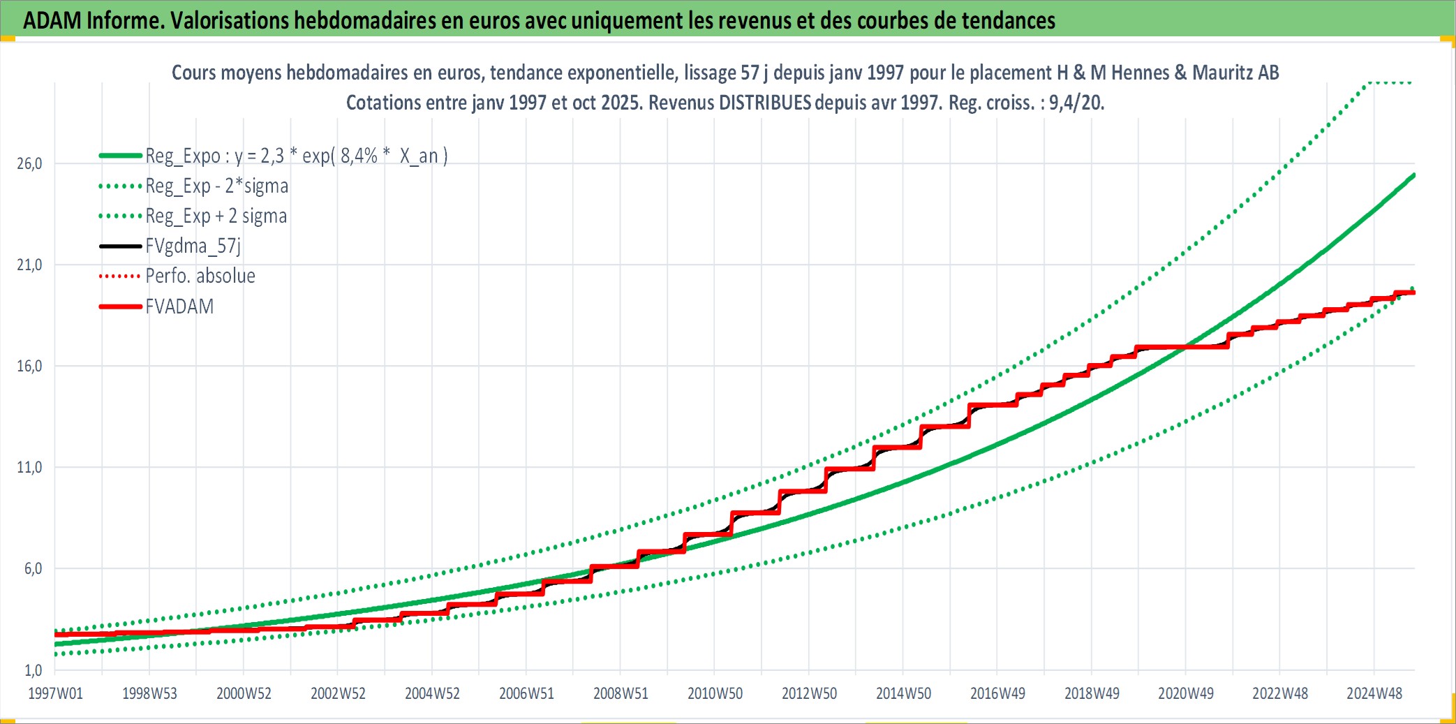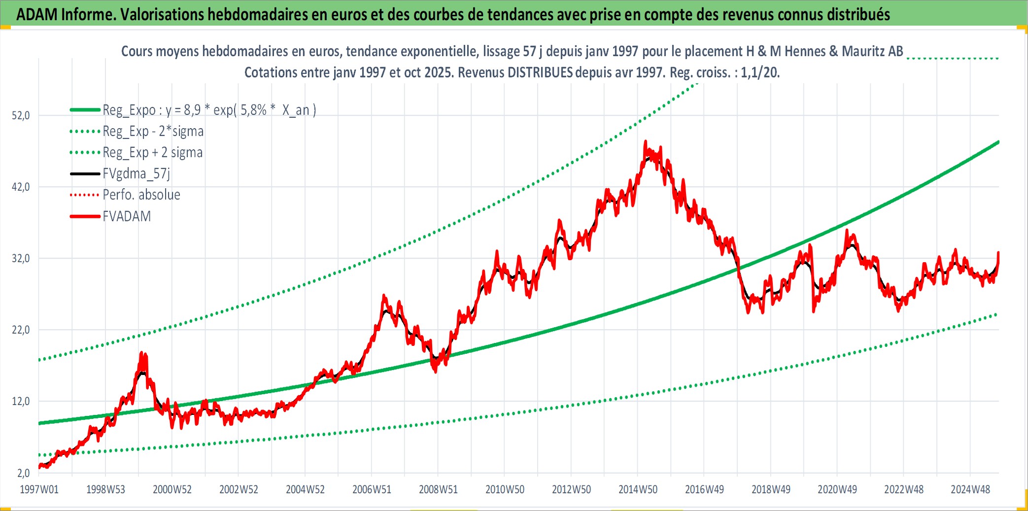 Site dédié aux investisseursPage dédiée sur site financeAnalyse des valorisations hebdomadaires de l'action H & M Hennes & Mauritz AB. Cet actif est cote en SEK. Les valorisations sont en contrevaleur EURO et couvrent les semaines 1997W01 a 2025W40. Les revenus de cet actif financier sont pris en compte depuis la semaine 1997W15. La note globale ESG de cet actif est estimee a 13.0 (apres rebasage entre 0 et 20).