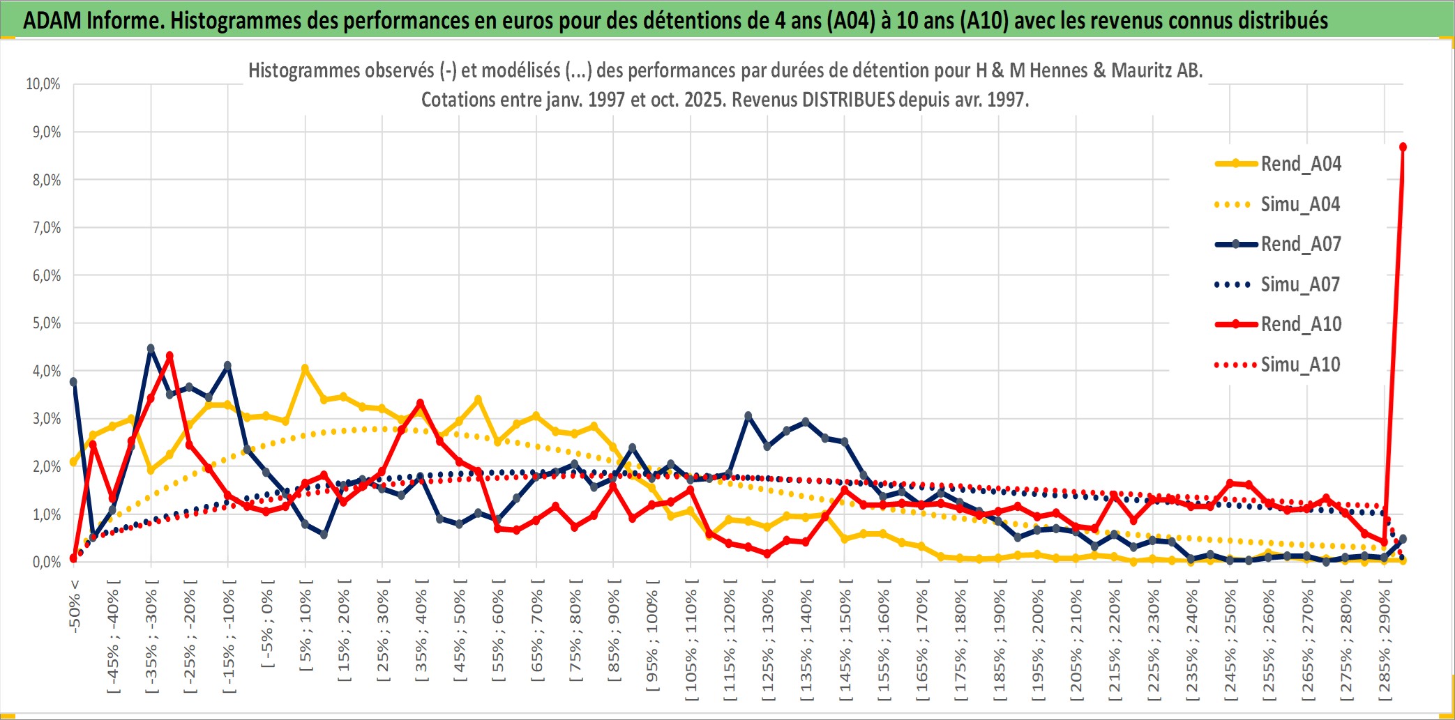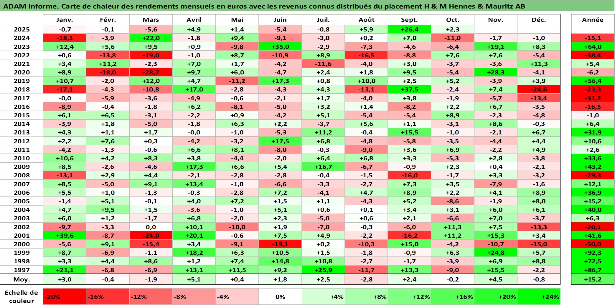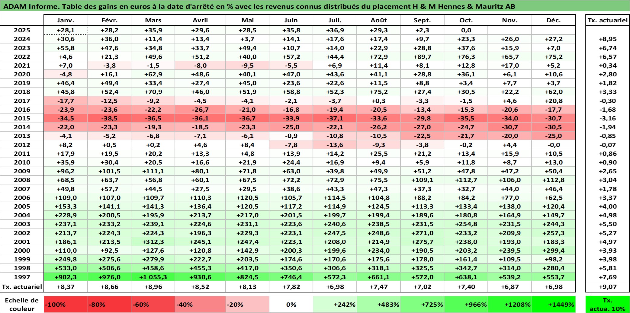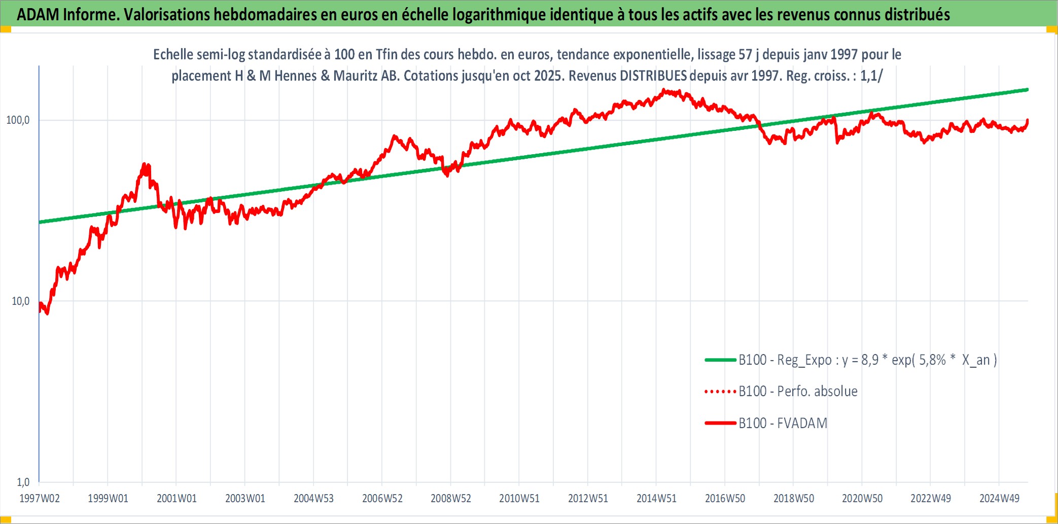 Site dédié aux investisseursPage dédiée sur site financeAnalyse des valorisations hebdomadaires de l'action H & M Hennes & Mauritz AB. Cet actif est cote en SEK. Les valorisations sont en contrevaleur EURO et couvrent les semaines 1997W01 a 2025W40. Les revenus de cet actif financier sont pris en compte depuis la semaine 1997W15. La note globale ESG de cet actif est estimee a 13.0 (apres rebasage entre 0 et 20).