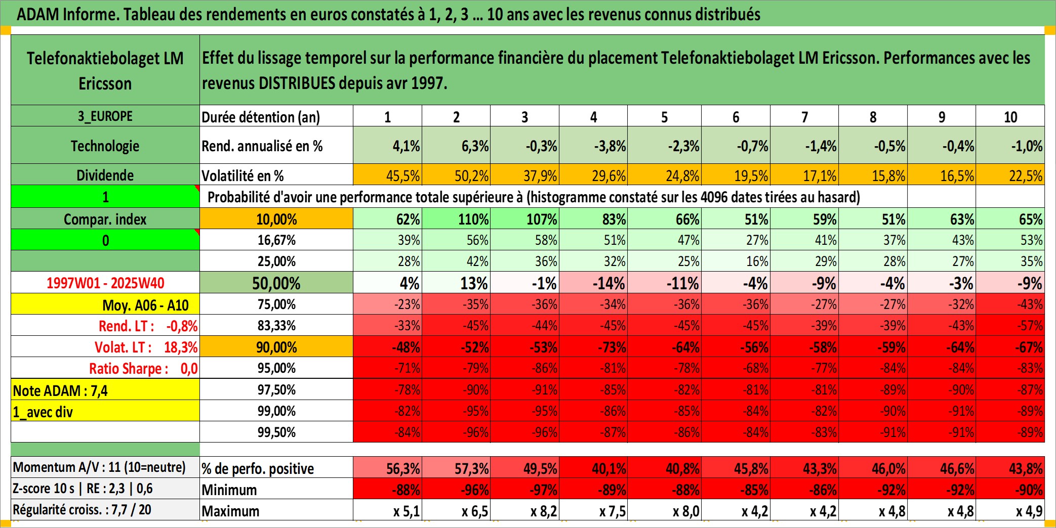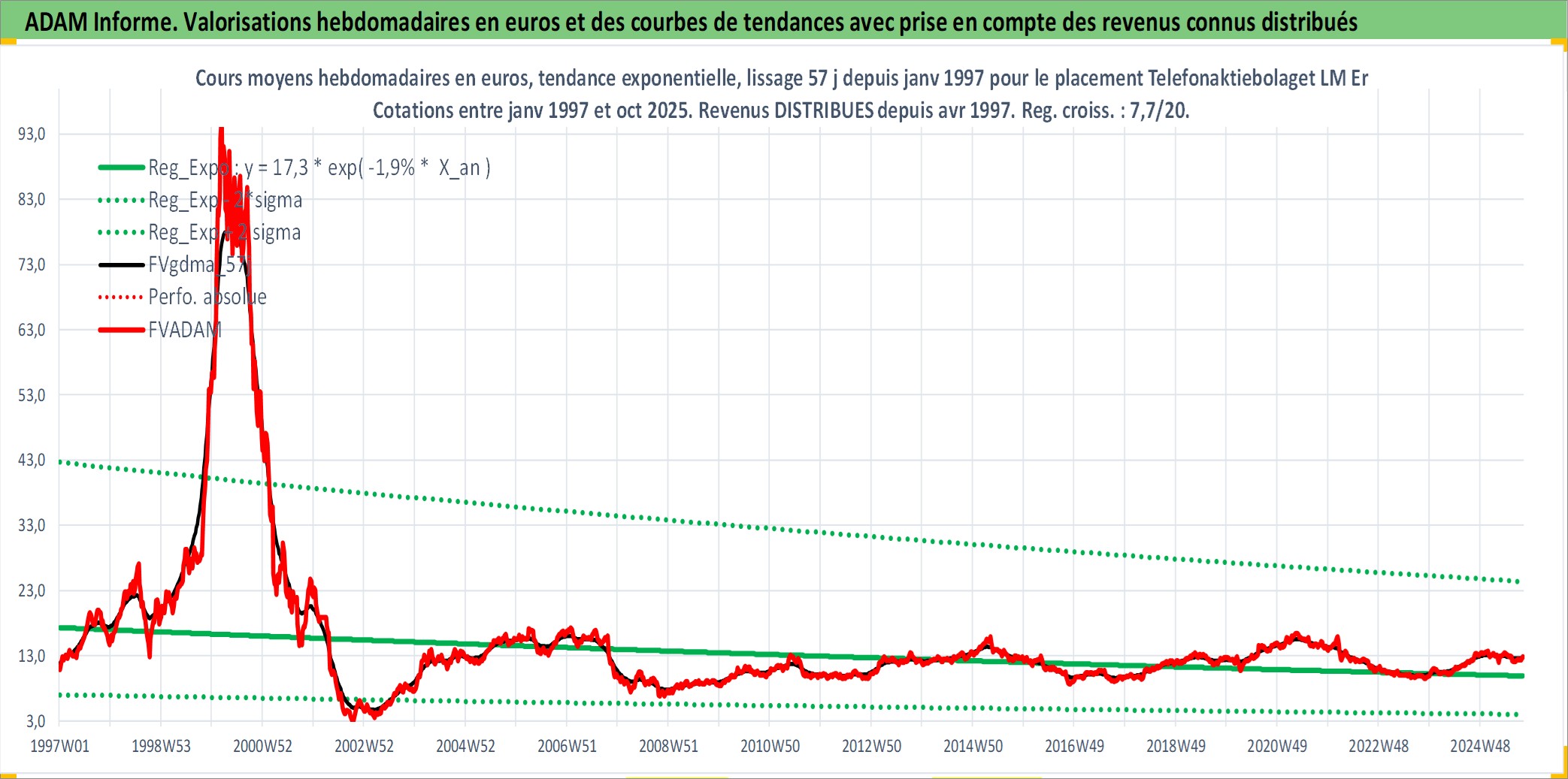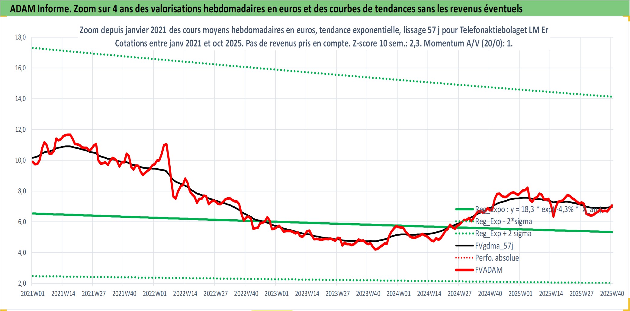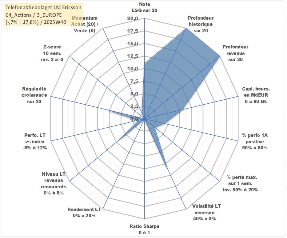 Site dédié aux investisseursPage dédiée sur site financeAnalyse des valorisations hebdomadaires de l'action Telefonaktiebolaget LM Ericsson. Cet actif est cote en SEK. Les valorisations sont en contrevaleur EURO et couvrent les semaines 1997W01 a 2025W40. Les revenus de cet actif financier sont pris en compte depuis la semaine 1997W18. La note globale ESG de cet actif est estimee a 11.0 (apres rebasage entre 0 et 20).