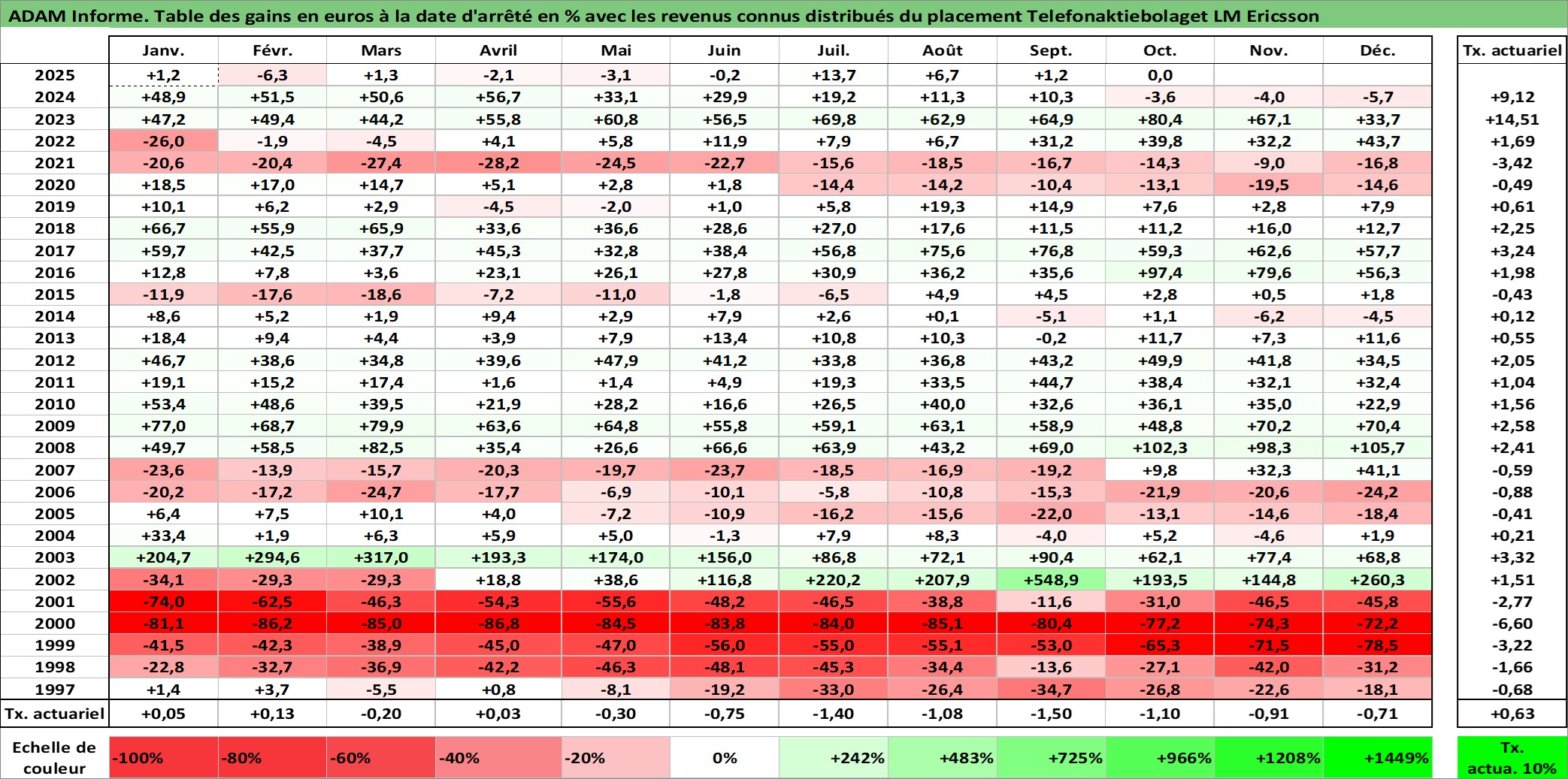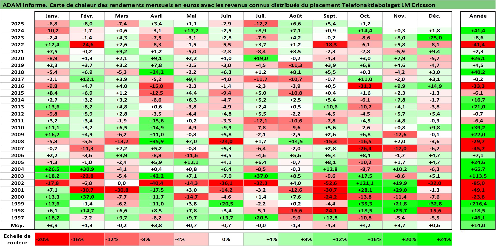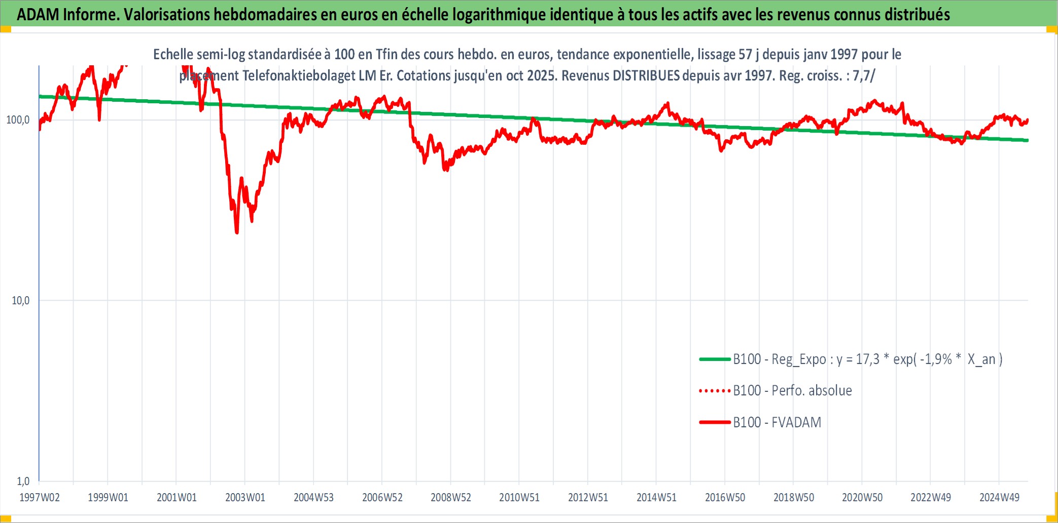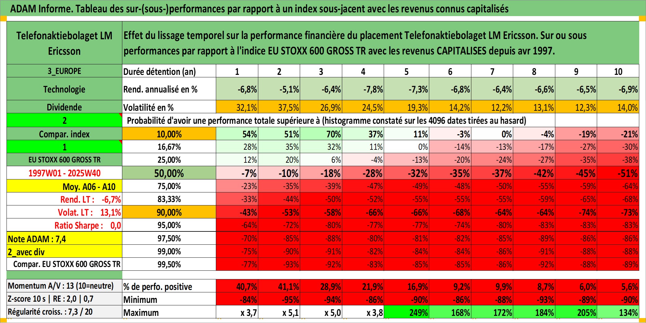 Site dédié aux investisseursPage dédiée sur site financeAnalyse des valorisations hebdomadaires de l'action Telefonaktiebolaget LM Ericsson. Cet actif est cote en SEK. Les valorisations sont en contrevaleur EURO et couvrent les semaines 1997W01 a 2025W40. Les revenus de cet actif financier sont pris en compte depuis la semaine 1997W18. La note globale ESG de cet actif est estimee a 11.0 (apres rebasage entre 0 et 20).
