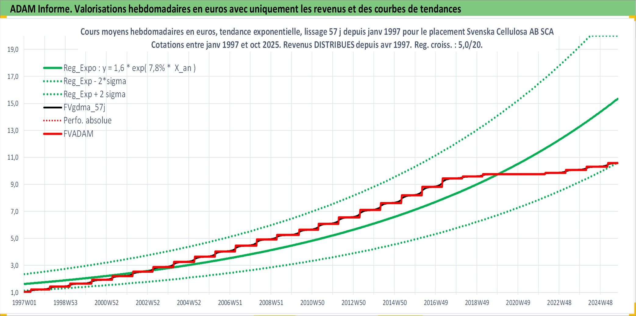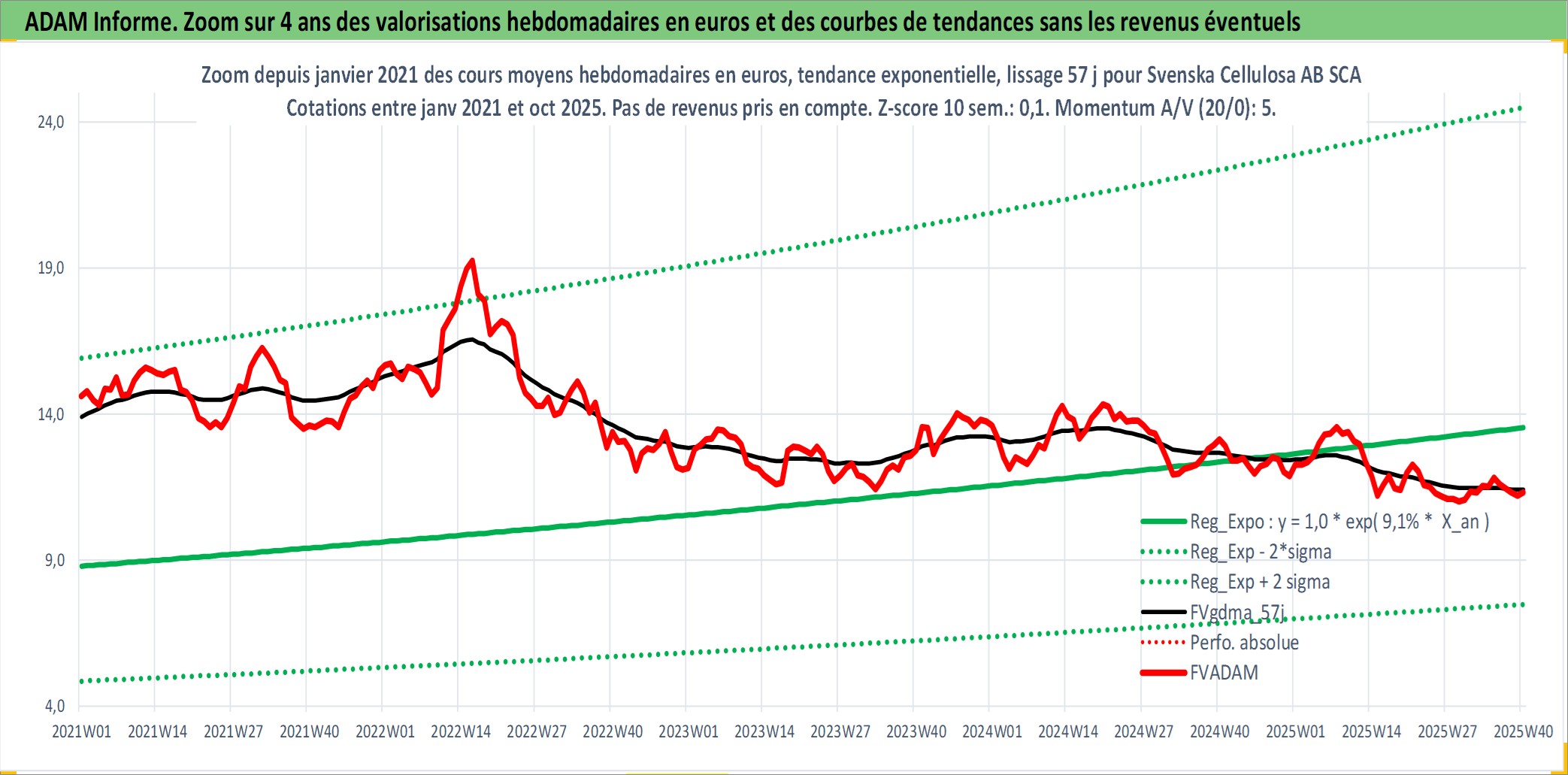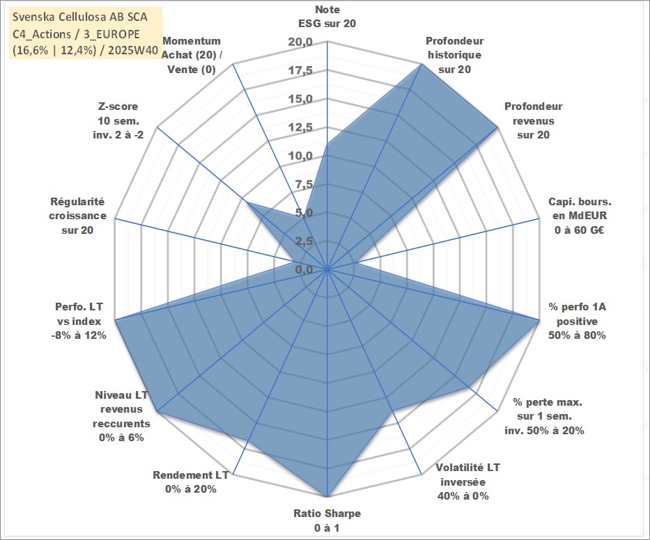 Site dédié aux investisseursPage dédiée sur site financeAnalyse des valorisations hebdomadaires de l'action Svenska Cellulosa AB SCA. Cet actif est cote en SEK. Les valorisations sont en contrevaleur EURO et couvrent les semaines 1997W01 a 2025W40. Les revenus de cet actif financier sont pris en compte depuis la semaine 1997W18. La note globale ESG de cet actif est estimee a 11.0 (apres rebasage entre 0 et 20).