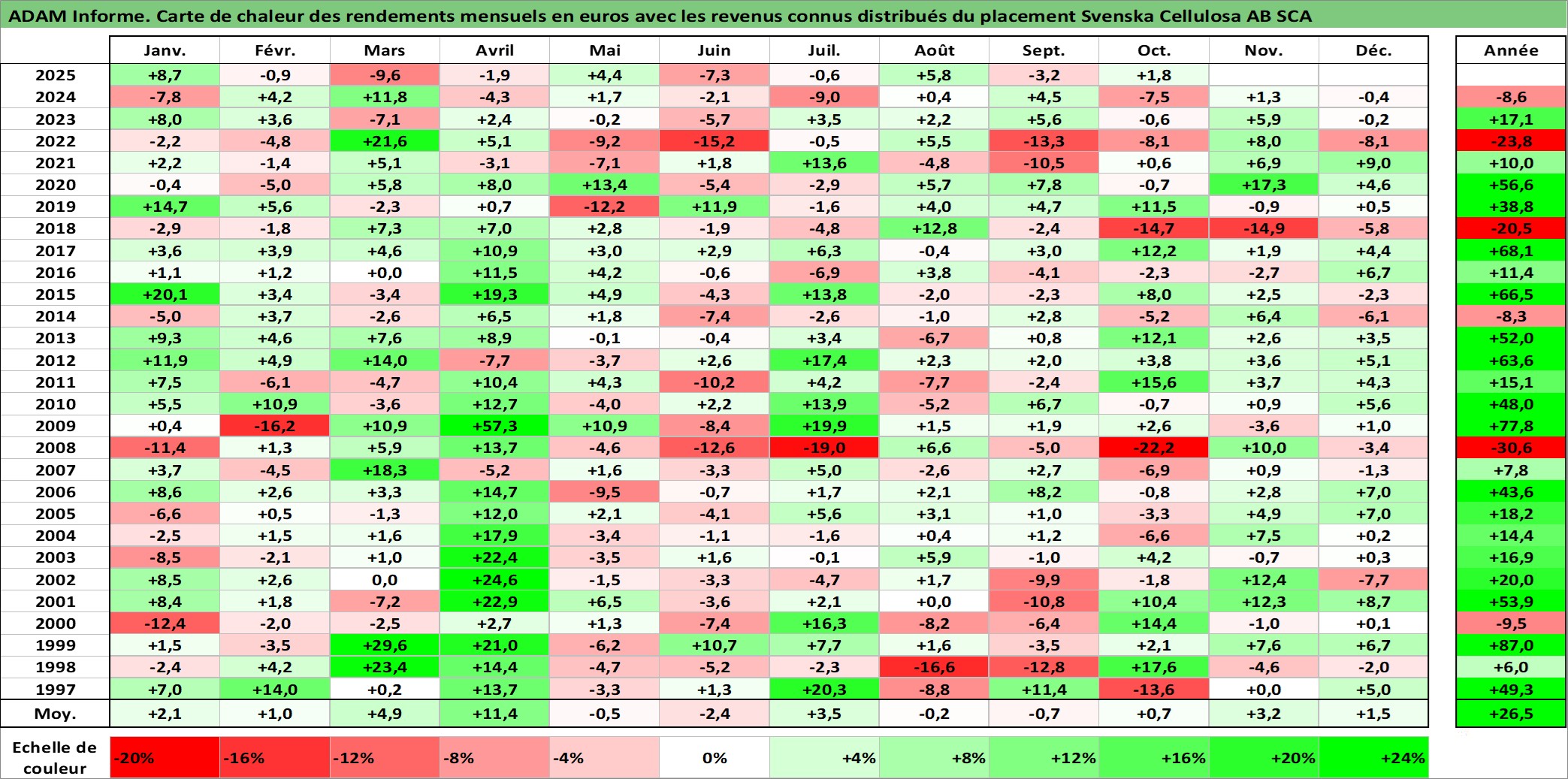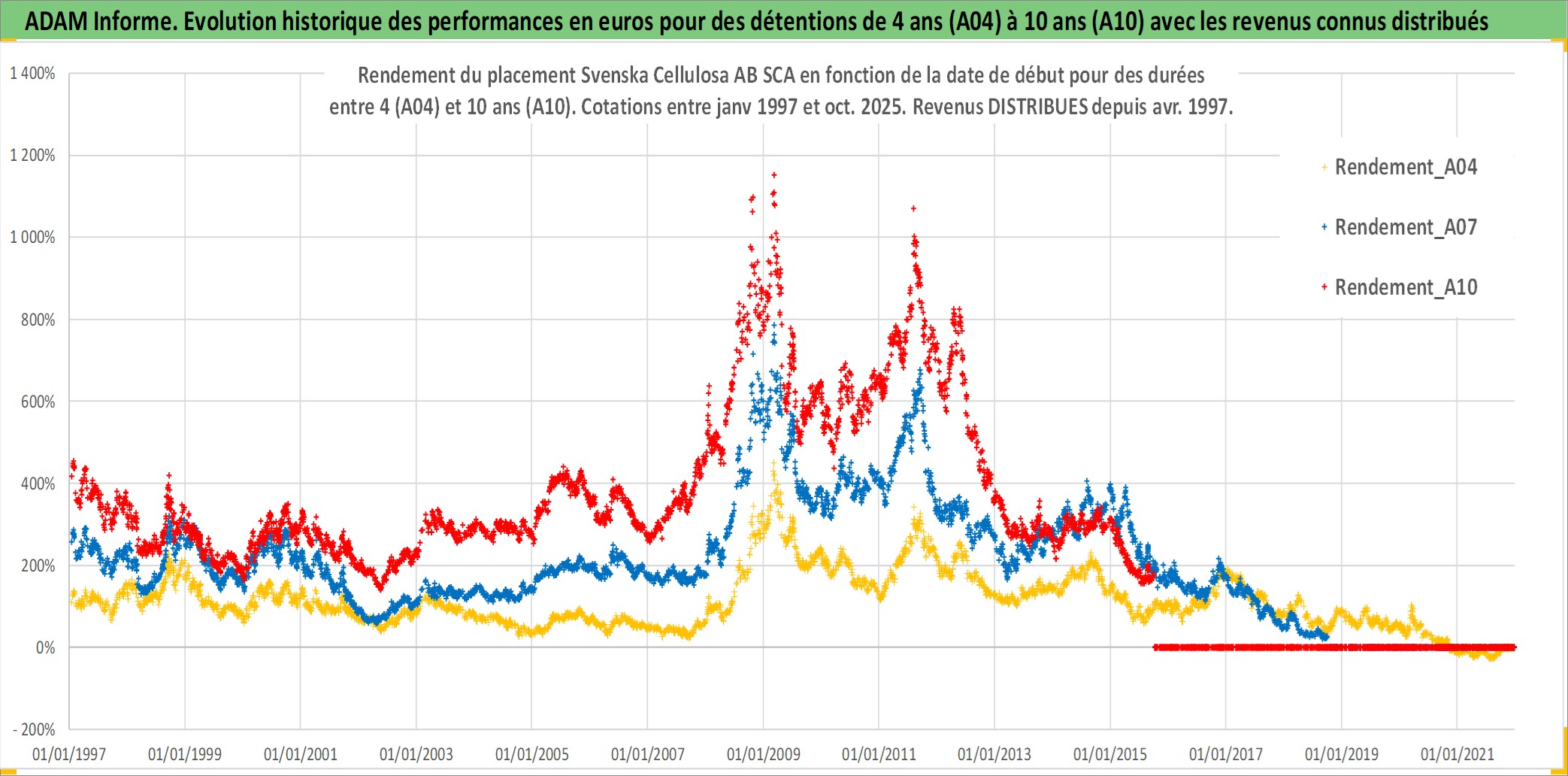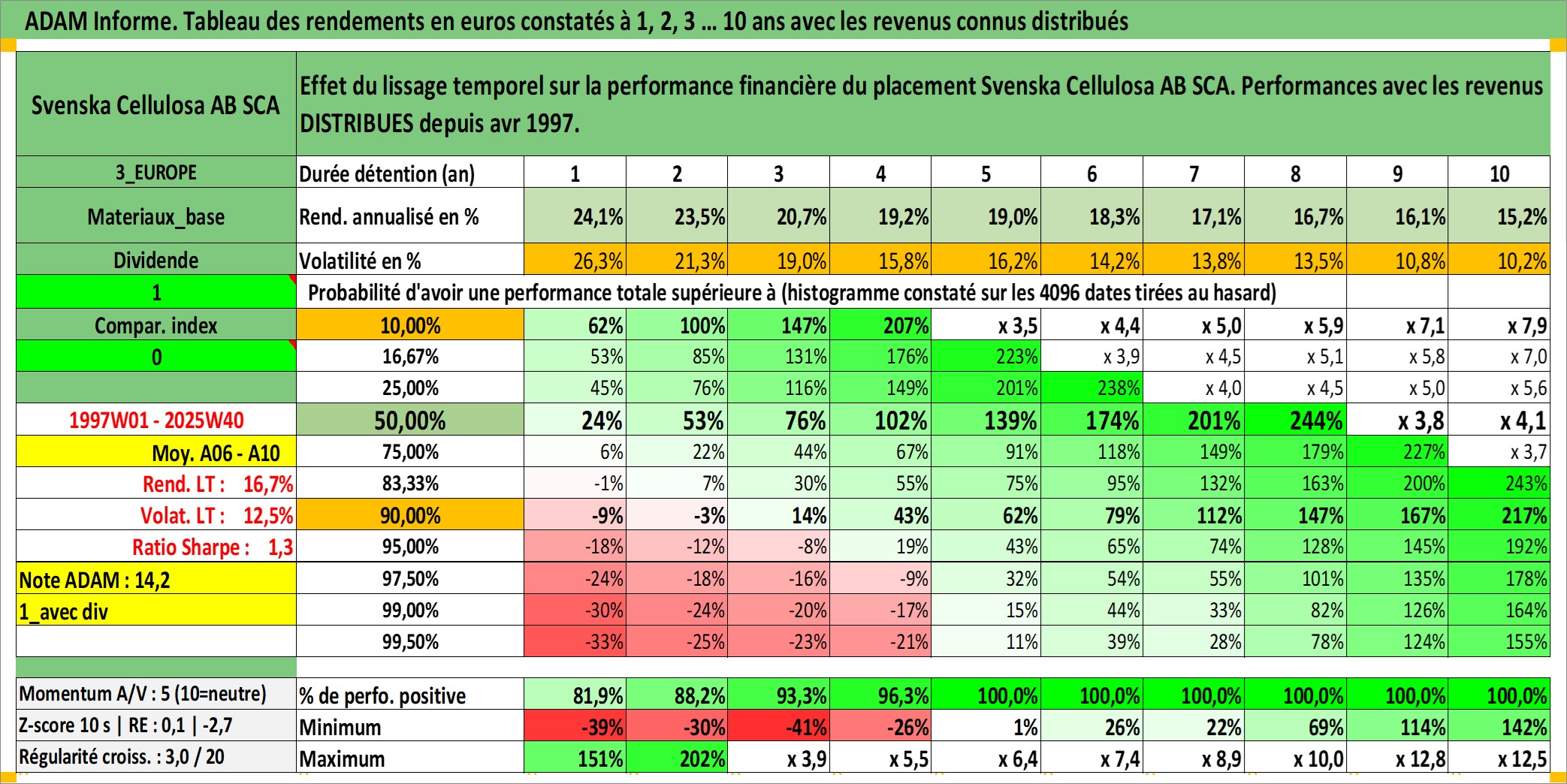 Site dédié aux investisseursPage dédiée sur site financeAnalyse des valorisations hebdomadaires de l'action Svenska Cellulosa AB SCA. Cet actif est cote en SEK. Les valorisations sont en contrevaleur EURO et couvrent les semaines 1997W01 a 2025W40. Les revenus de cet actif financier sont pris en compte depuis la semaine 1997W18. La note globale ESG de cet actif est estimee a 11.0 (apres rebasage entre 0 et 20).