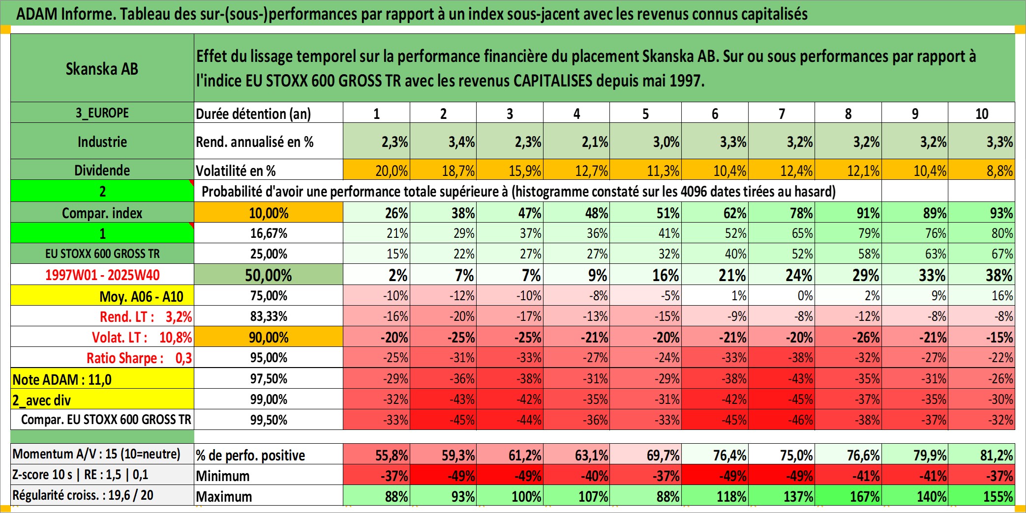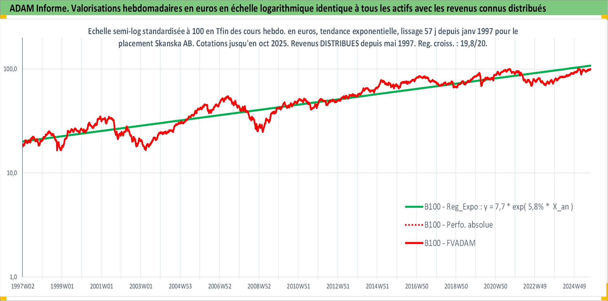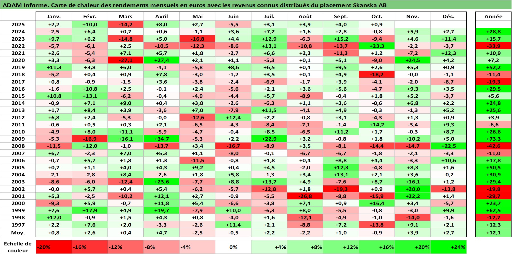 Site dédié aux investisseursPage dédiée sur site financeAnalyse des valorisations hebdomadaires de l'action Skanska AB. Cet actif est cote en SEK. Les valorisations sont en contrevaleur EURO et couvrent les semaines 1997W01 a 2025W40. Les revenus de cet actif financier sont pris en compte depuis la semaine 1997W19. La note globale ESG de cet actif est estimee a 7.0 (apres rebasage entre 0 et 20).