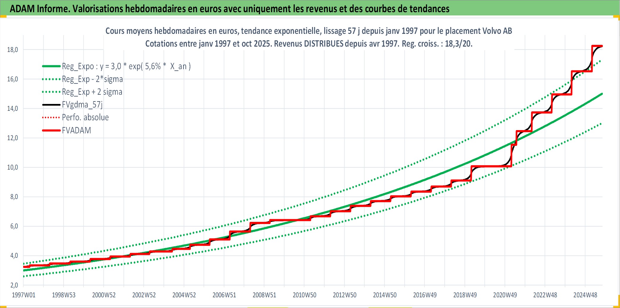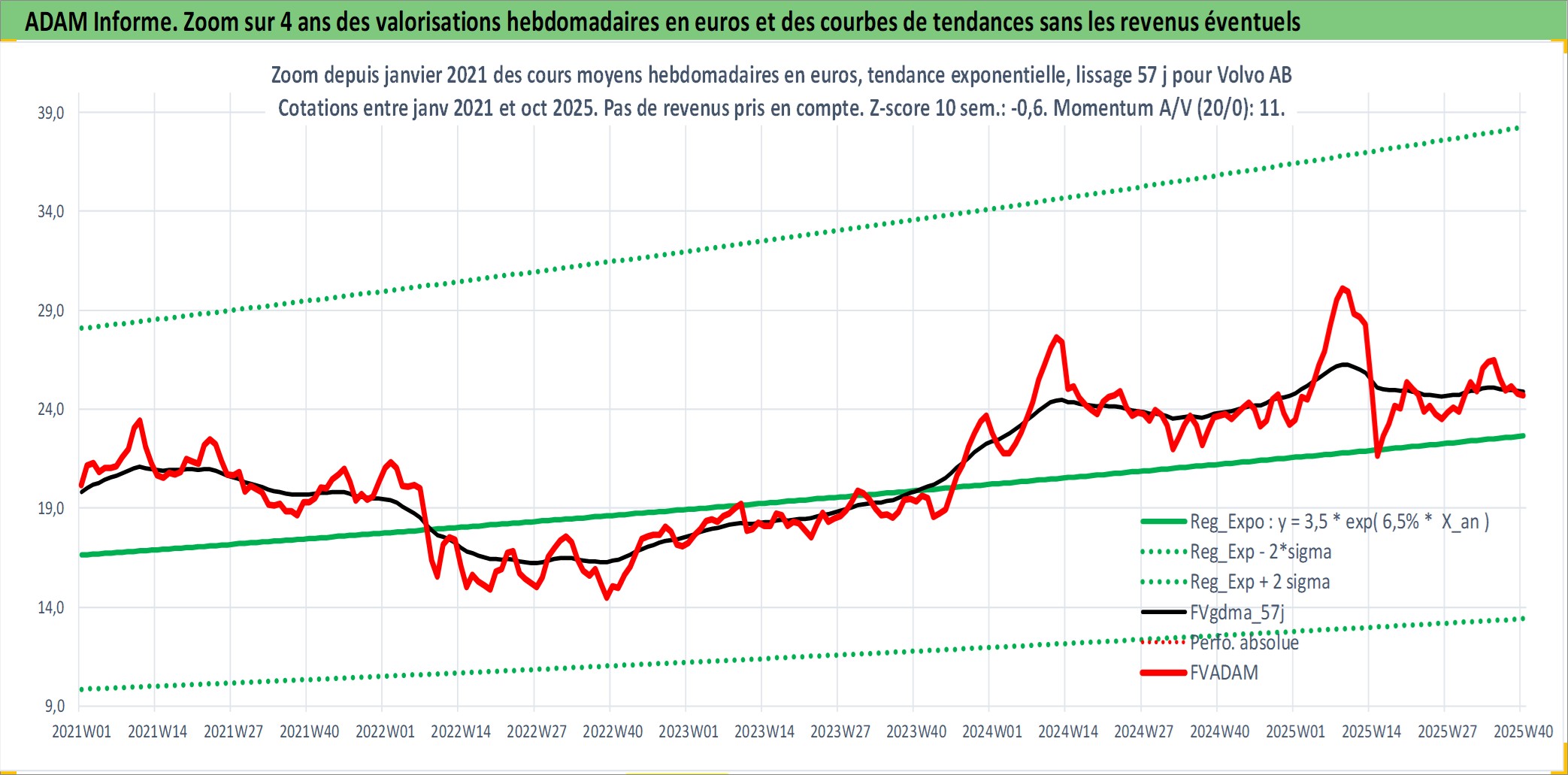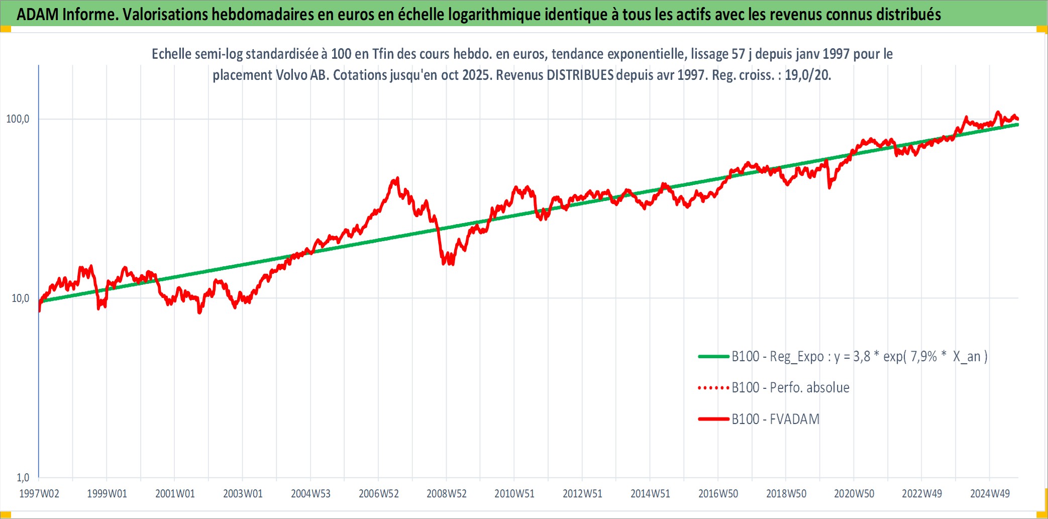 Site dédié aux investisseursPage dédiée sur site financeAnalyse des valorisations hebdomadaires de l'action Volvo AB. Cet actif est cote en SEK. Les valorisations sont en contrevaleur EURO et couvrent les semaines 1997W01 a 2025W40. Les revenus de cet actif financier sont pris en compte depuis la semaine 1997W17. La note globale ESG de cet actif est estimee a 9.0 (apres rebasage entre 0 et 20).