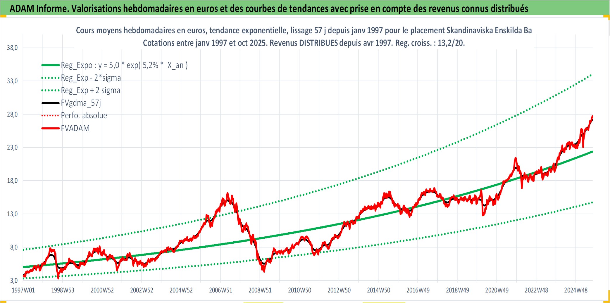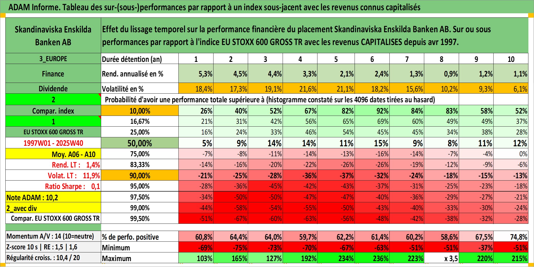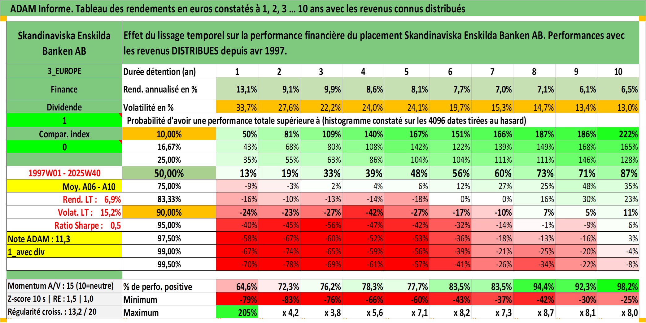 Site dédié aux investisseursPage dédiée sur site financeAnalyse des valorisations hebdomadaires de l'action Skandinaviska Enskilda Banken AB. Cet actif est cote en SEK. Les valorisations sont en contrevaleur EURO et couvrent les semaines 1997W01 a 2025W40. Les revenus de cet actif financier sont pris en compte depuis la semaine 1997W18. La note globale ESG de cet actif est estimee a 8.0 (apres rebasage entre 0 et 20).