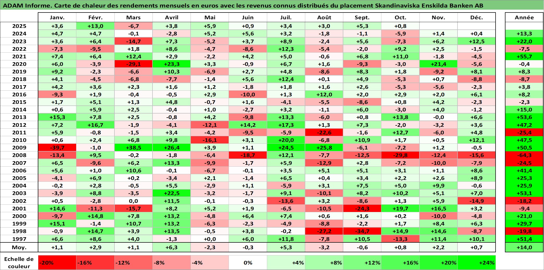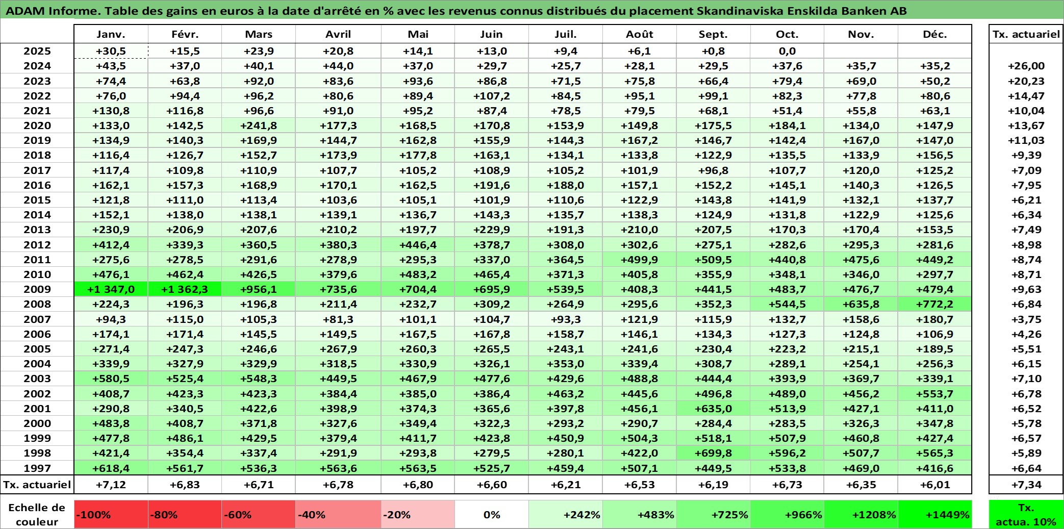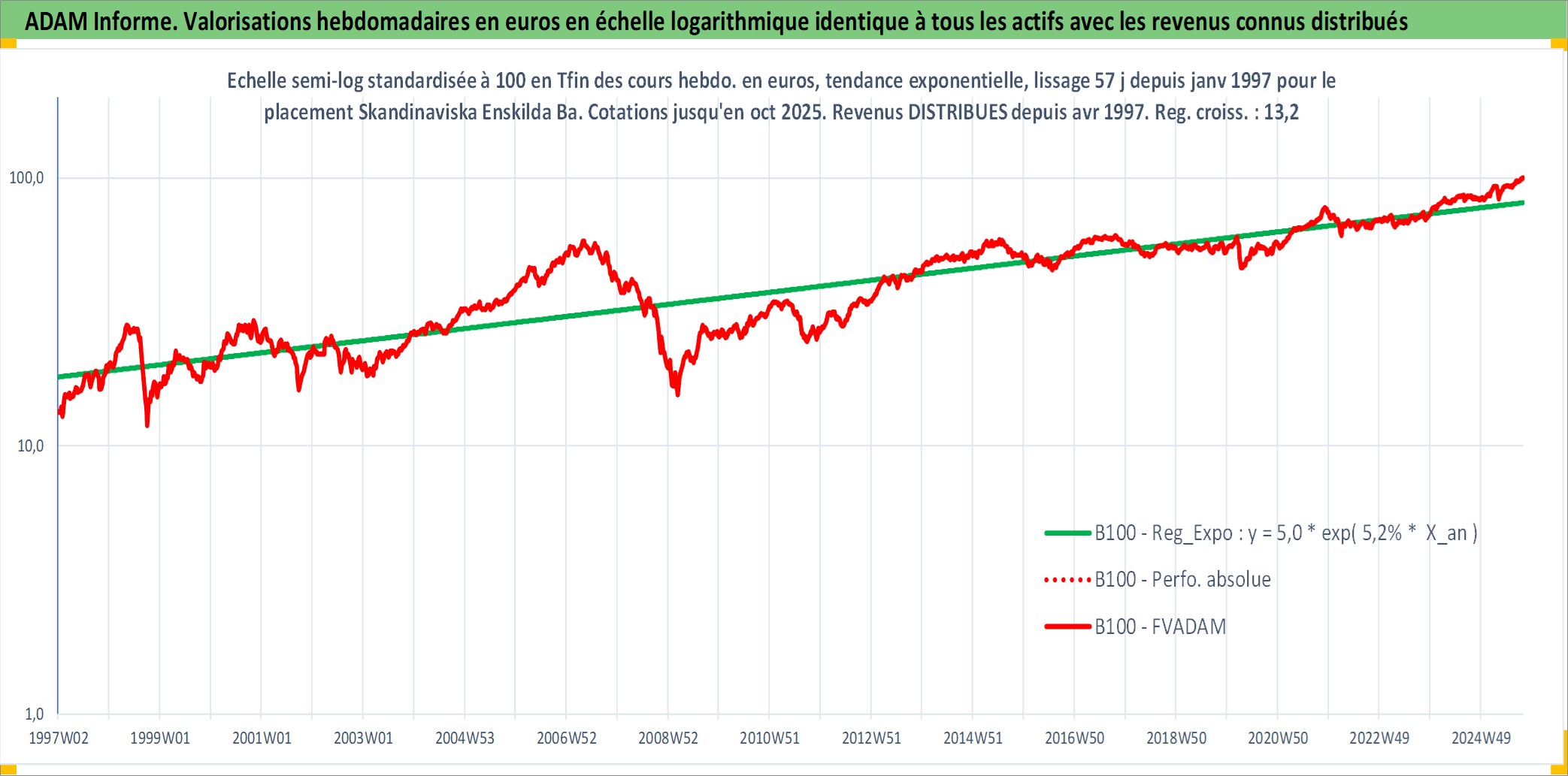 Site dédié aux investisseursPage dédiée sur site financeAnalyse des valorisations hebdomadaires de l'action Skandinaviska Enskilda Banken AB. Cet actif est cote en SEK. Les valorisations sont en contrevaleur EURO et couvrent les semaines 1997W01 a 2025W40. Les revenus de cet actif financier sont pris en compte depuis la semaine 1997W18. La note globale ESG de cet actif est estimee a 8.0 (apres rebasage entre 0 et 20).