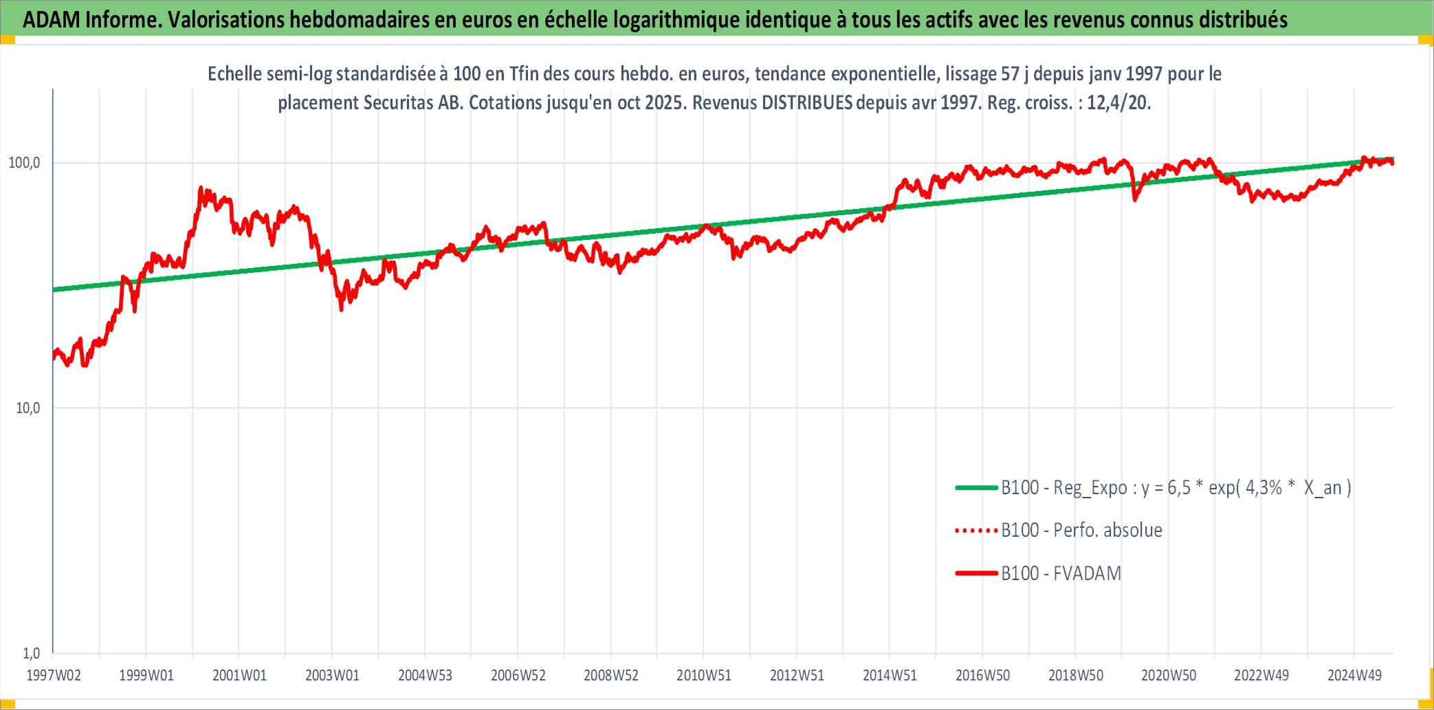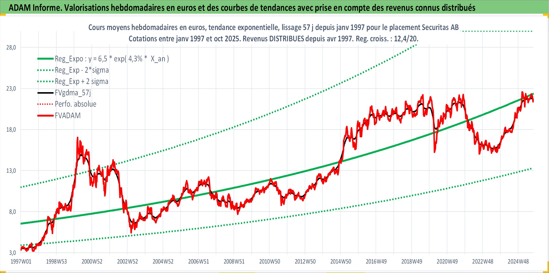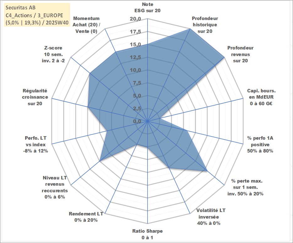 Site dédié aux investisseursPage dédiée sur site financeAnalyse des valorisations hebdomadaires de l'action Securitas AB. Cet actif est cote en SEK. Les valorisations sont en contrevaleur EURO et couvrent les semaines 1997W01 a 2025W40. Les revenus de cet actif financier sont pris en compte depuis la semaine 1997W18. La note globale ESG de cet actif est estimee a 15.0 (apres rebasage entre 0 et 20).