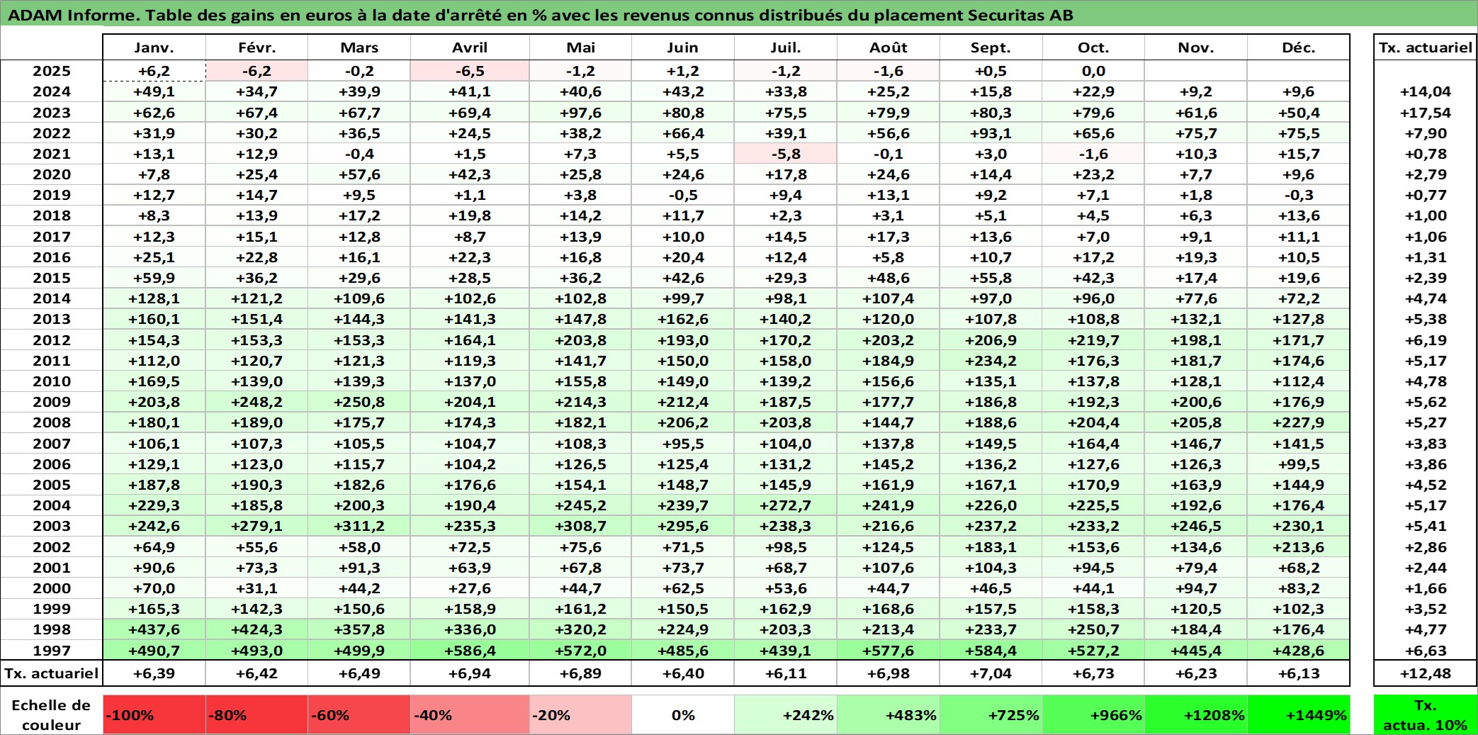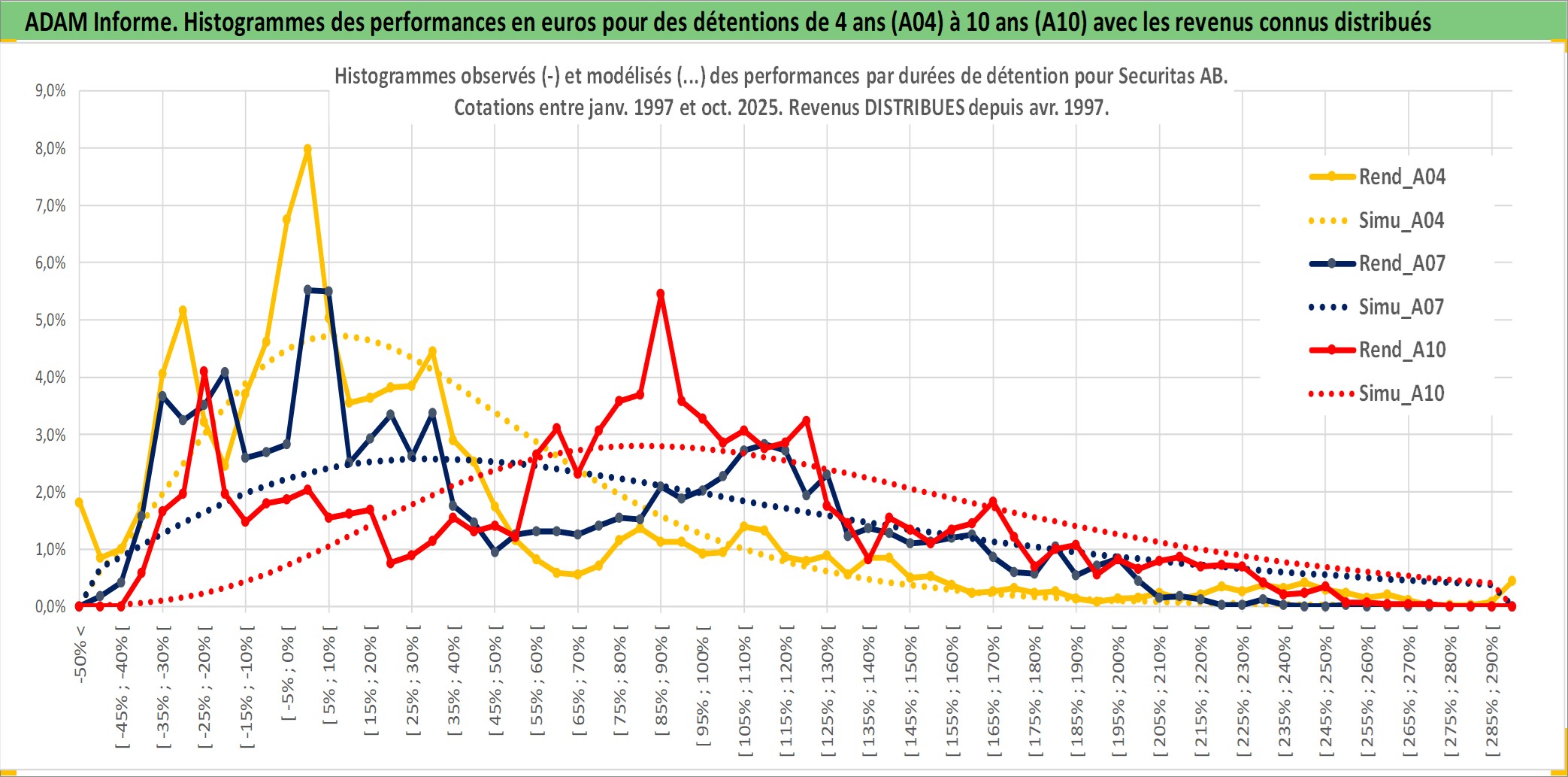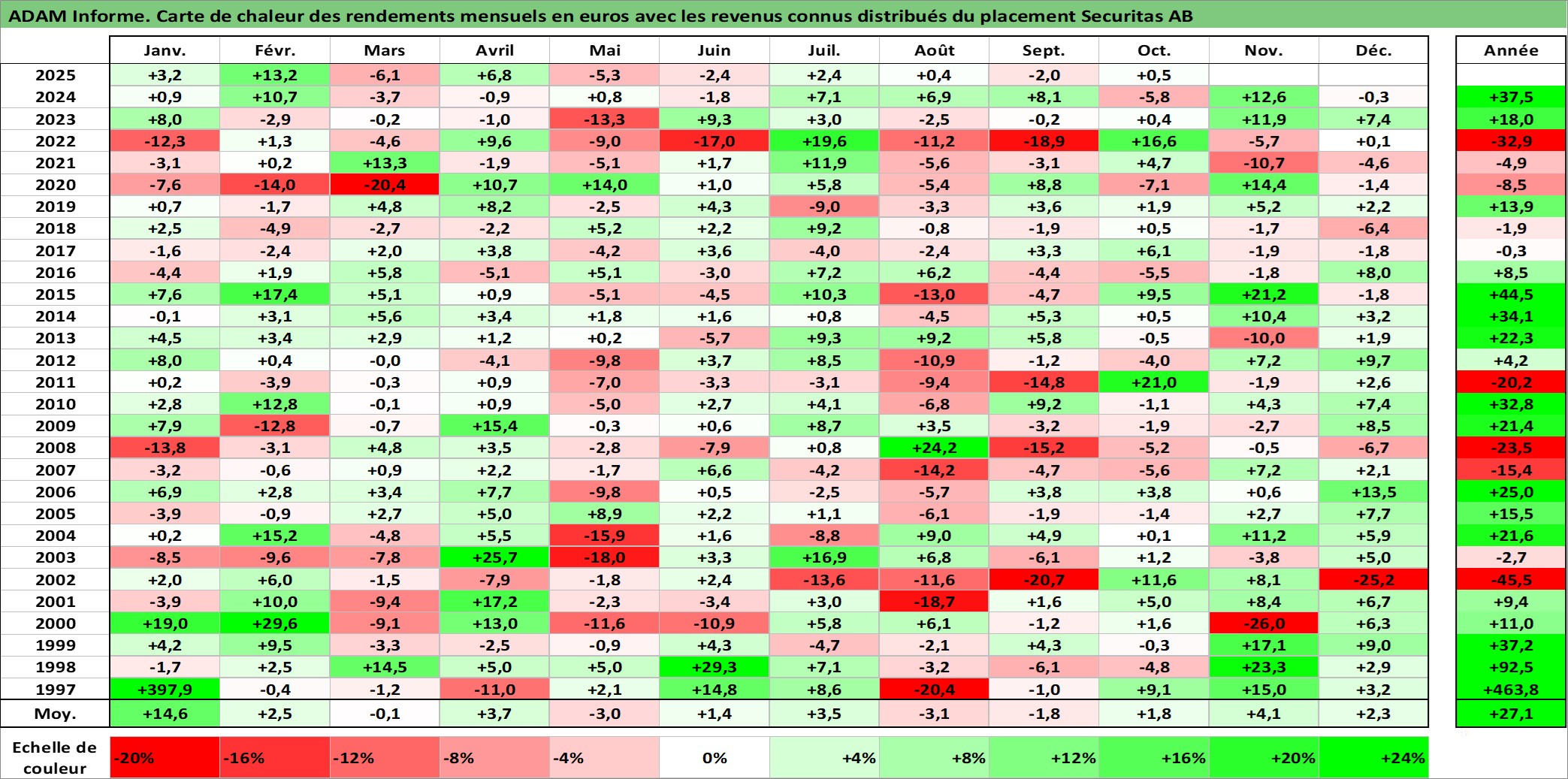 Site dédié aux investisseursPage dédiée sur site financeAnalyse des valorisations hebdomadaires de l'action Securitas AB. Cet actif est cote en SEK. Les valorisations sont en contrevaleur EURO et couvrent les semaines 1997W01 a 2025W40. Les revenus de cet actif financier sont pris en compte depuis la semaine 1997W18. La note globale ESG de cet actif est estimee a 15.0 (apres rebasage entre 0 et 20).