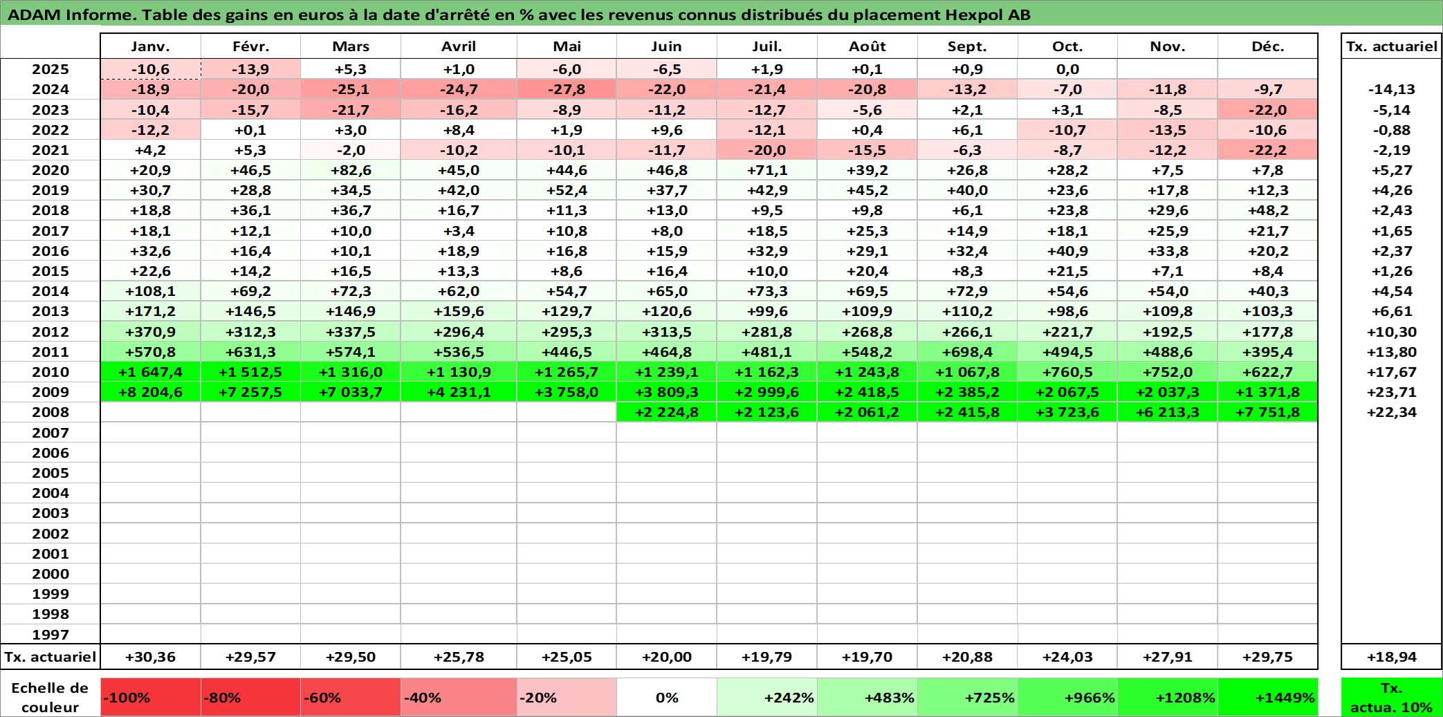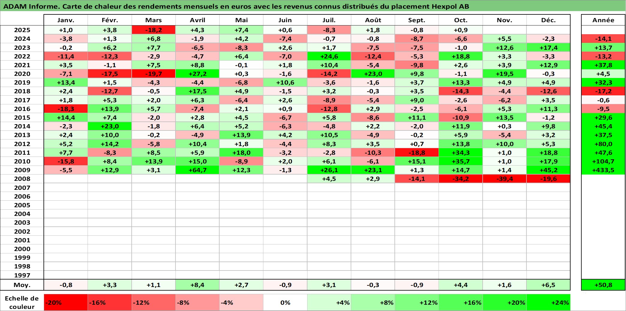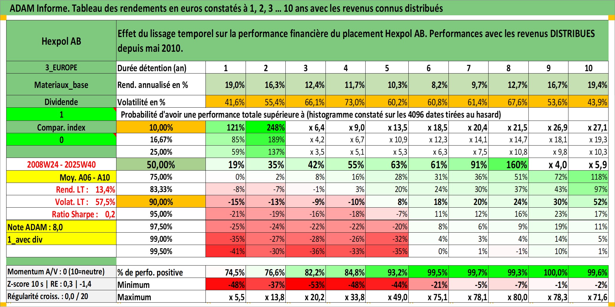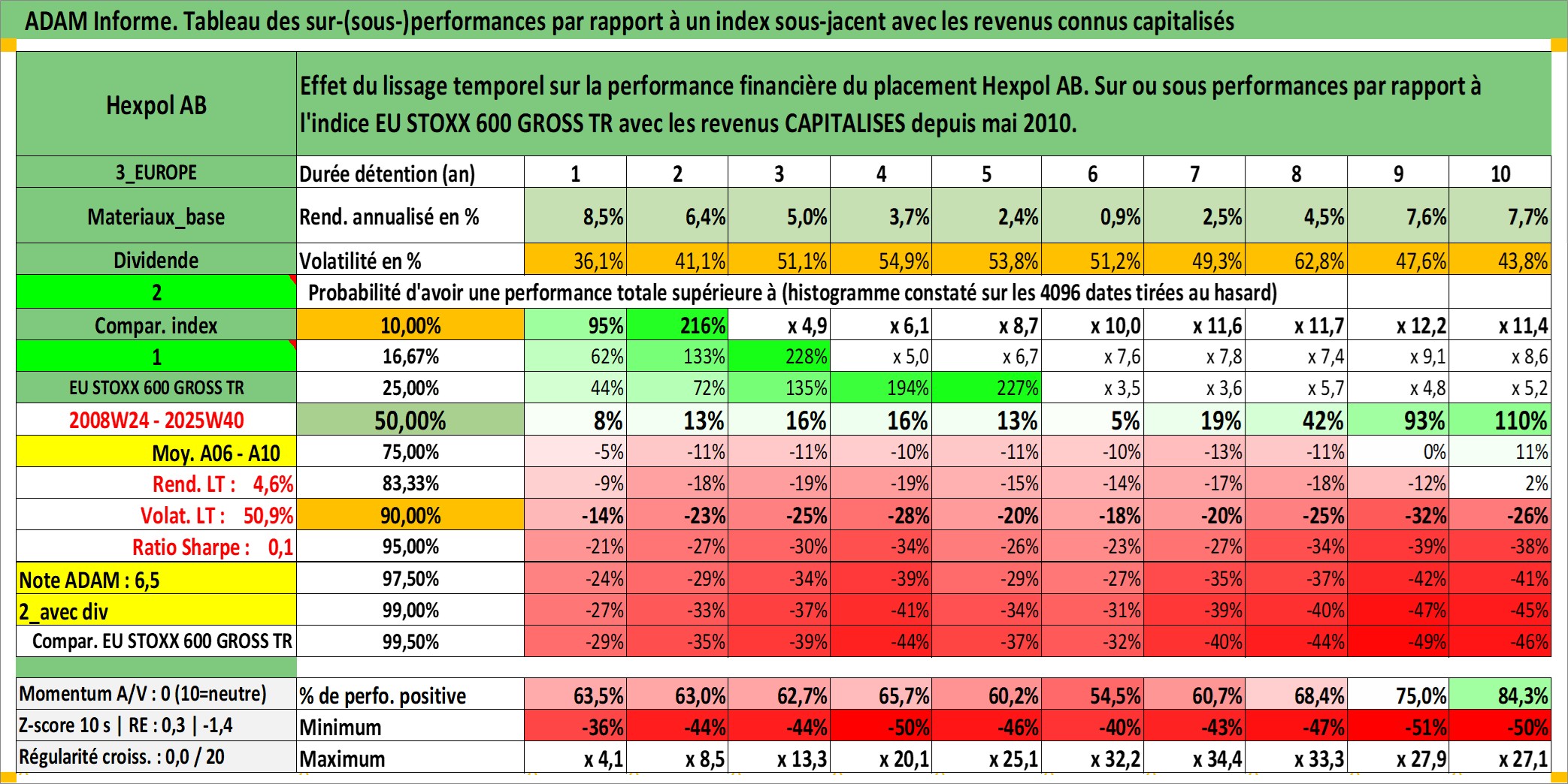 Site dédié aux investisseursPage dédiée sur site financeAnalyse des valorisations hebdomadaires de l'action Hexpol AB. Cet actif est cote en SEK. Les valorisations sont en contrevaleur EURO et couvrent les semaines 2008W24 a 2025W40. Les revenus de cet actif financier sont pris en compte depuis la semaine 2010W19. La note ESG de cet actif n'est pas connue.