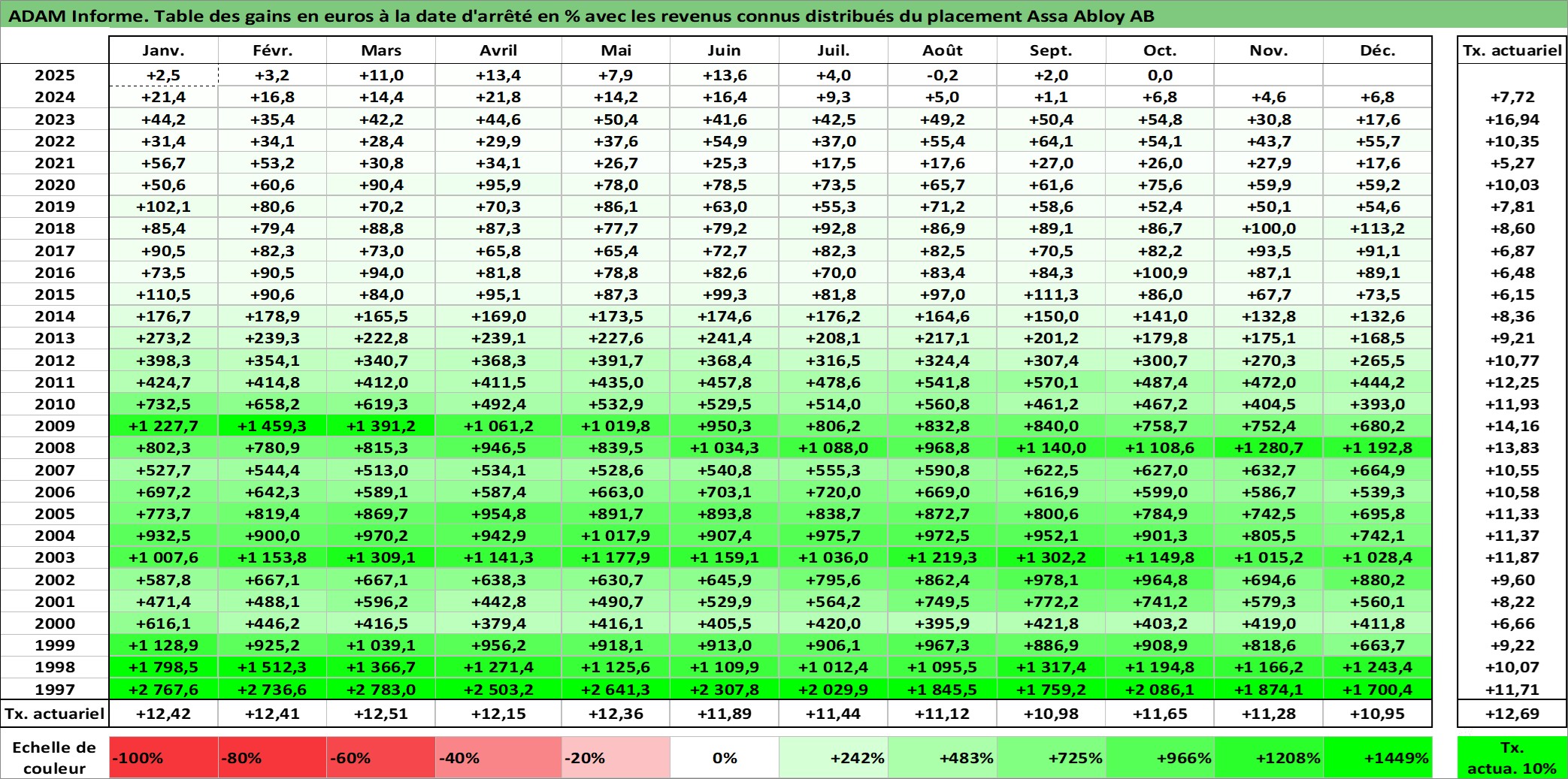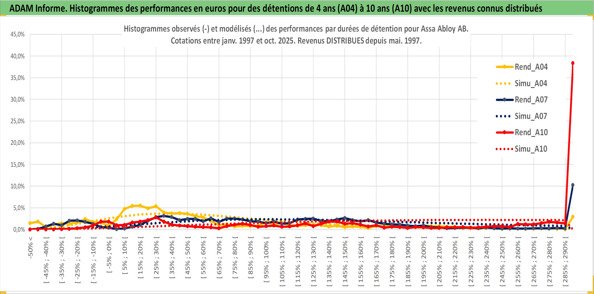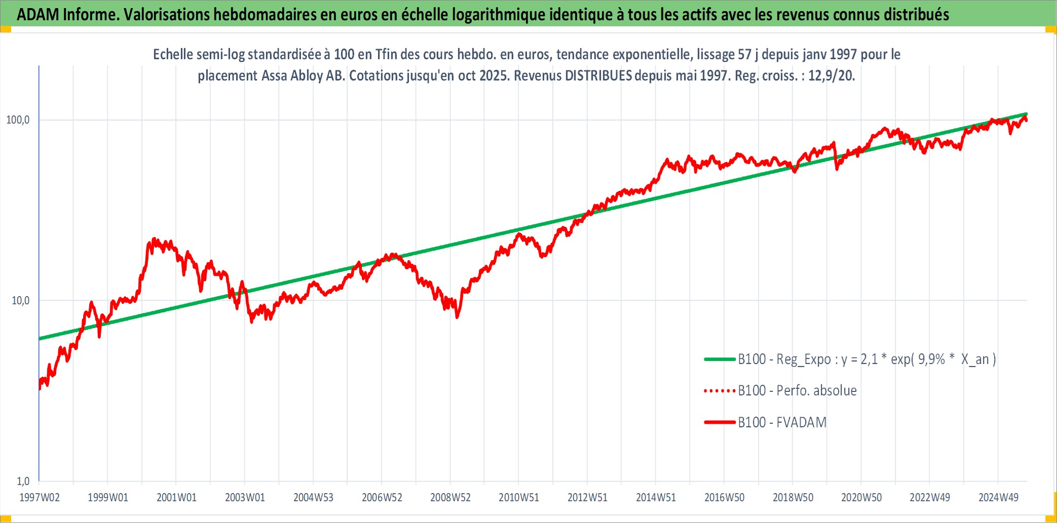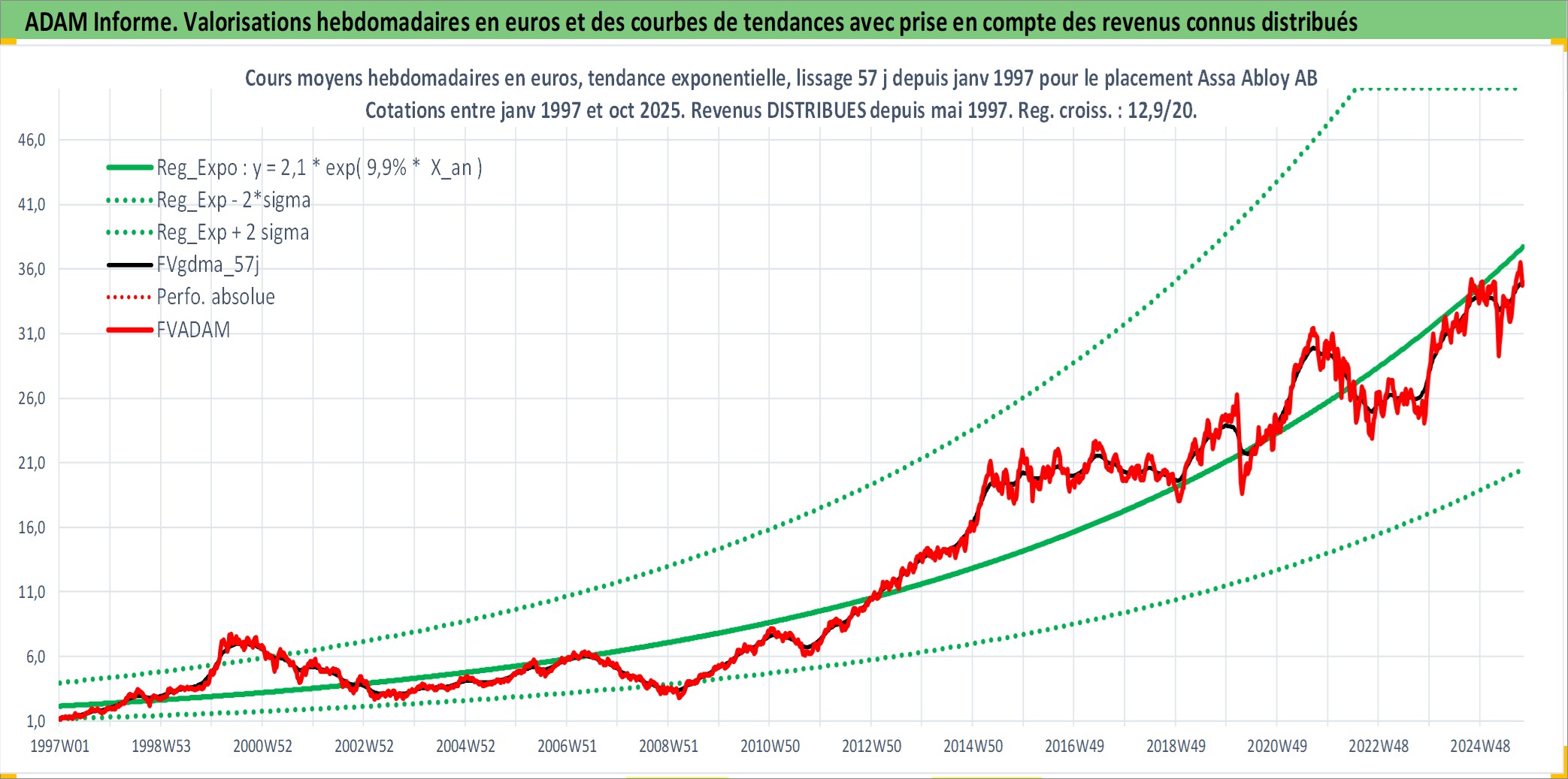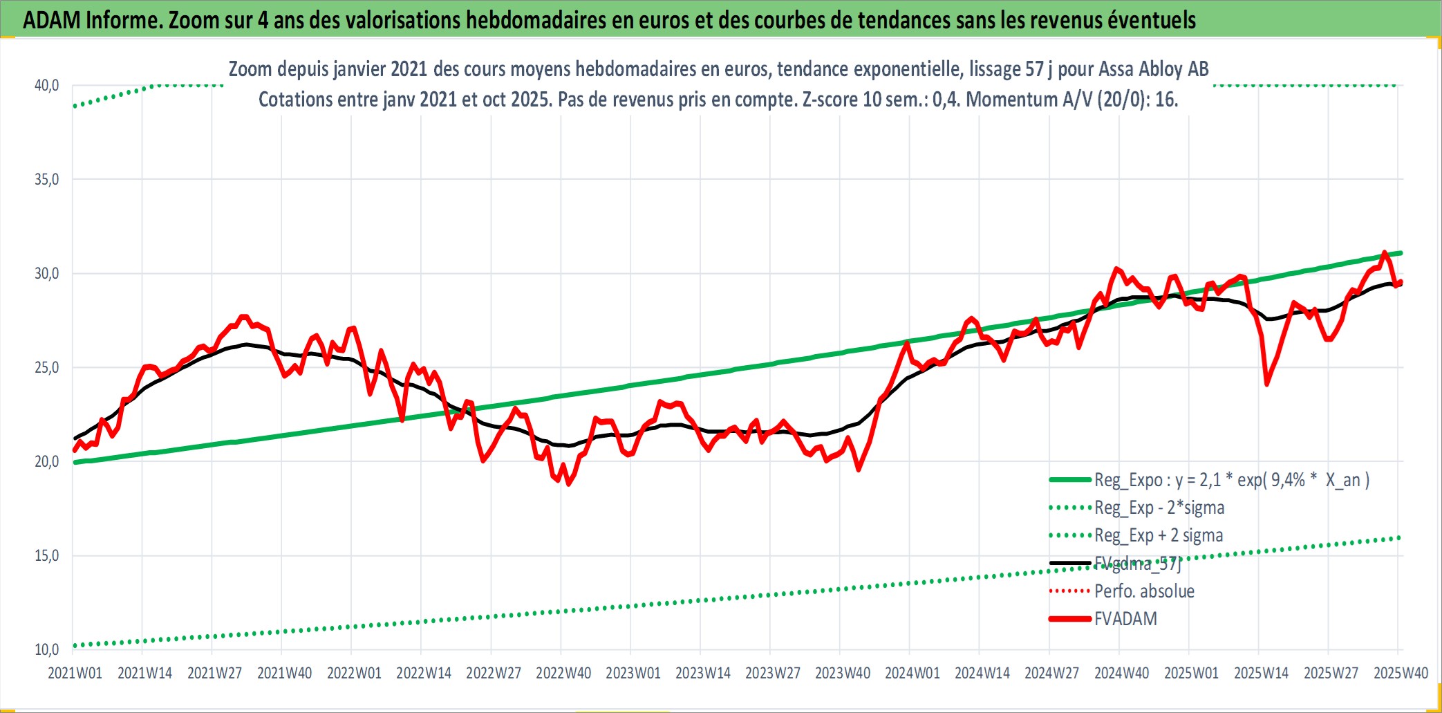 Site dédié aux investisseursPage dédiée sur site financeAnalyse des valorisations hebdomadaires de l'action Assa Abloy AB. Cet actif est cote en SEK. Les valorisations sont en contrevaleur EURO et couvrent les semaines 1997W01 a 2025W40. Les revenus de cet actif financier sont pris en compte depuis la semaine 1997W19. La note globale ESG de cet actif est estimee a 12.0 (apres rebasage entre 0 et 20).