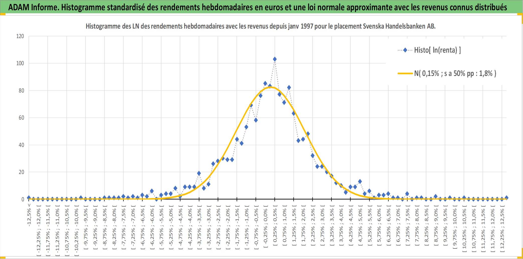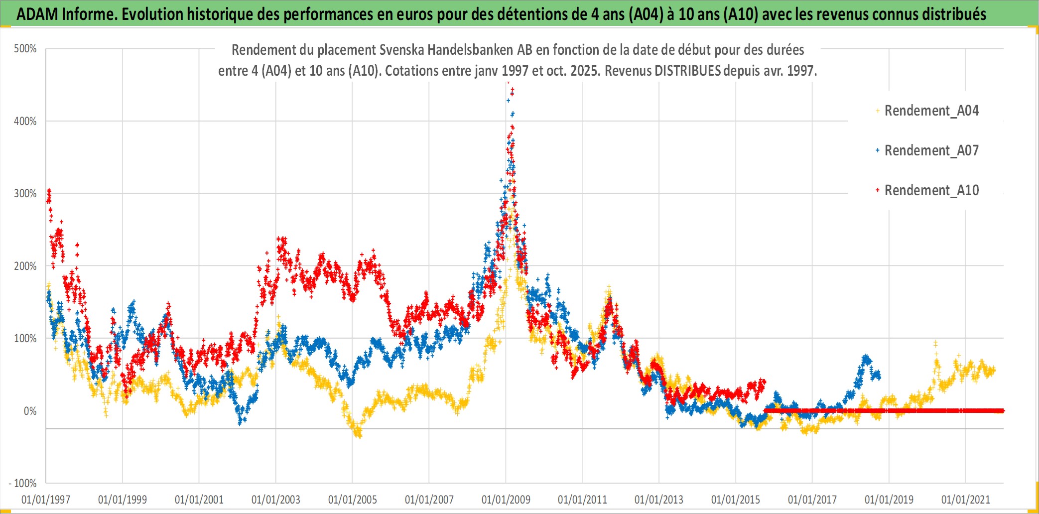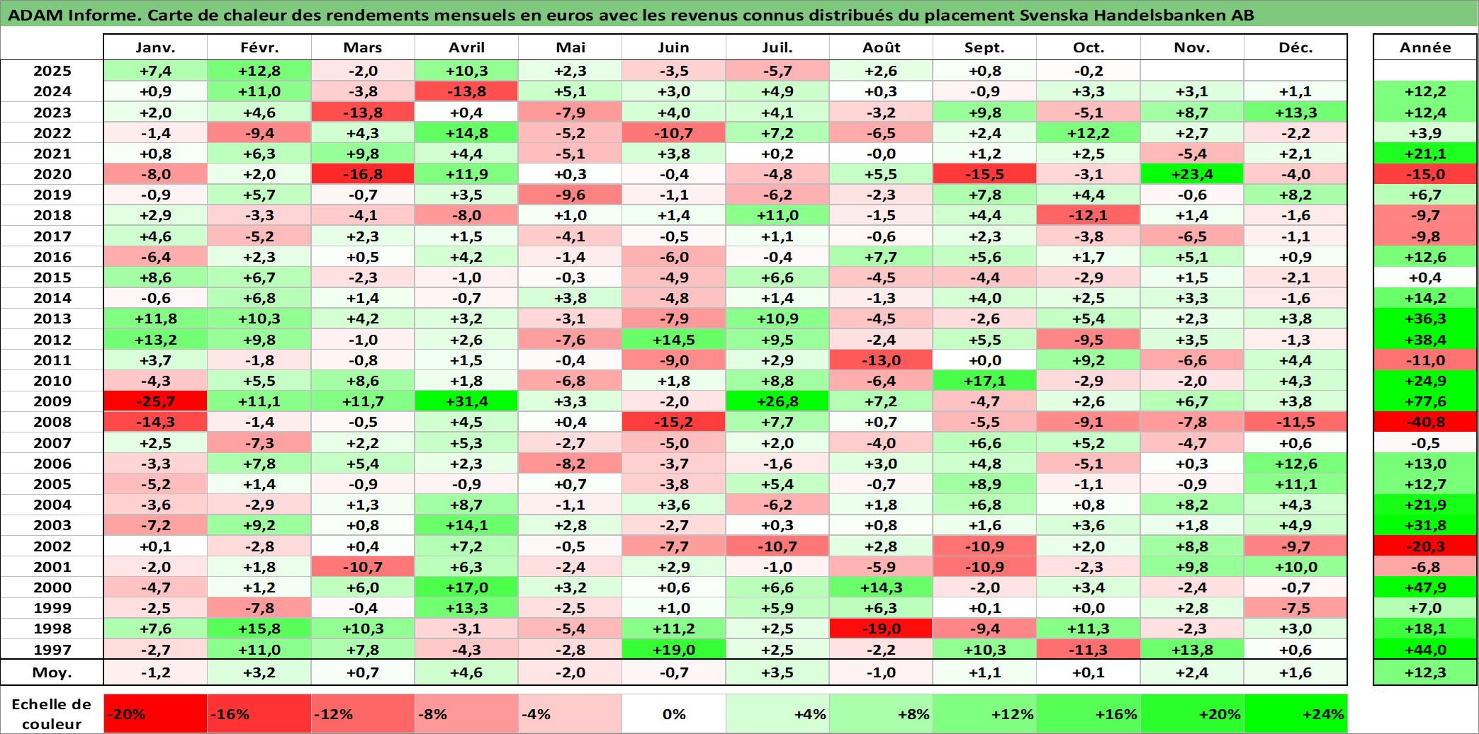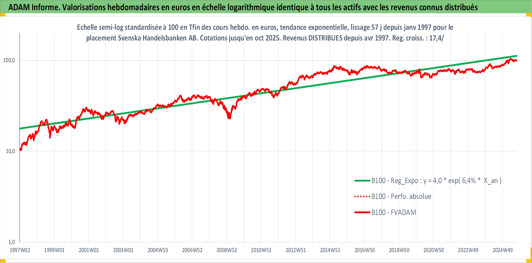 Site dédié aux investisseursPage dédiée sur site financeAnalyse des valorisations hebdomadaires de l'action Svenska Handelsbanken AB. Cet actif est cote en SEK. Les valorisations sont en contrevaleur EURO et couvrent les semaines 1997W01 a 2025W40. Les revenus de cet actif financier sont pris en compte depuis la semaine 1997W17. La note globale ESG de cet actif est estimee a 12.0 (apres rebasage entre 0 et 20).