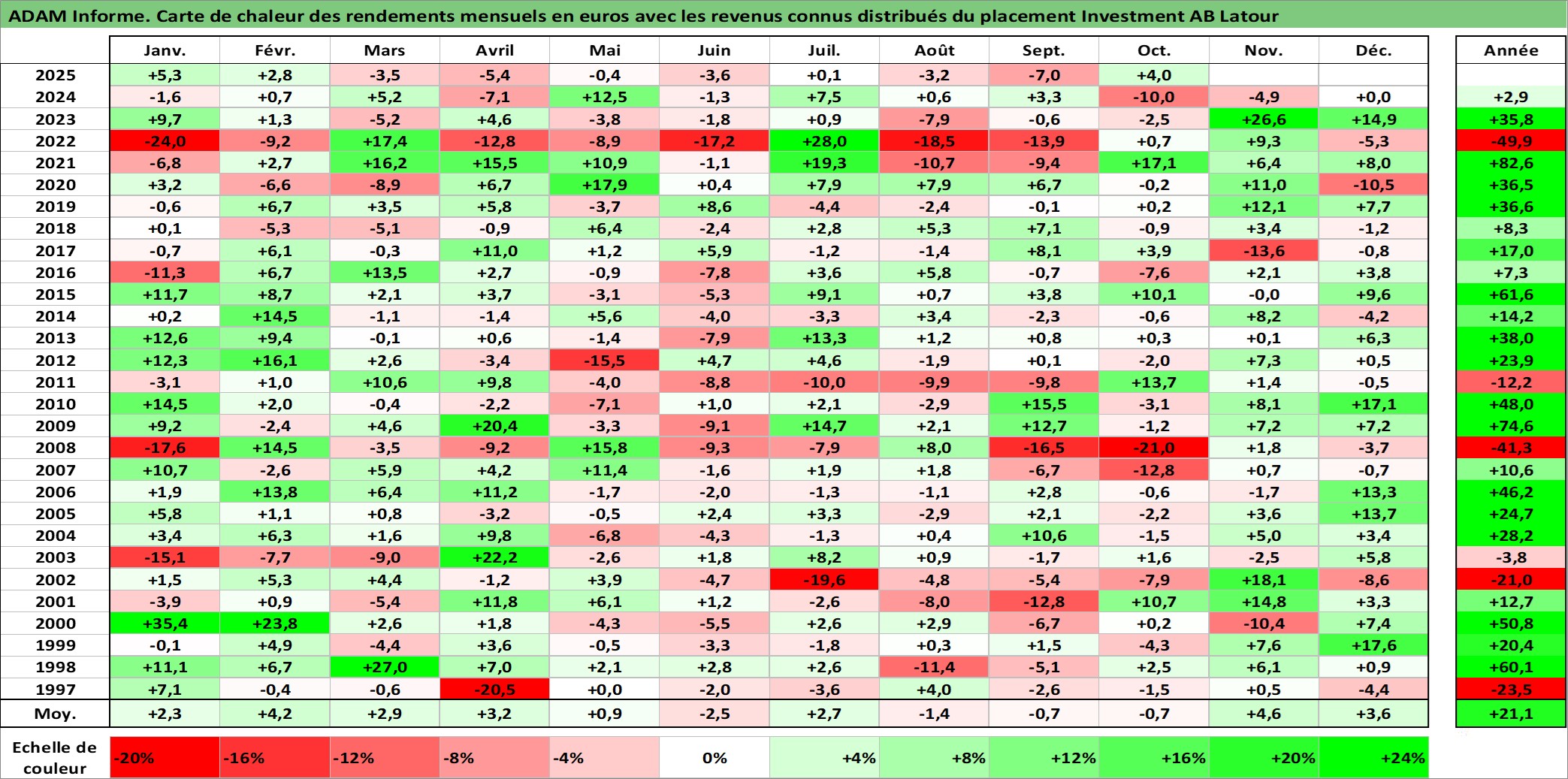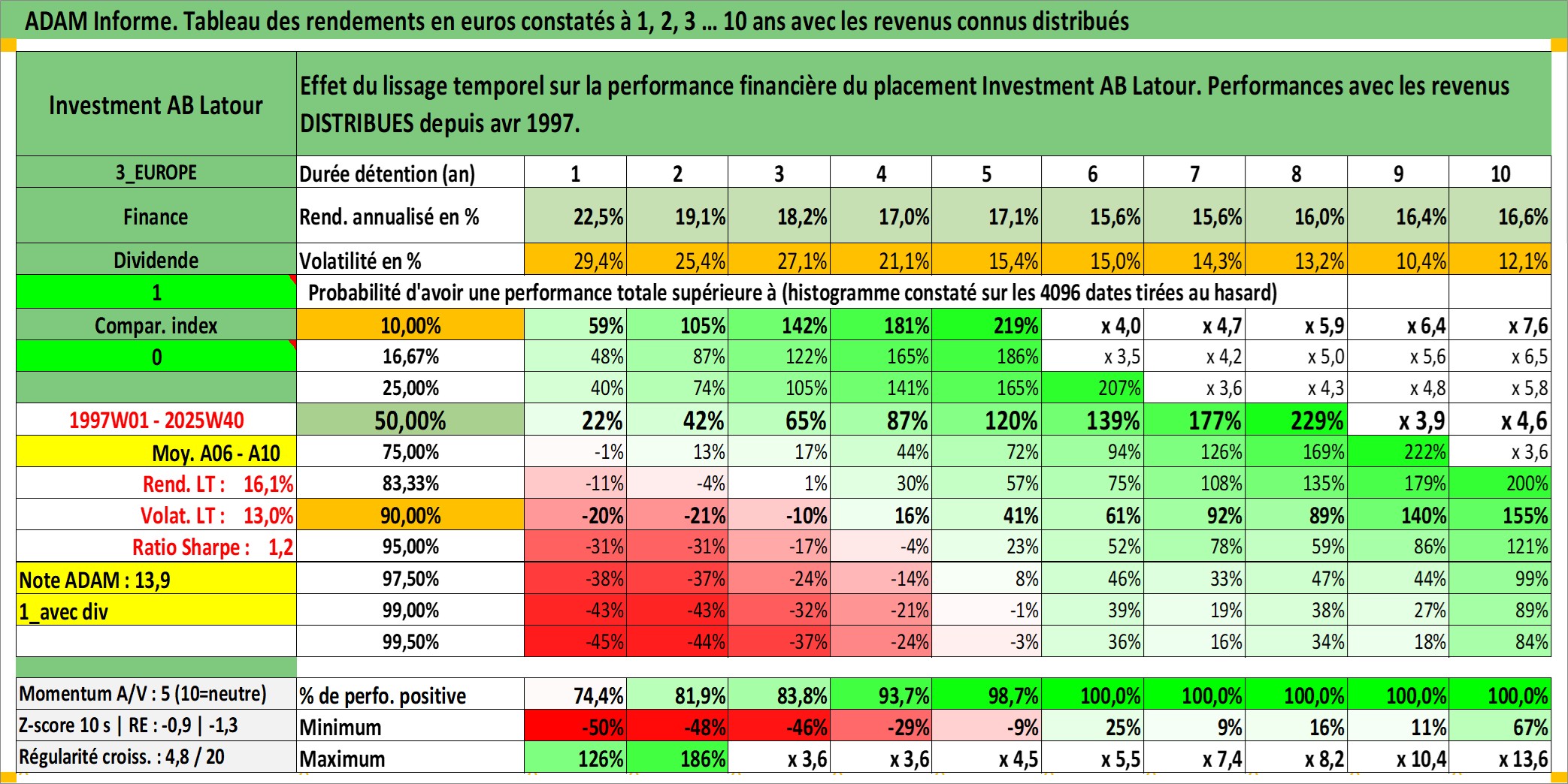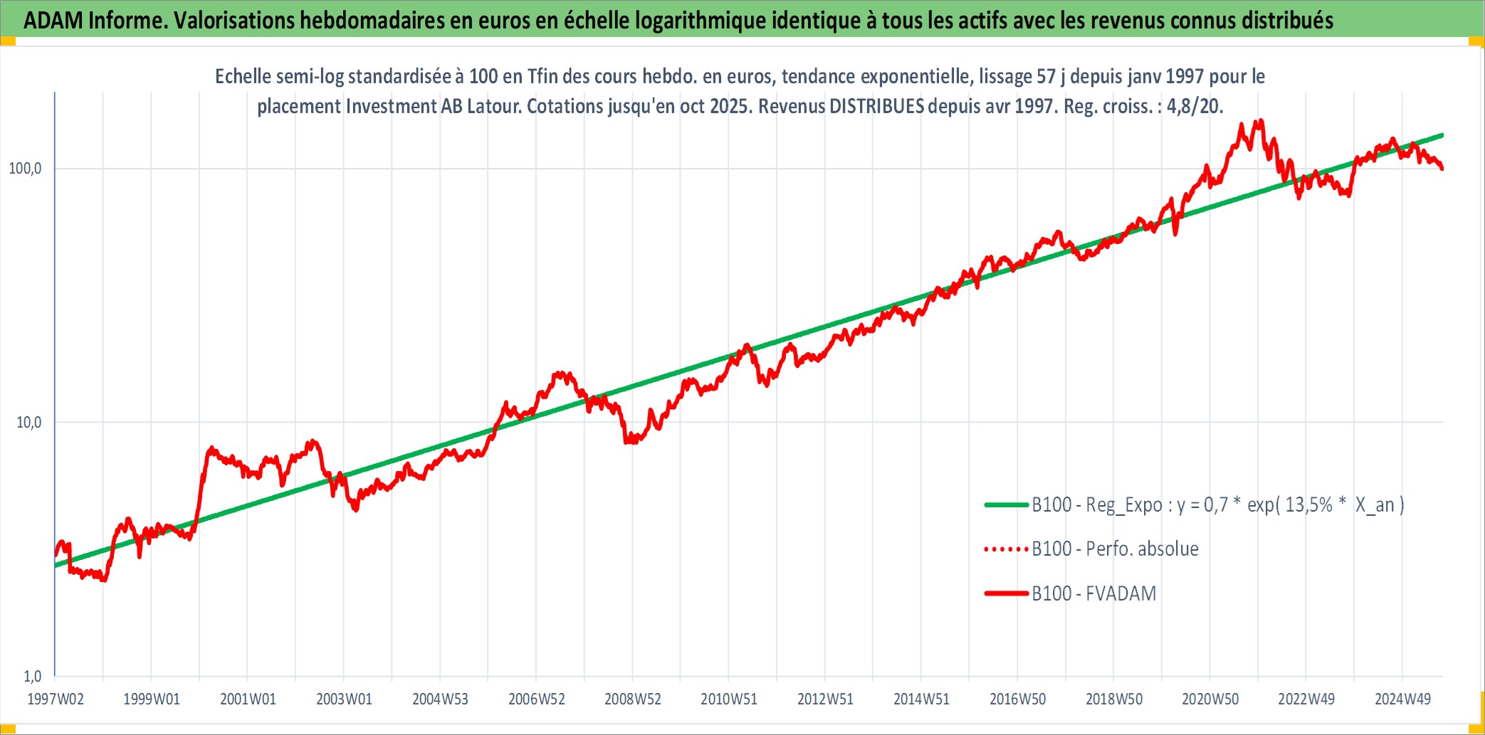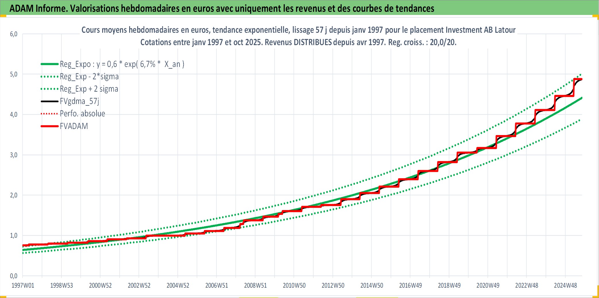 Site dédié aux investisseursPage dédiée sur site financeAnalyse des valorisations hebdomadaires de l'action Investment AB Latour. Cet actif est cote en SEK. Les valorisations sont en contrevaleur EURO et couvrent les semaines 1997W01 a 2025W40. Les revenus de cet actif financier sont pris en compte depuis la semaine 1997W17. La note ESG de cet actif n'est pas connue.