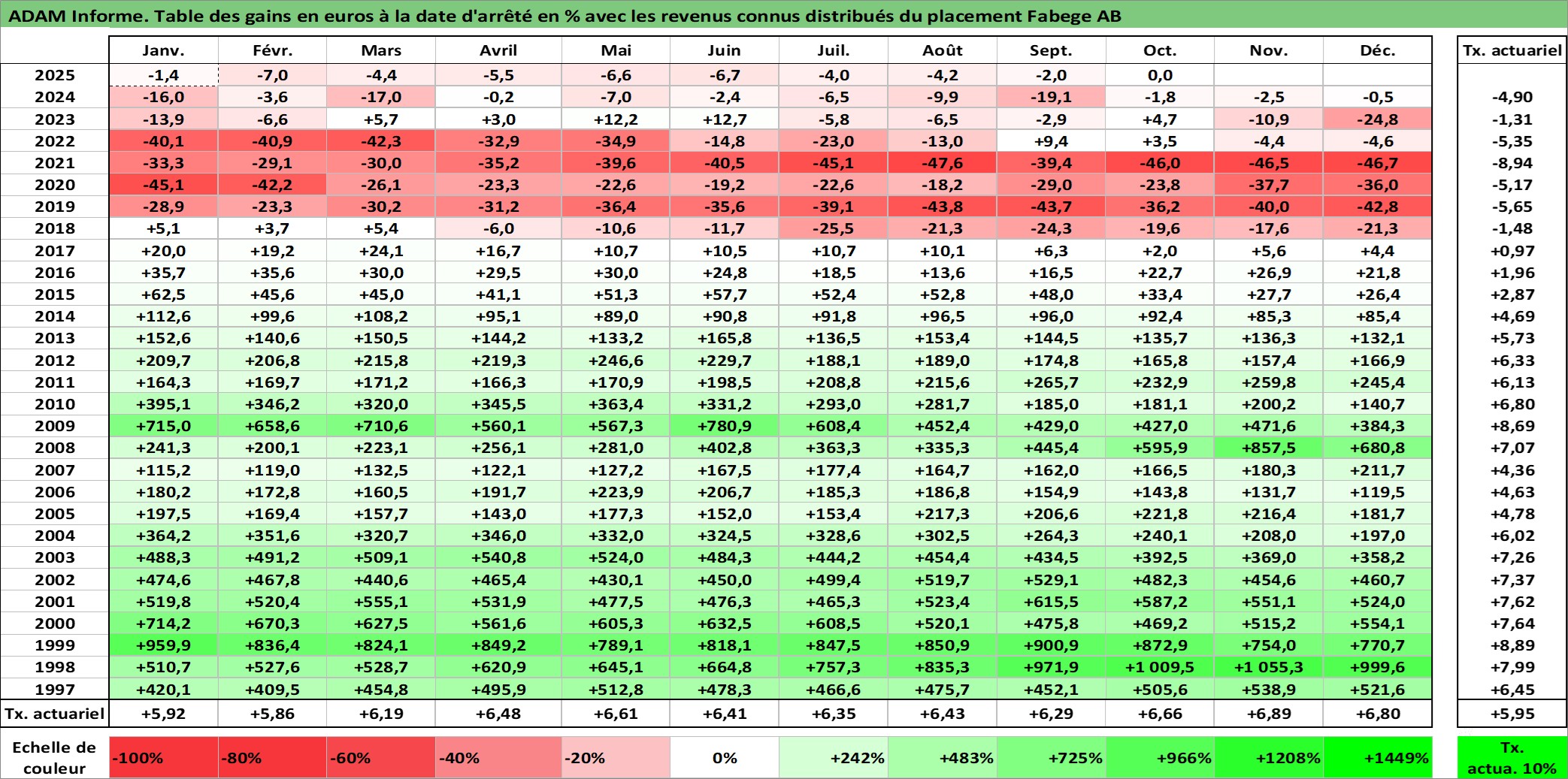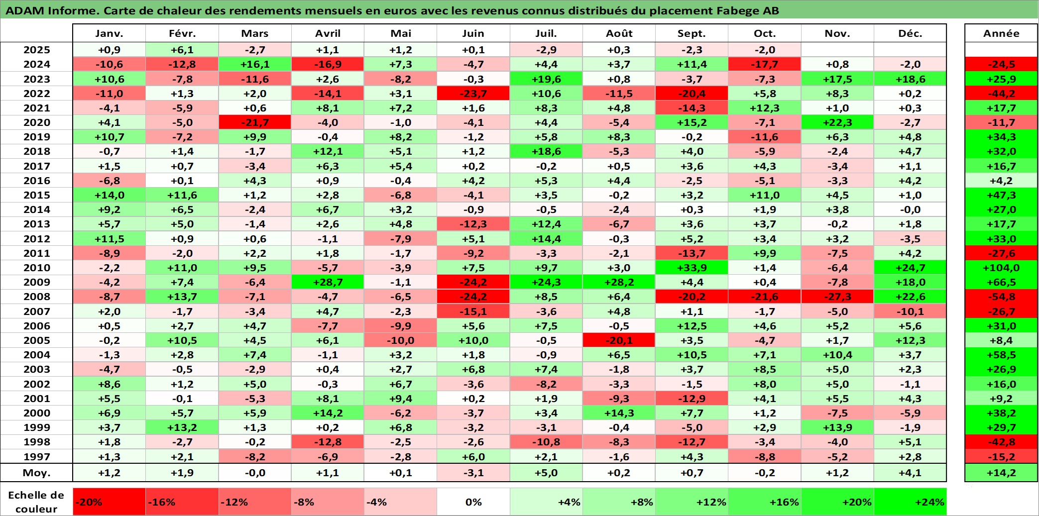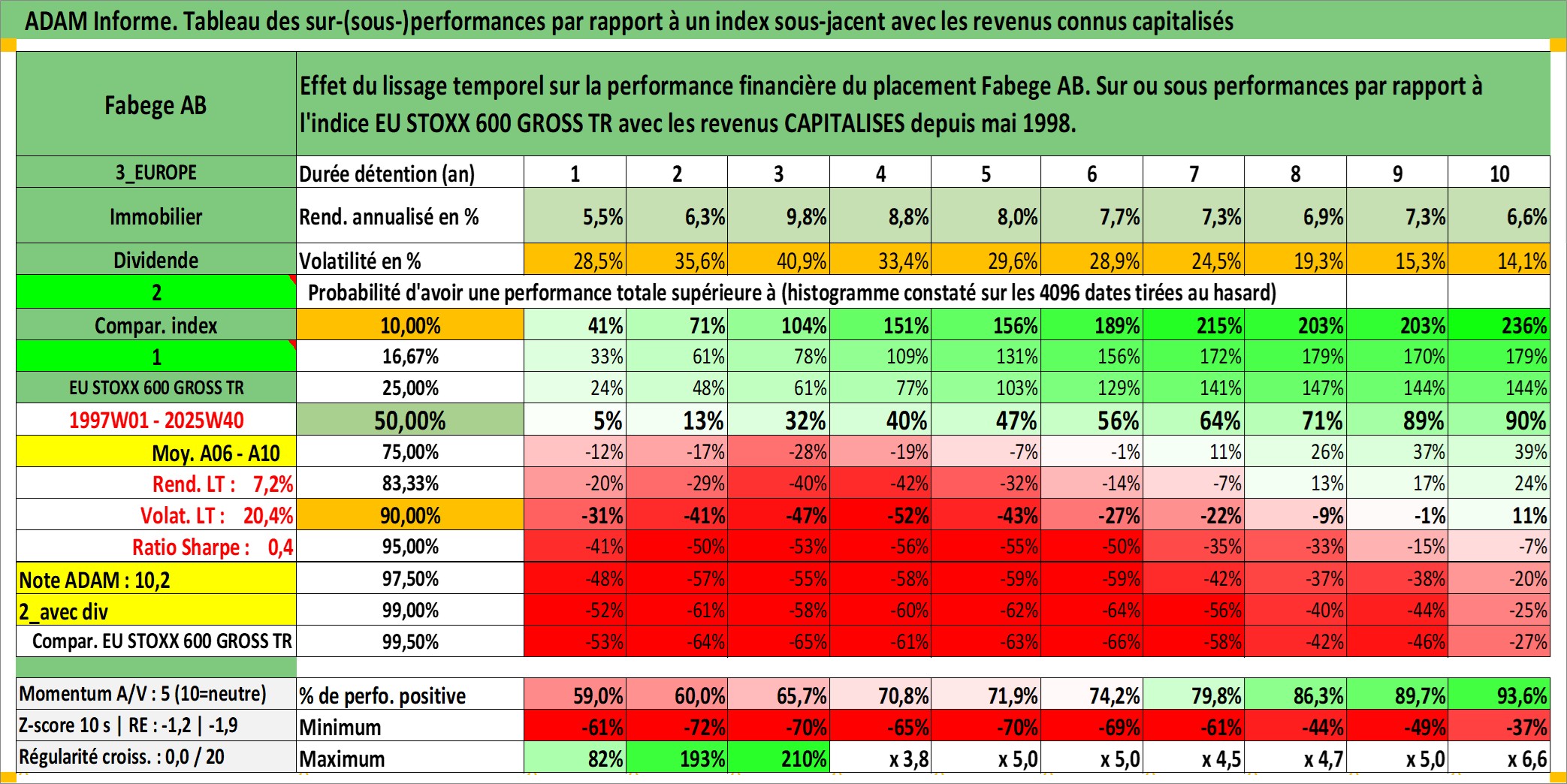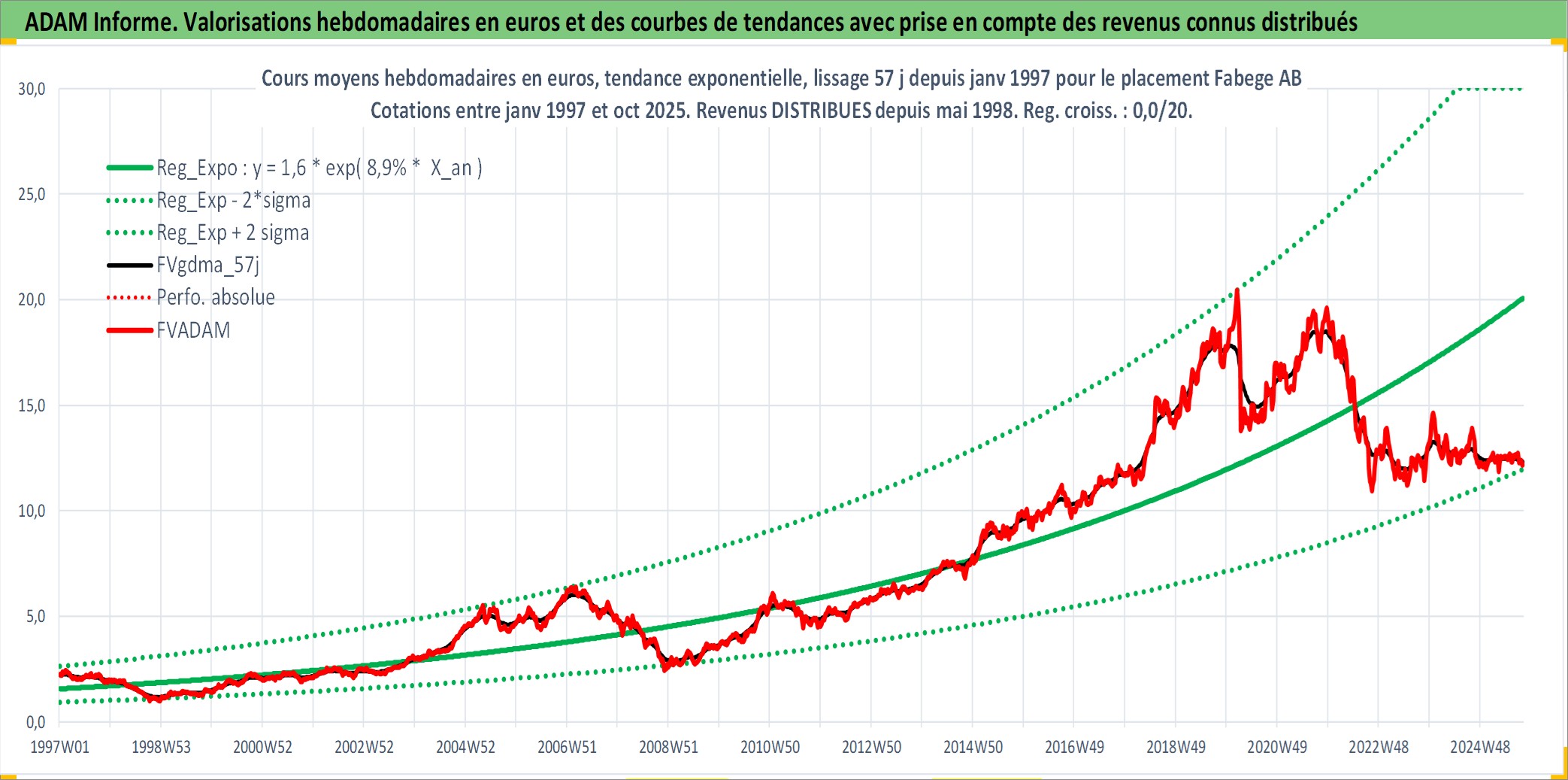 Site dédié aux investisseursPage dédiée sur site financeAnalyse des valorisations hebdomadaires de l'action Fabege AB. Cet actif est cote en SEK. Les valorisations sont en contrevaleur EURO et couvrent les semaines 1997W01 a 2025W40. Les revenus de cet actif financier sont pris en compte depuis la semaine 1998W19. La note ESG de cet actif n'est pas connue.