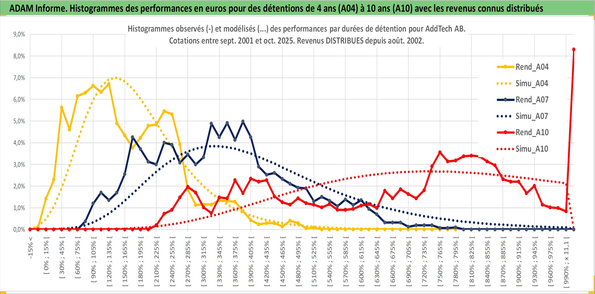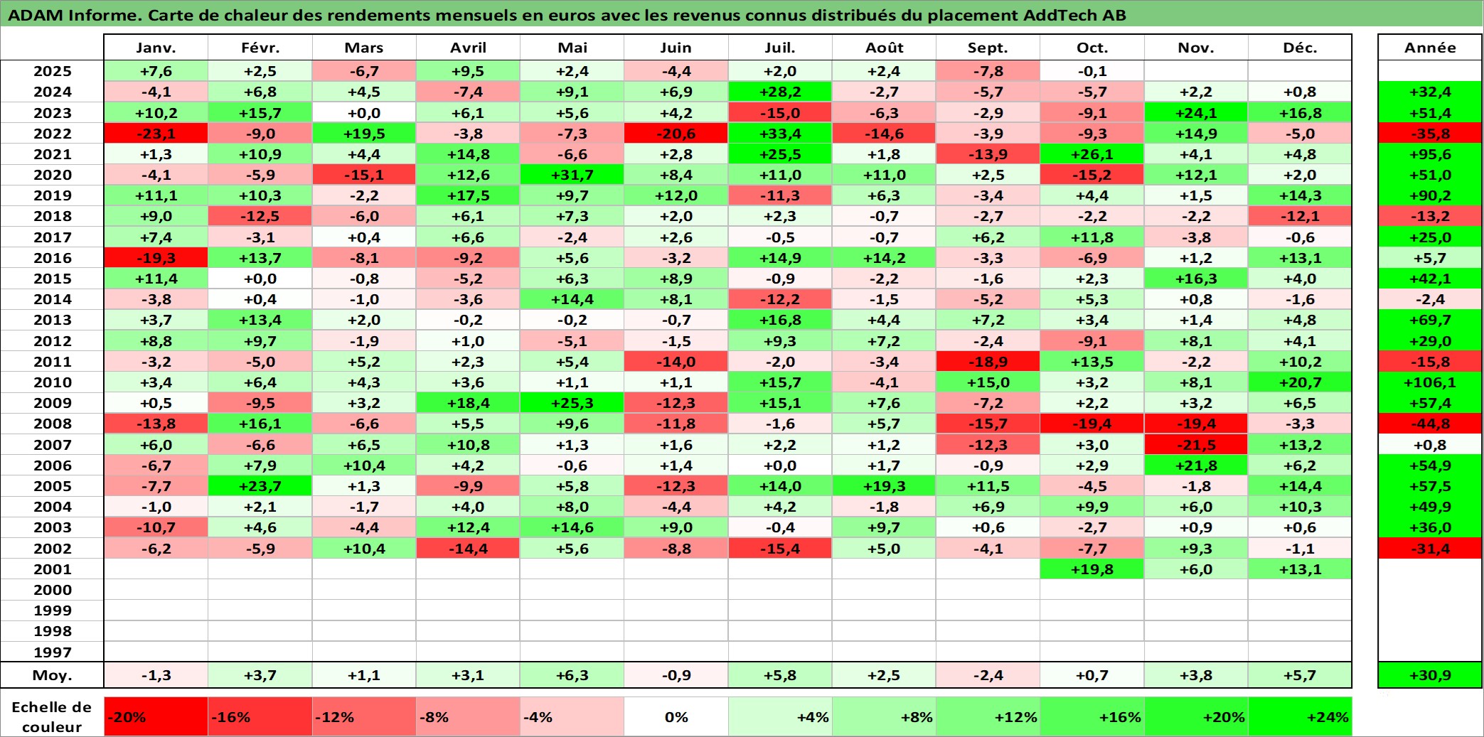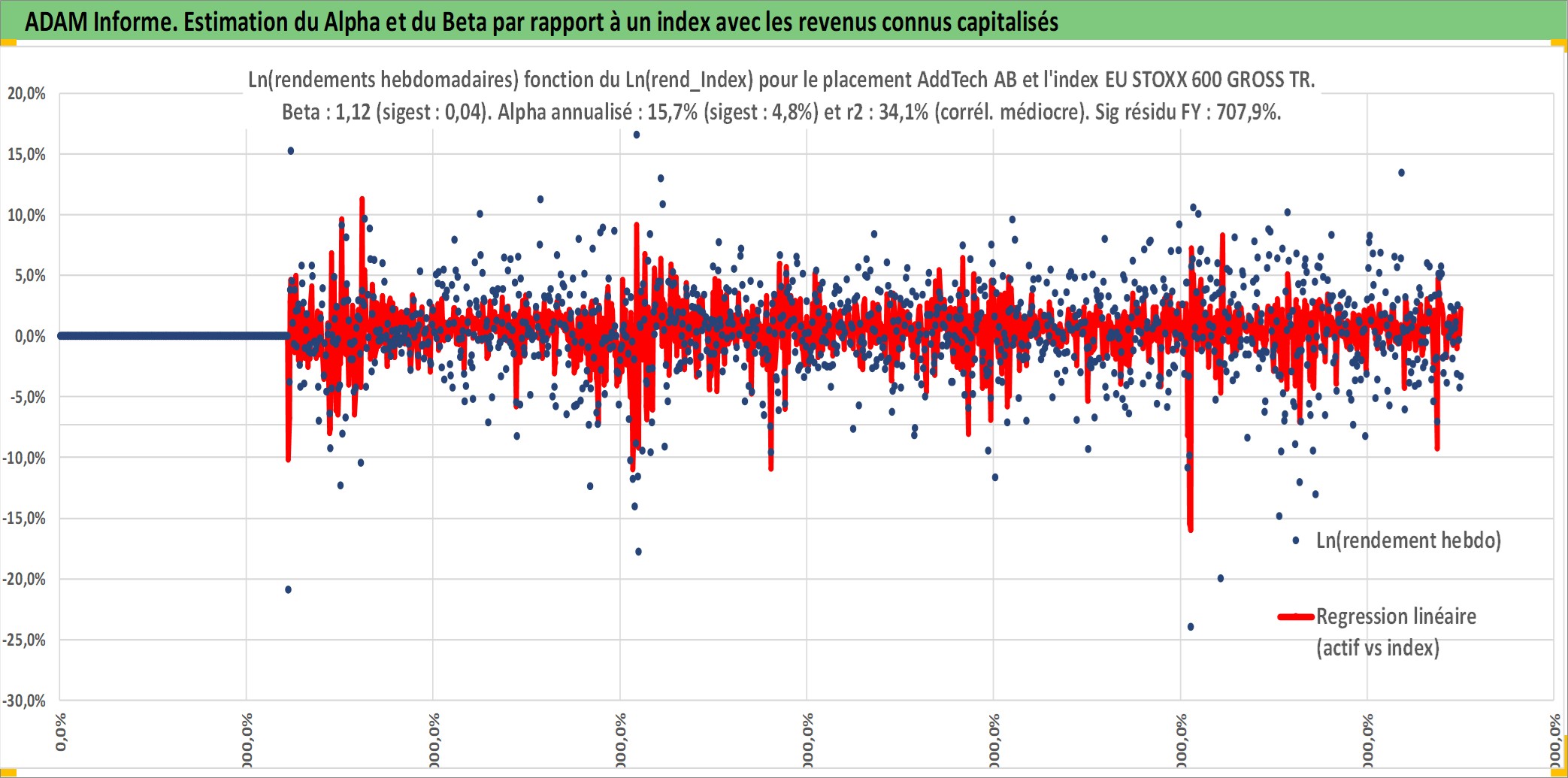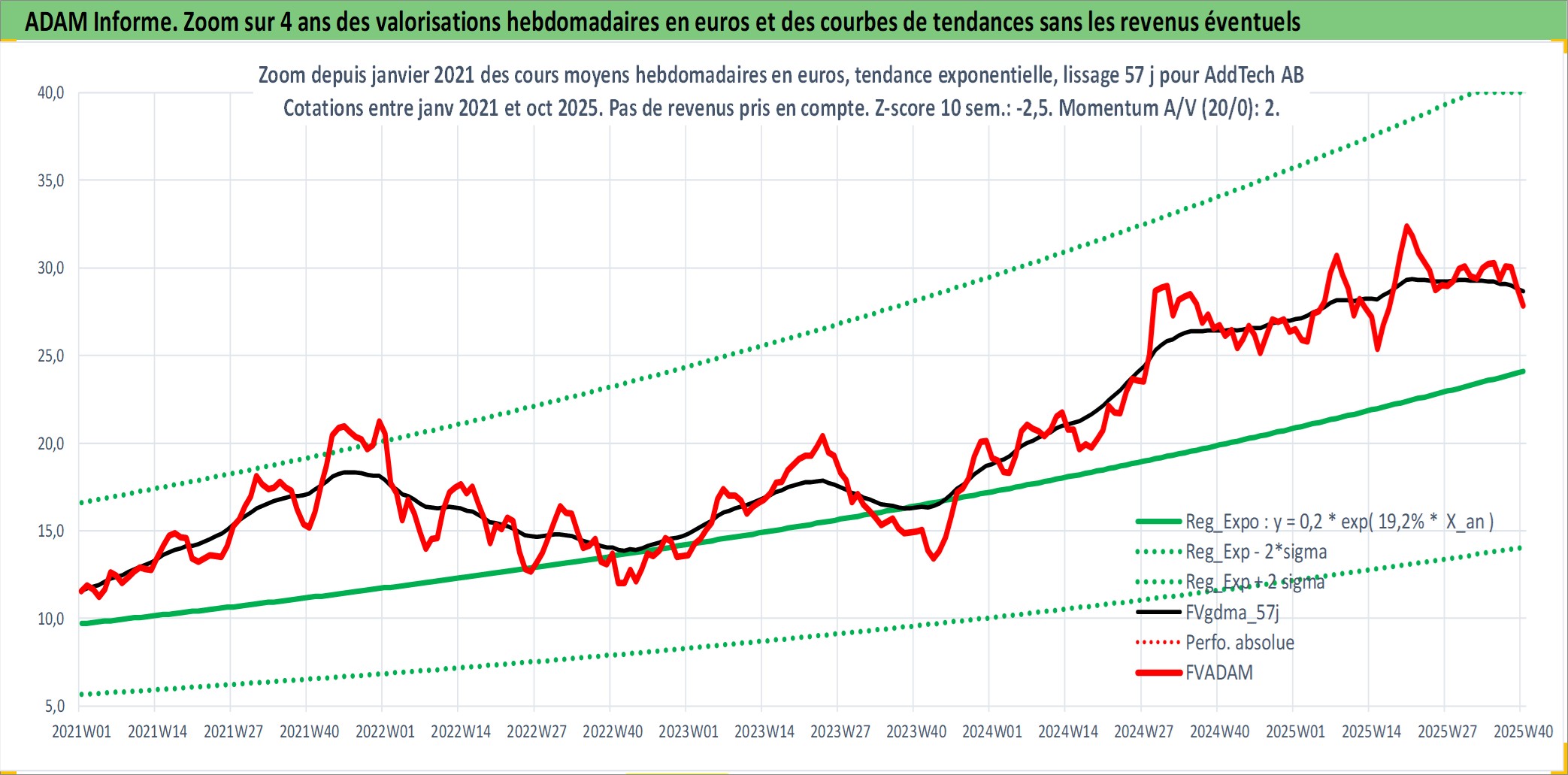 Site dédié aux investisseursPage dédiée sur site financeAnalyse des valorisations hebdomadaires de l'action AddTech AB. Cet actif est cote en SEK. Les valorisations sont en contrevaleur EURO et couvrent les semaines 2001W36 a 2025W40. Les revenus de cet actif financier sont pris en compte depuis la semaine 2002W34. La note ESG de cet actif n'est pas connue.
