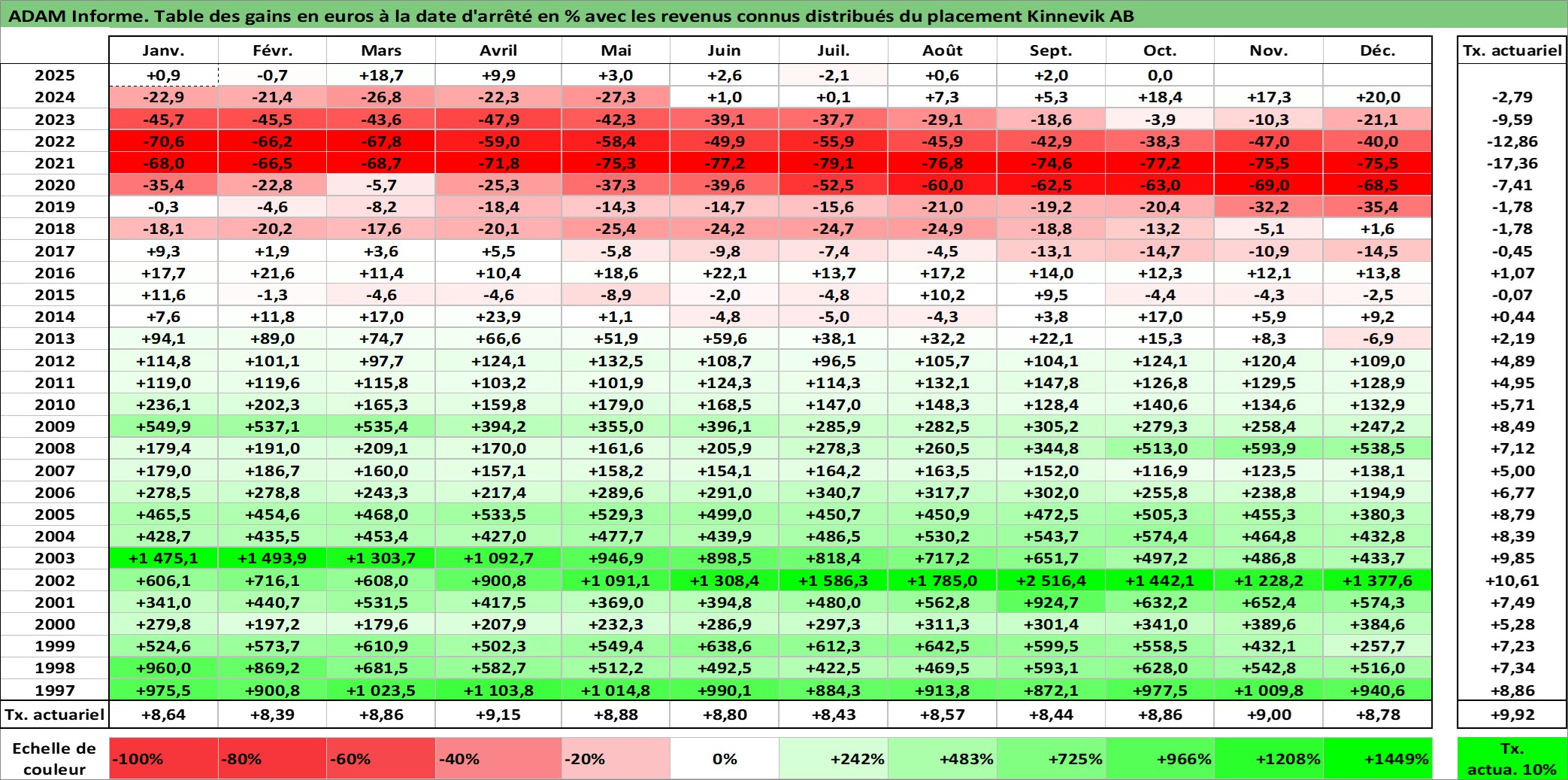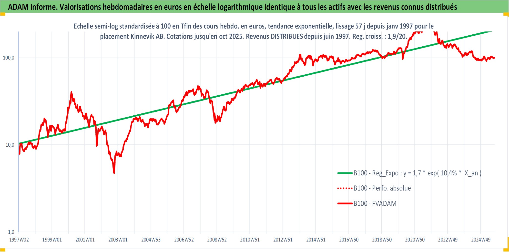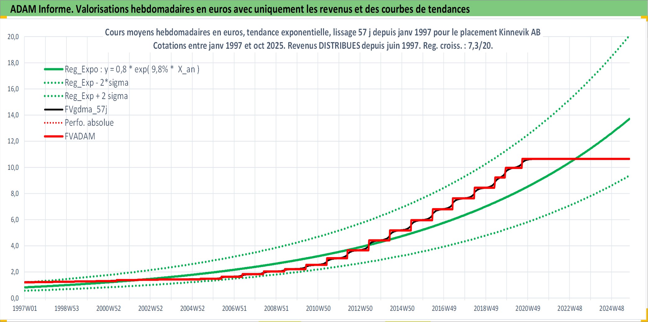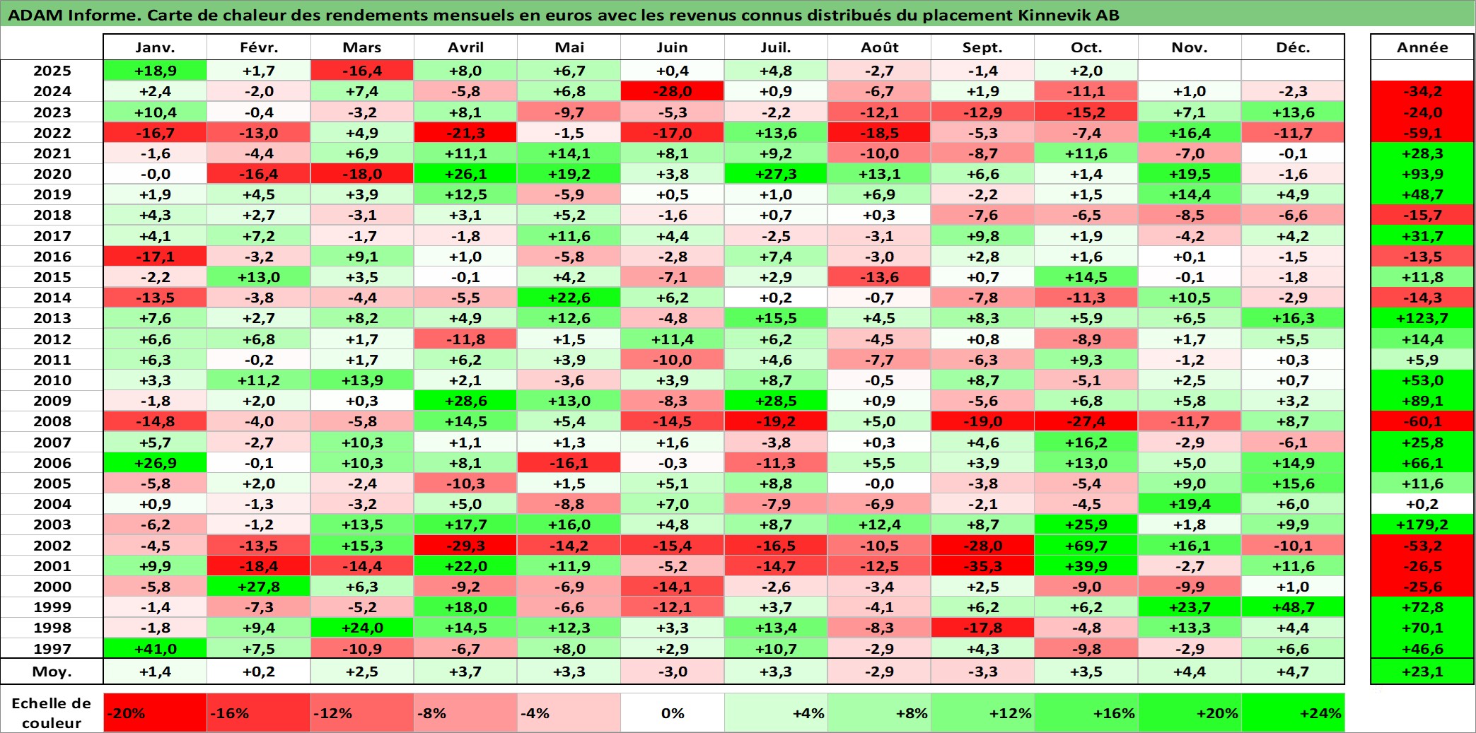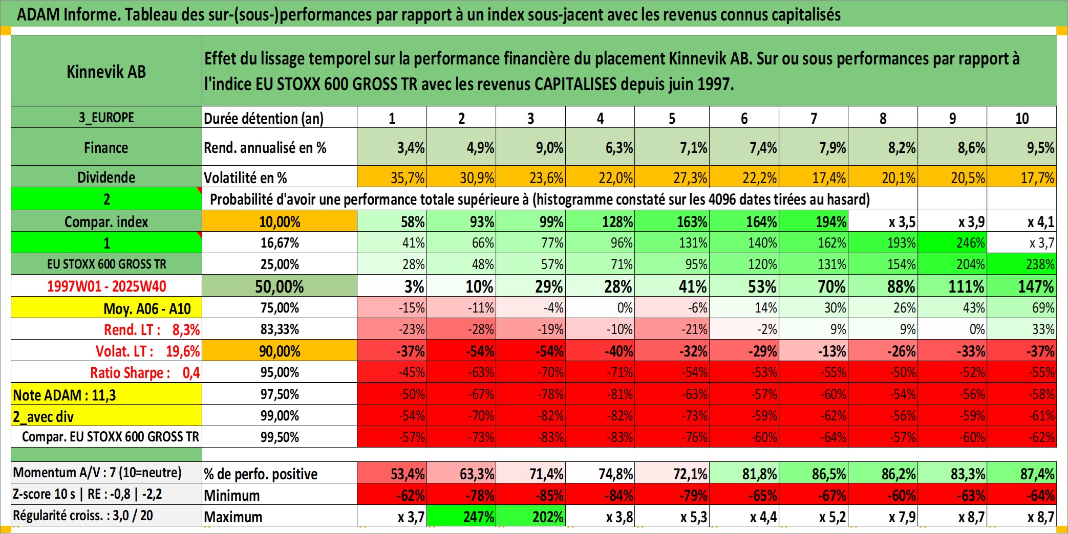 Site dédié aux investisseursPage dédiée sur site financeAnalyse des valorisations hebdomadaires de l'action Kinnevik AB. Cet actif est cote en SEK. Les valorisations sont en contrevaleur EURO et couvrent les semaines 1997W01 a 2025W40. Les revenus de cet actif financier sont pris en compte depuis la semaine 1997W26. La note globale ESG de cet actif est estimee a 18.0 (apres rebasage entre 0 et 20).