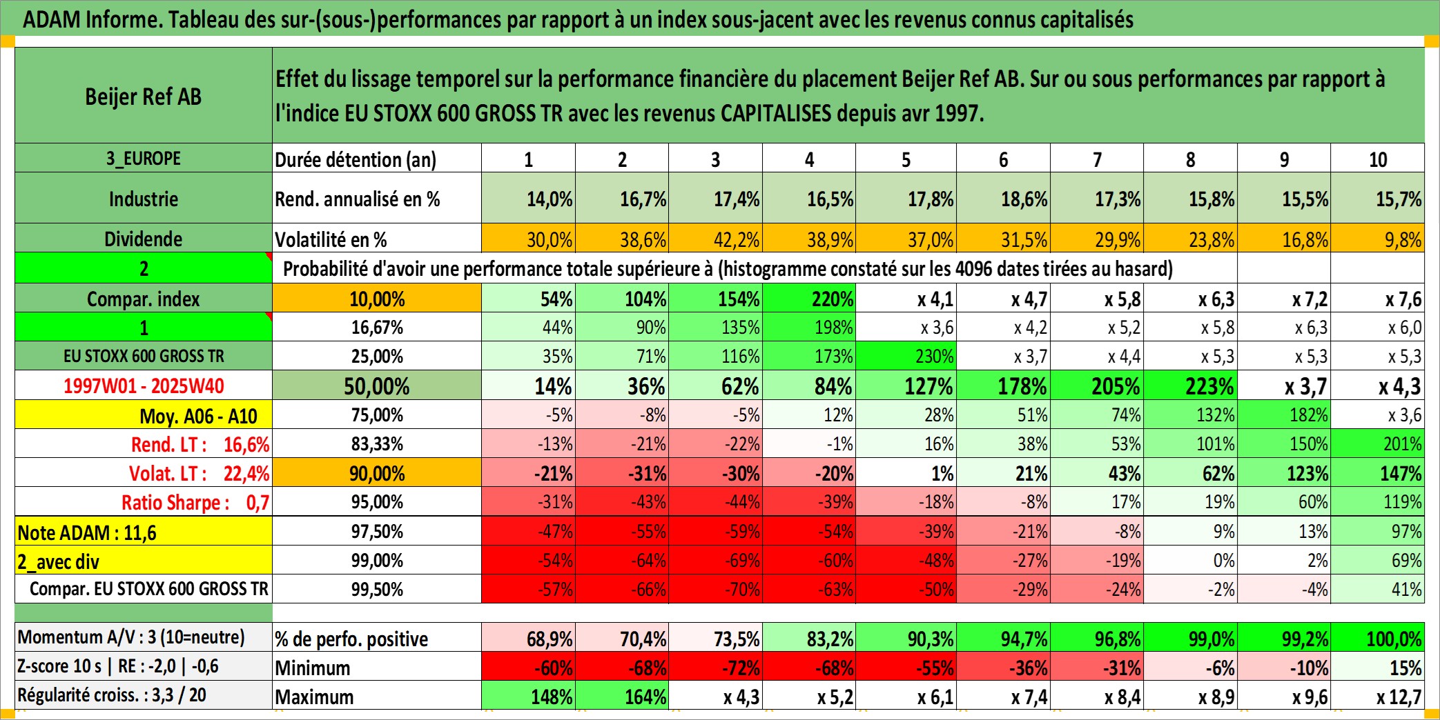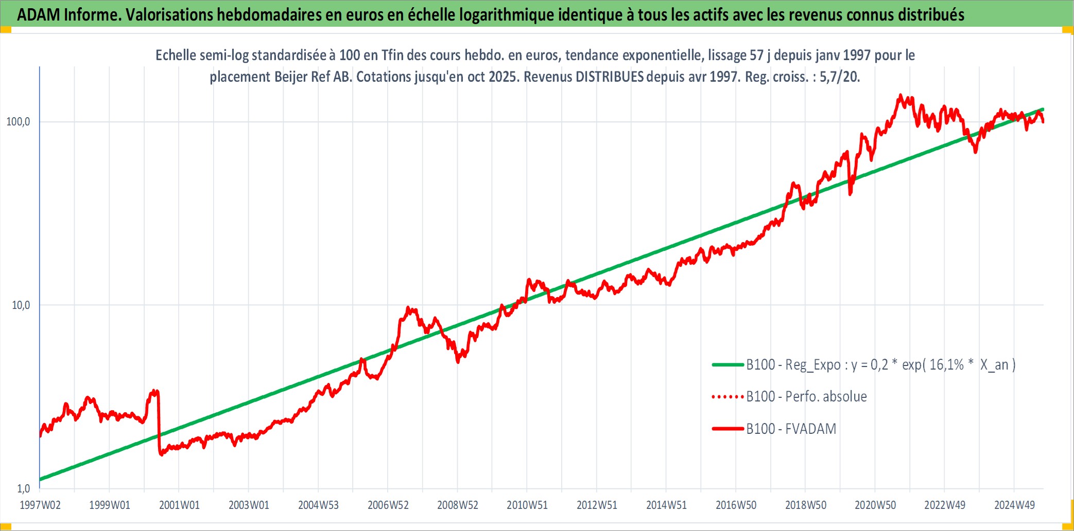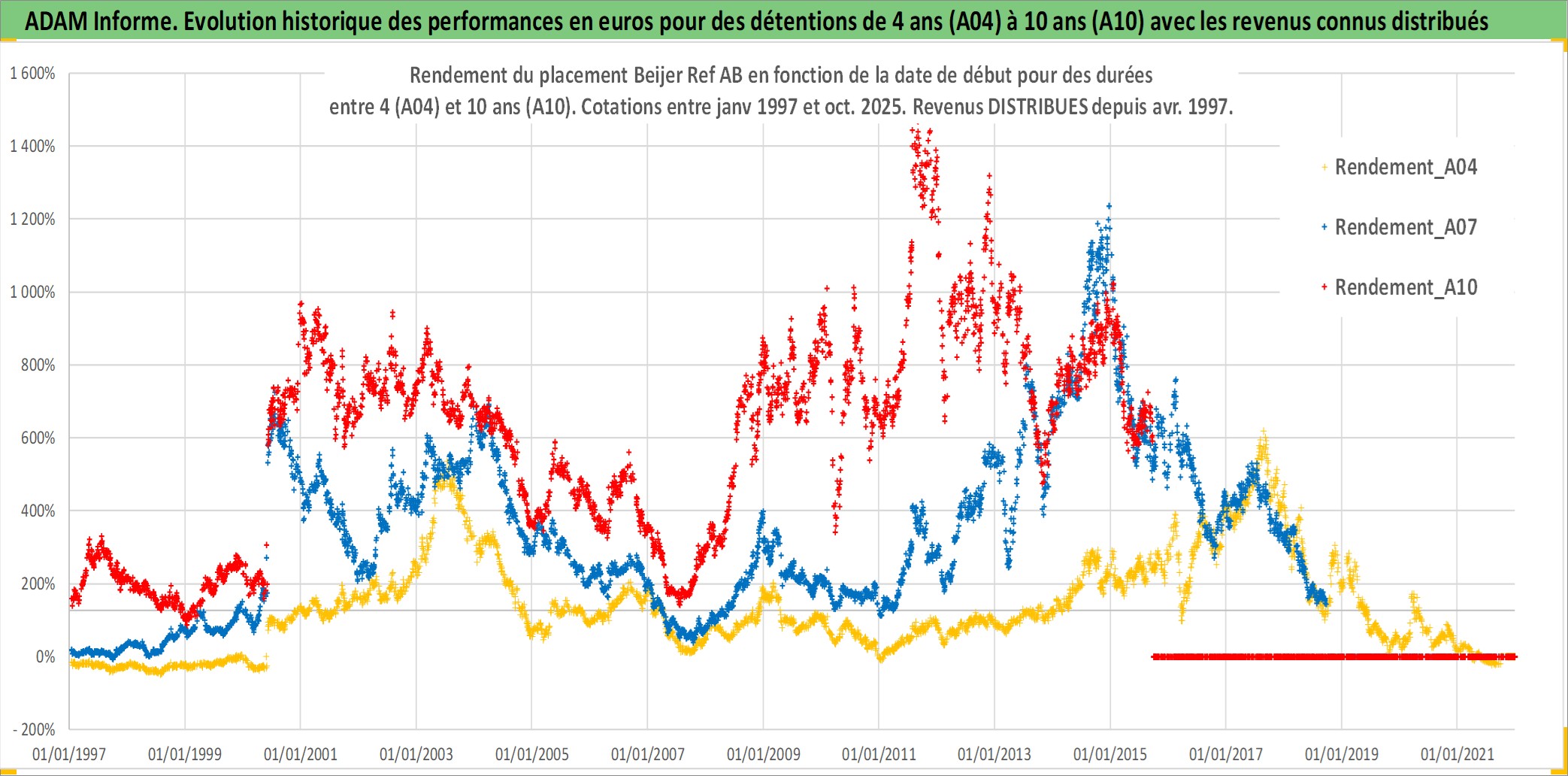 Site dédié aux investisseursPage dédiée sur site financeAnalyse des valorisations hebdomadaires de l'action Beijer Ref AB. Cet actif est cote en SEK. Les valorisations sont en contrevaleur EURO et couvrent les semaines 1997W01 a 2025W40. Les revenus de cet actif financier sont pris en compte depuis la semaine 1997W17. La note globale ESG de cet actif est estimee a 5.0 (apres rebasage entre 0 et 20).