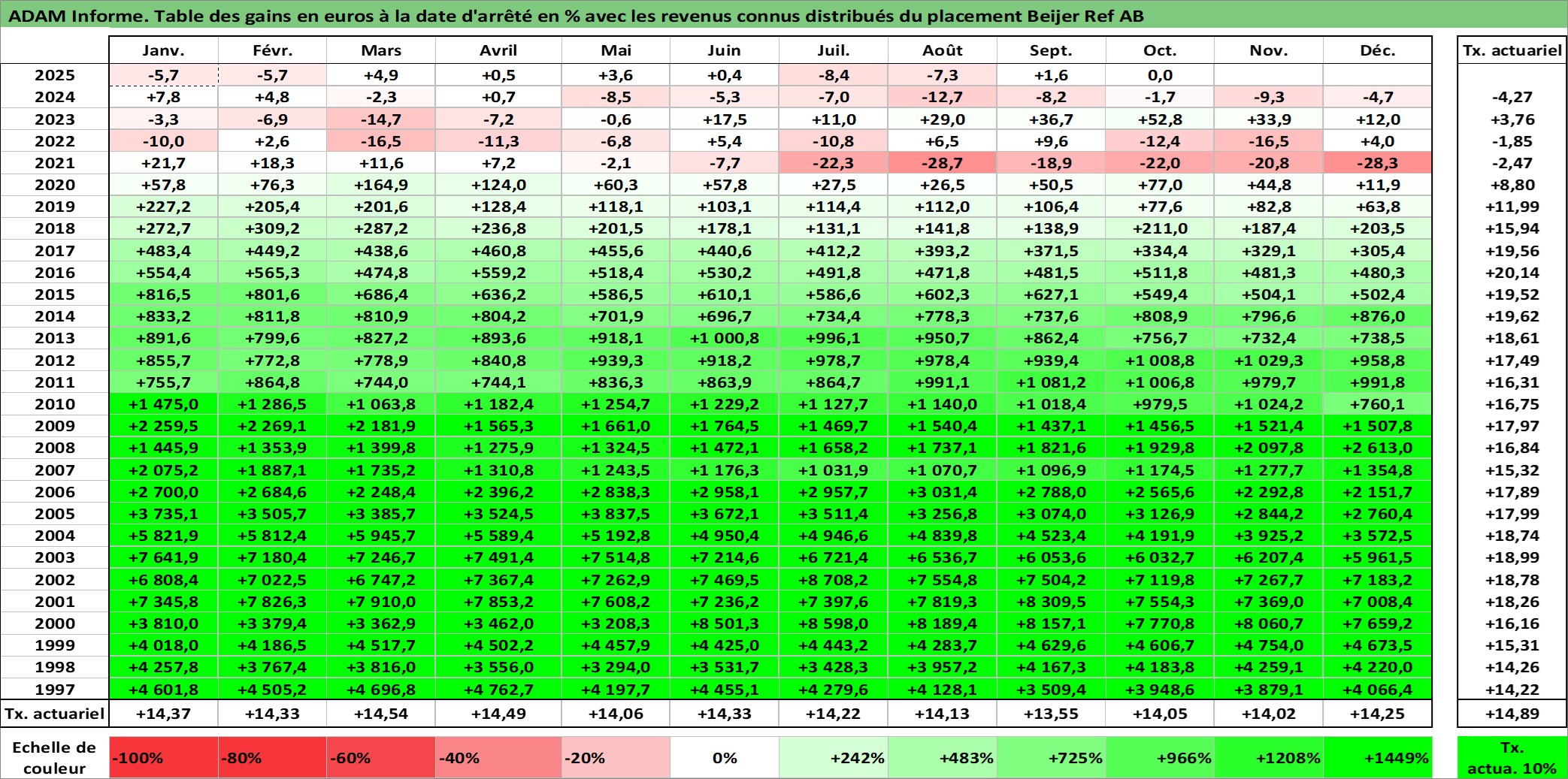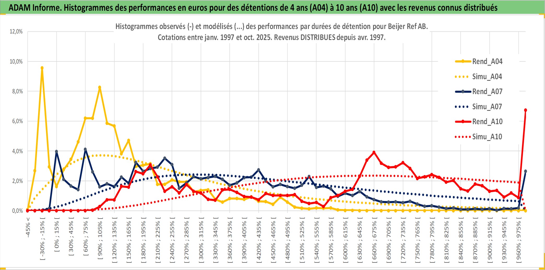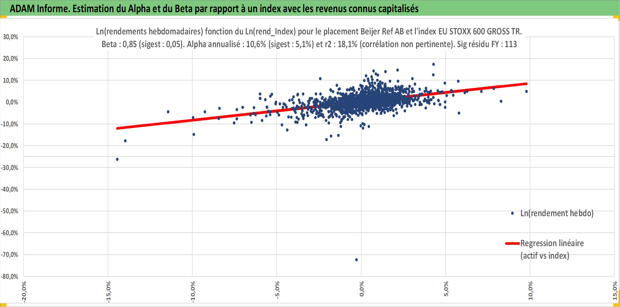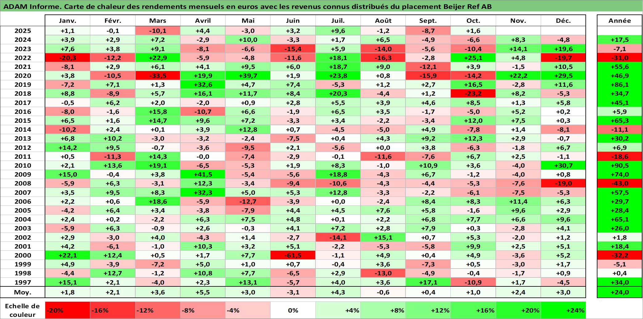 Site dédié aux investisseursPage dédiée sur site financeAnalyse des valorisations hebdomadaires de l'action Beijer Ref AB. Cet actif est cote en SEK. Les valorisations sont en contrevaleur EURO et couvrent les semaines 1997W01 a 2025W40. Les revenus de cet actif financier sont pris en compte depuis la semaine 1997W17. La note globale ESG de cet actif est estimee a 5.0 (apres rebasage entre 0 et 20).