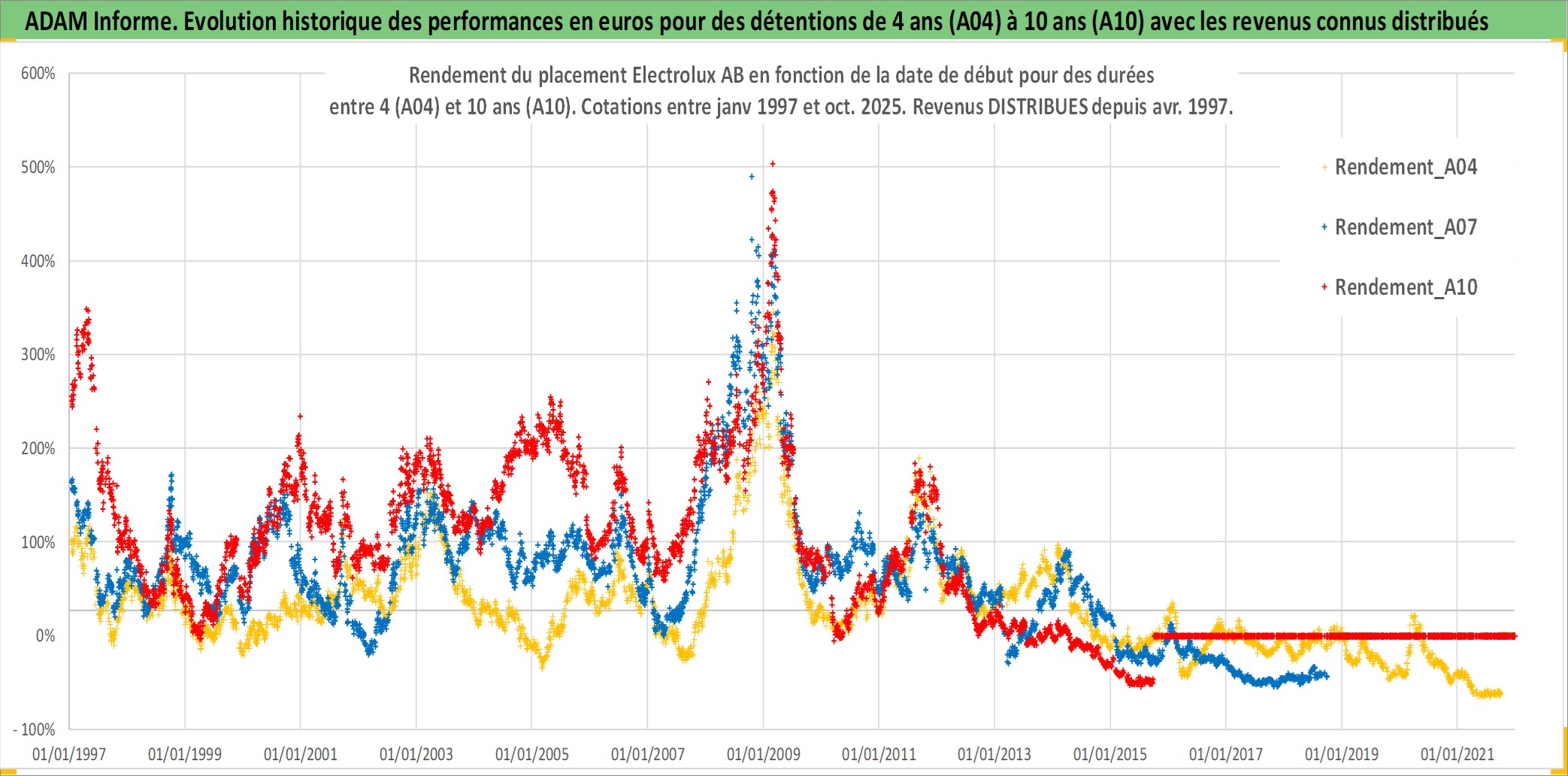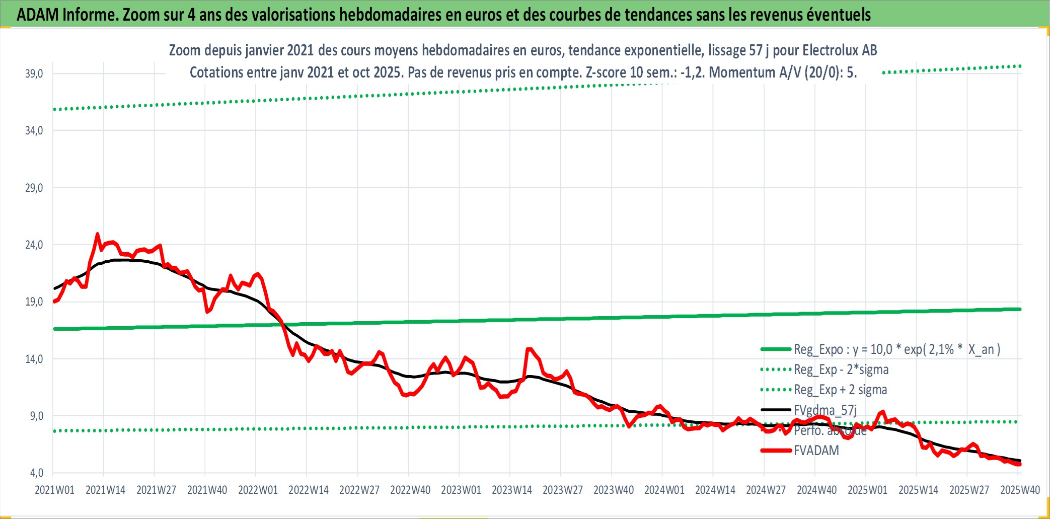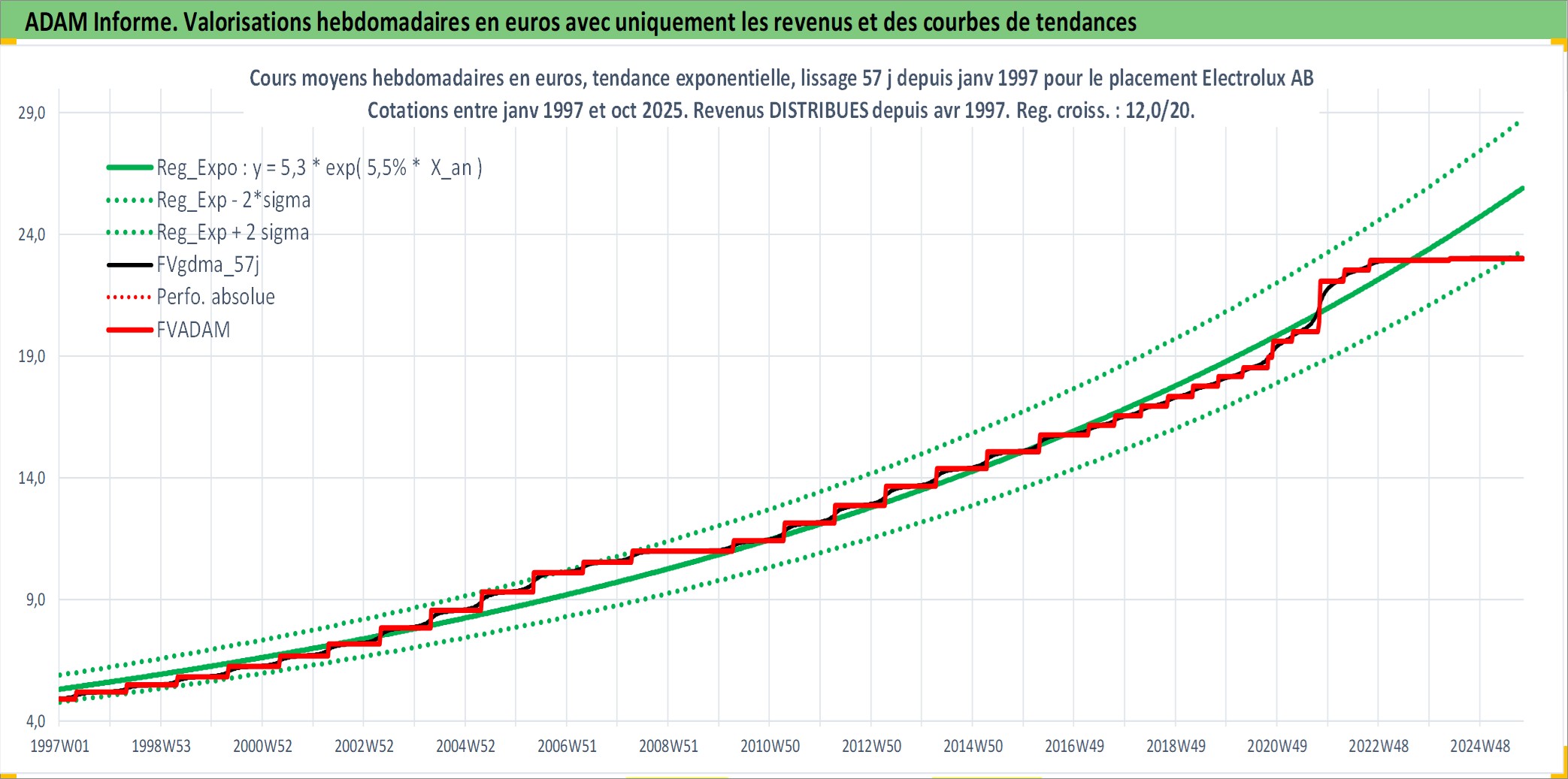 Site dédié aux investisseursPage dédiée sur site financeAnalyse des valorisations hebdomadaires de l'action Electrolux AB. Cet actif est cote en SEK. Les valorisations sont en contrevaleur EURO et couvrent les semaines 1997W01 a 2025W40. Les revenus de cet actif financier sont pris en compte depuis la semaine 1997W18. La note globale ESG de cet actif est estimee a 12.0 (apres rebasage entre 0 et 20).