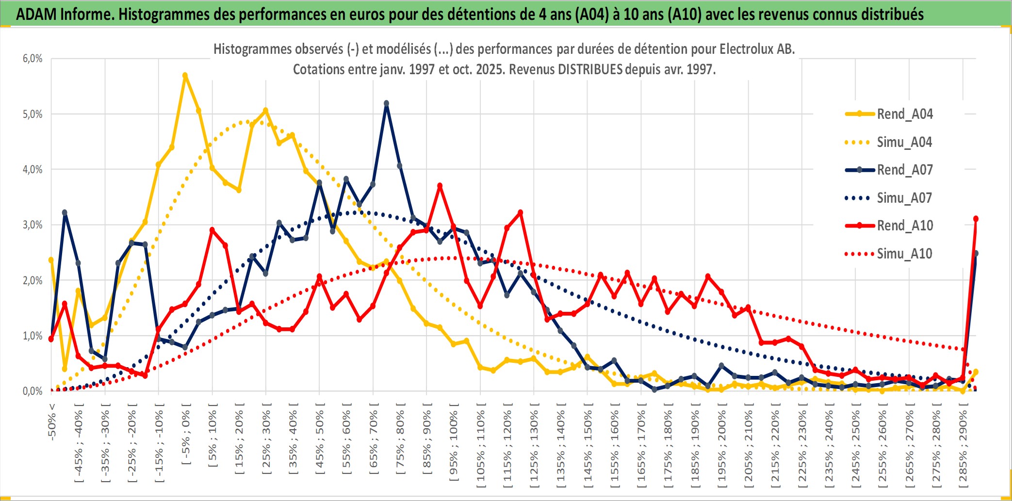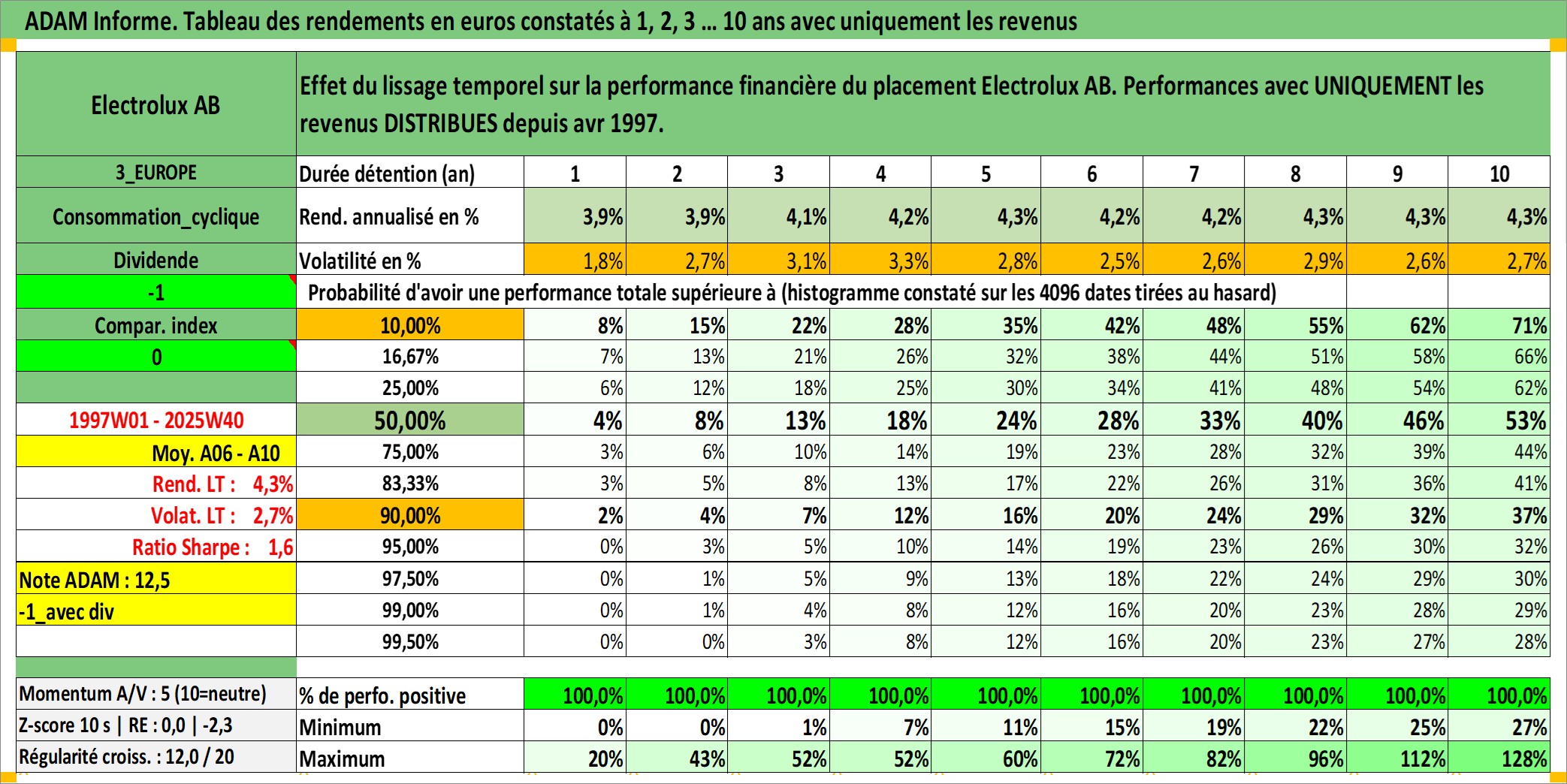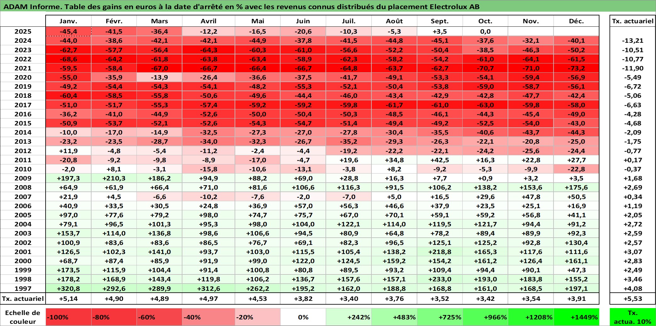 Site dédié aux investisseursPage dédiée sur site financeAnalyse des valorisations hebdomadaires de l'action Electrolux AB. Cet actif est cote en SEK. Les valorisations sont en contrevaleur EURO et couvrent les semaines 1997W01 a 2025W40. Les revenus de cet actif financier sont pris en compte depuis la semaine 1997W18. La note globale ESG de cet actif est estimee a 12.0 (apres rebasage entre 0 et 20).