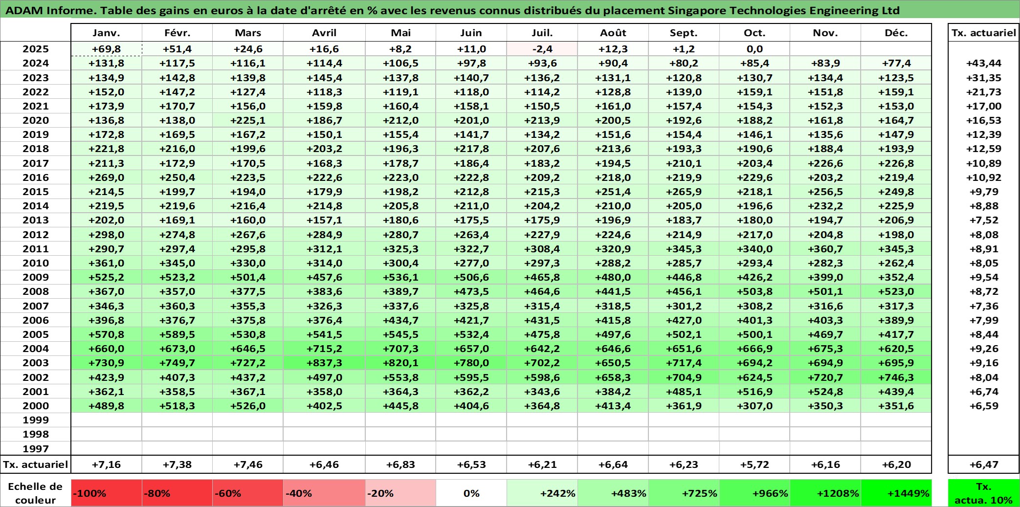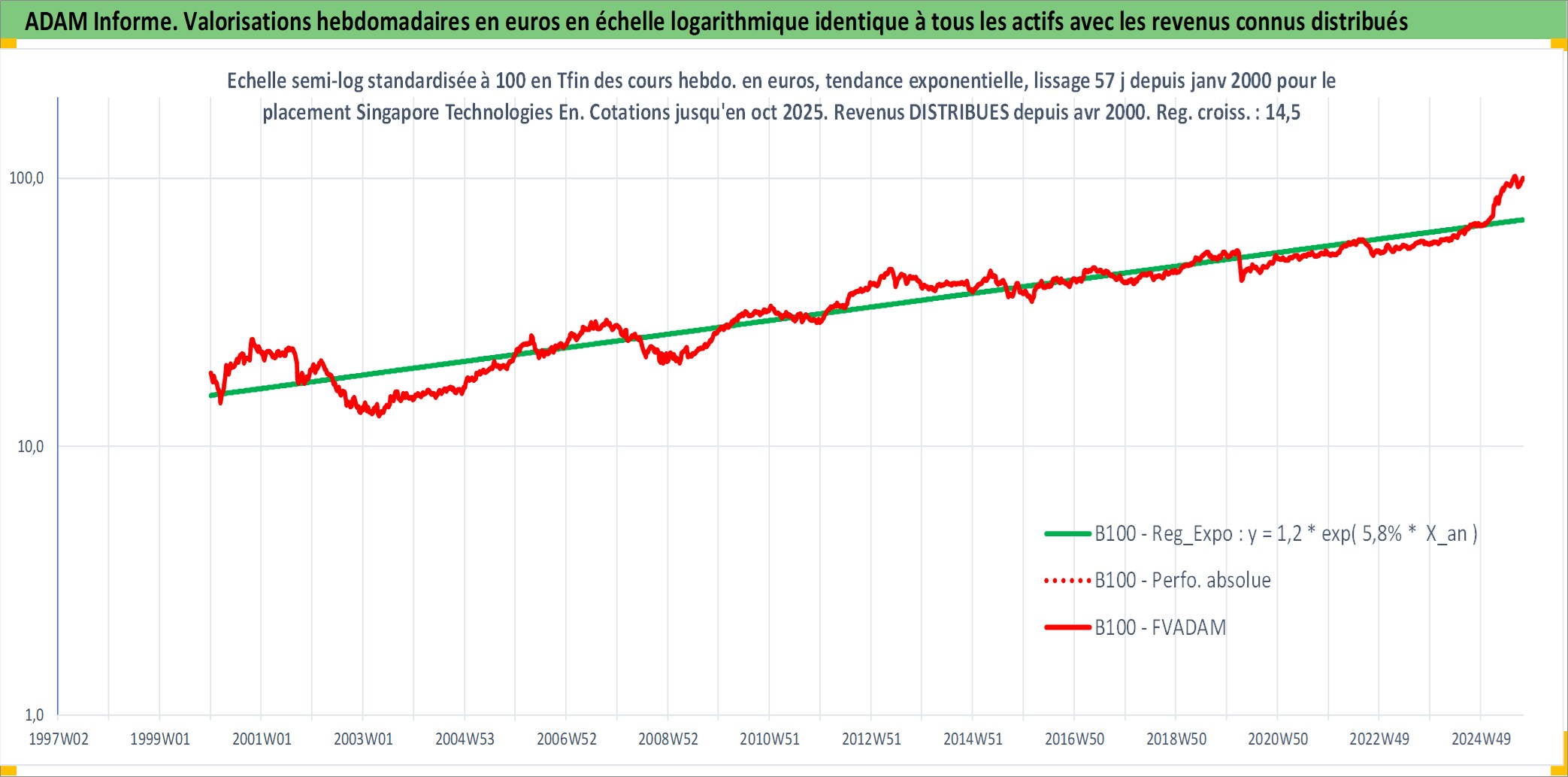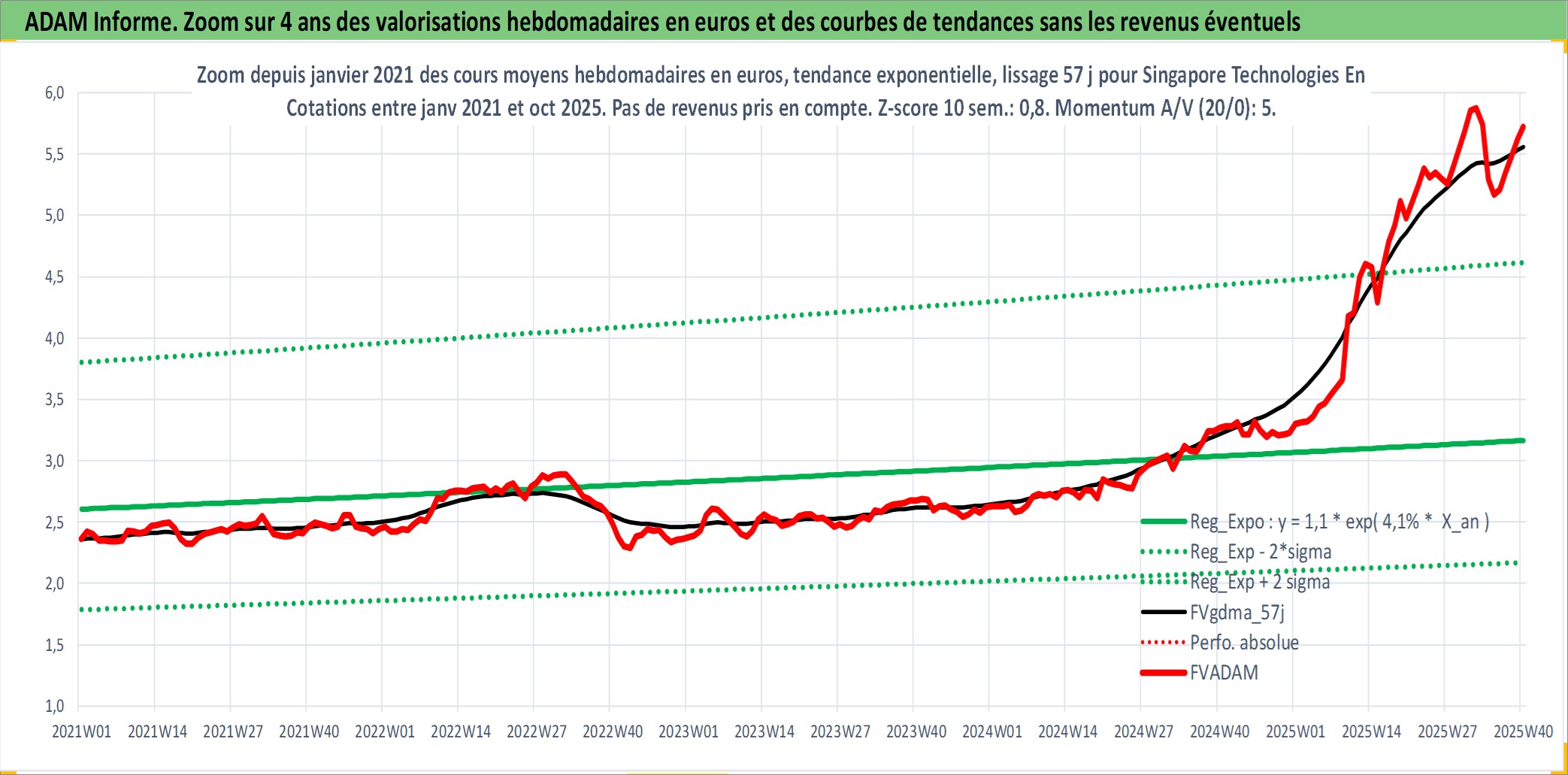Site dédié aux investisseursPage dédiée sur site financeAnalyse des valorisations hebdomadaires de l'action Singapore Technologies Engineering Ltd. Cet actif est cote en SGD. Les valorisations sont en contrevaleur EURO et couvrent les semaines 2000W01 a 2025W40. Les revenus de cet actif financier sont pris en compte depuis la semaine 2000W14. La note globale ESG de cet actif est estimee a 5.0 (apres rebasage entre 0 et 20).