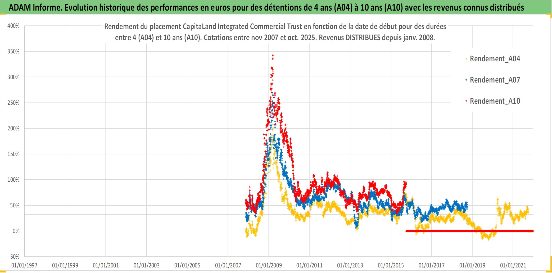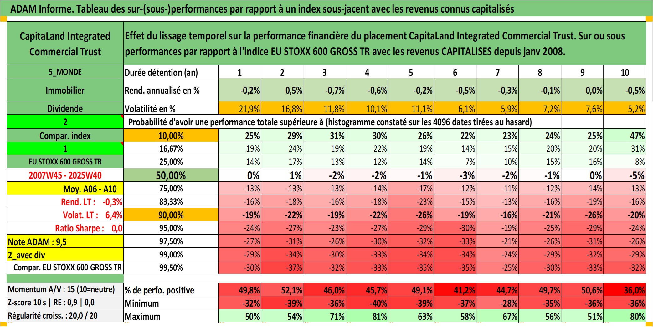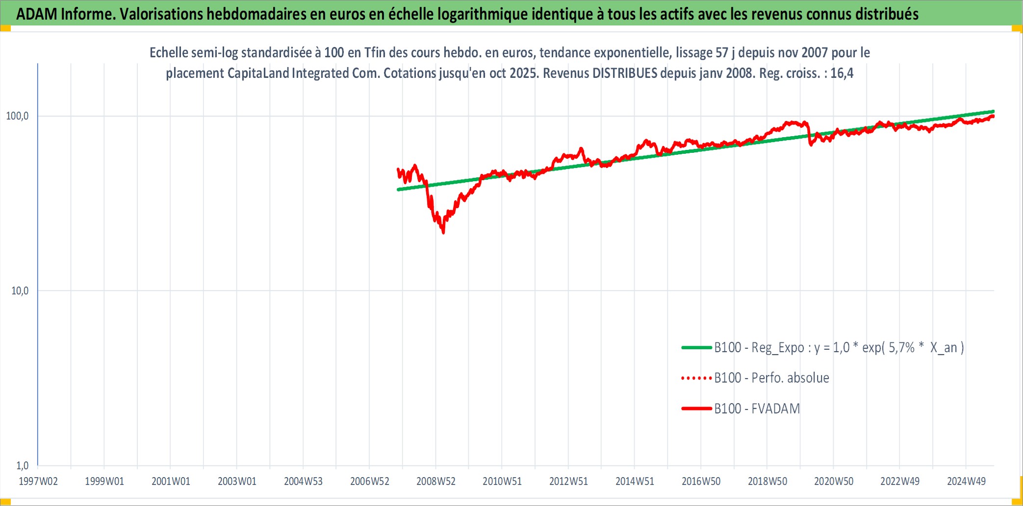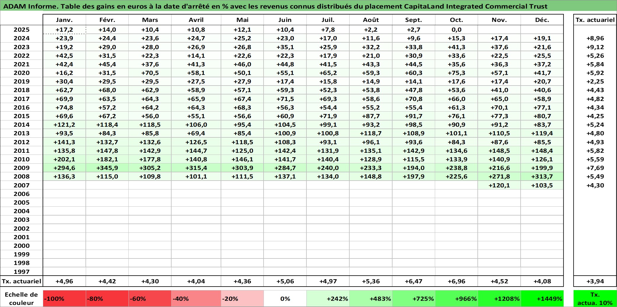 Site dédié aux investisseursPage dédiée sur site financeAnalyse des valorisations hebdomadaires de l'action CapitaLand Integrated Commercial Trust. Cet actif est cote en SGD. Les valorisations sont en contrevaleur EURO et couvrent les semaines 2007W45 a 2025W40. Les revenus de cet actif financier sont pris en compte depuis la semaine 2008W05. La note ESG de cet actif n'est pas connue.
