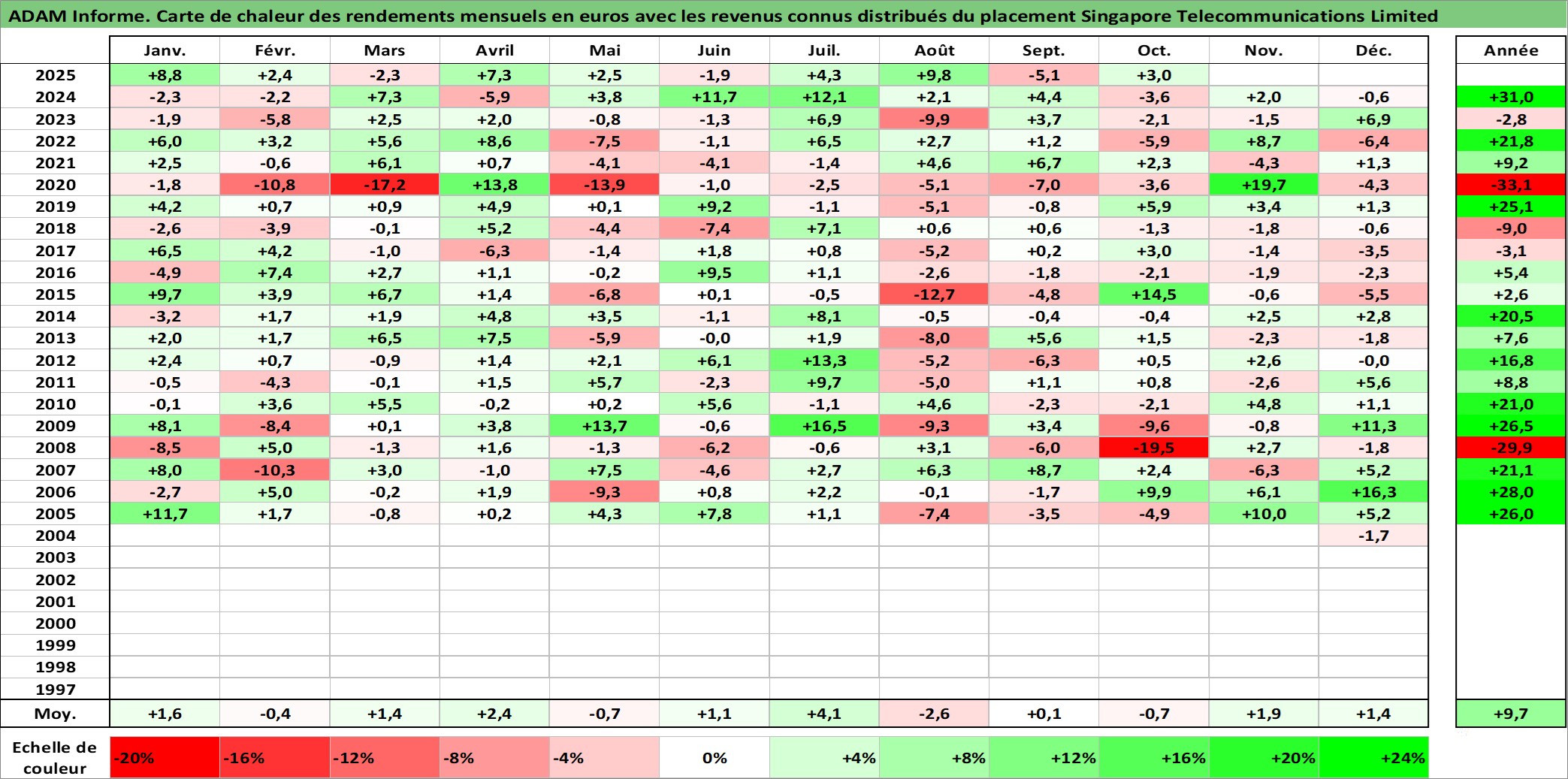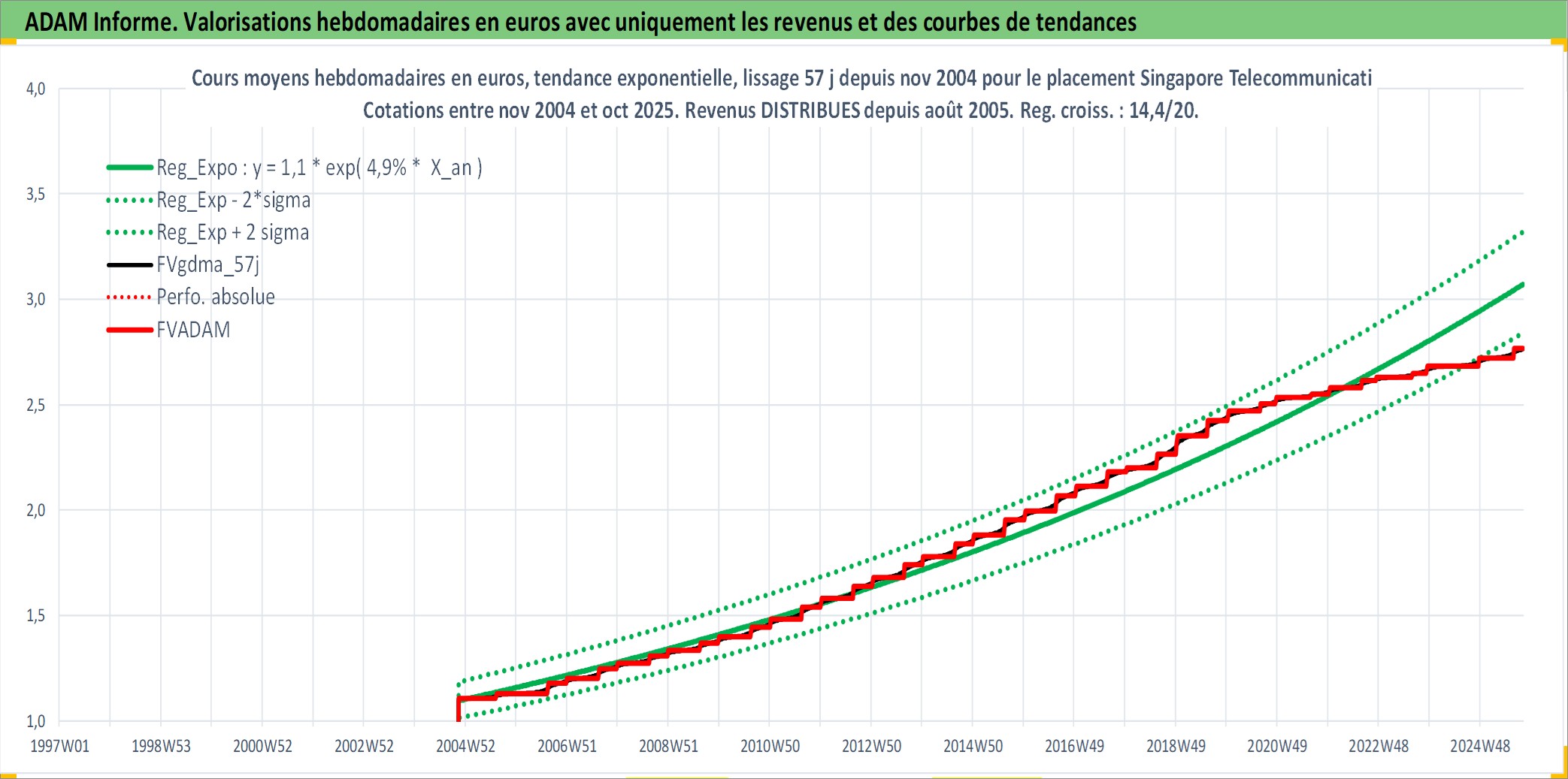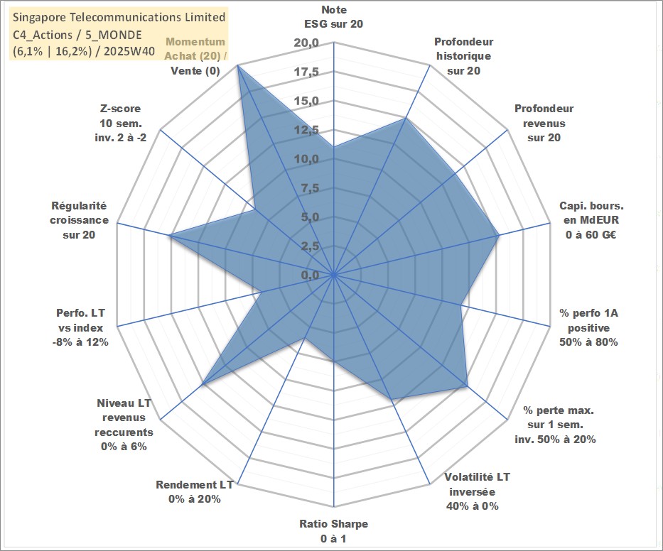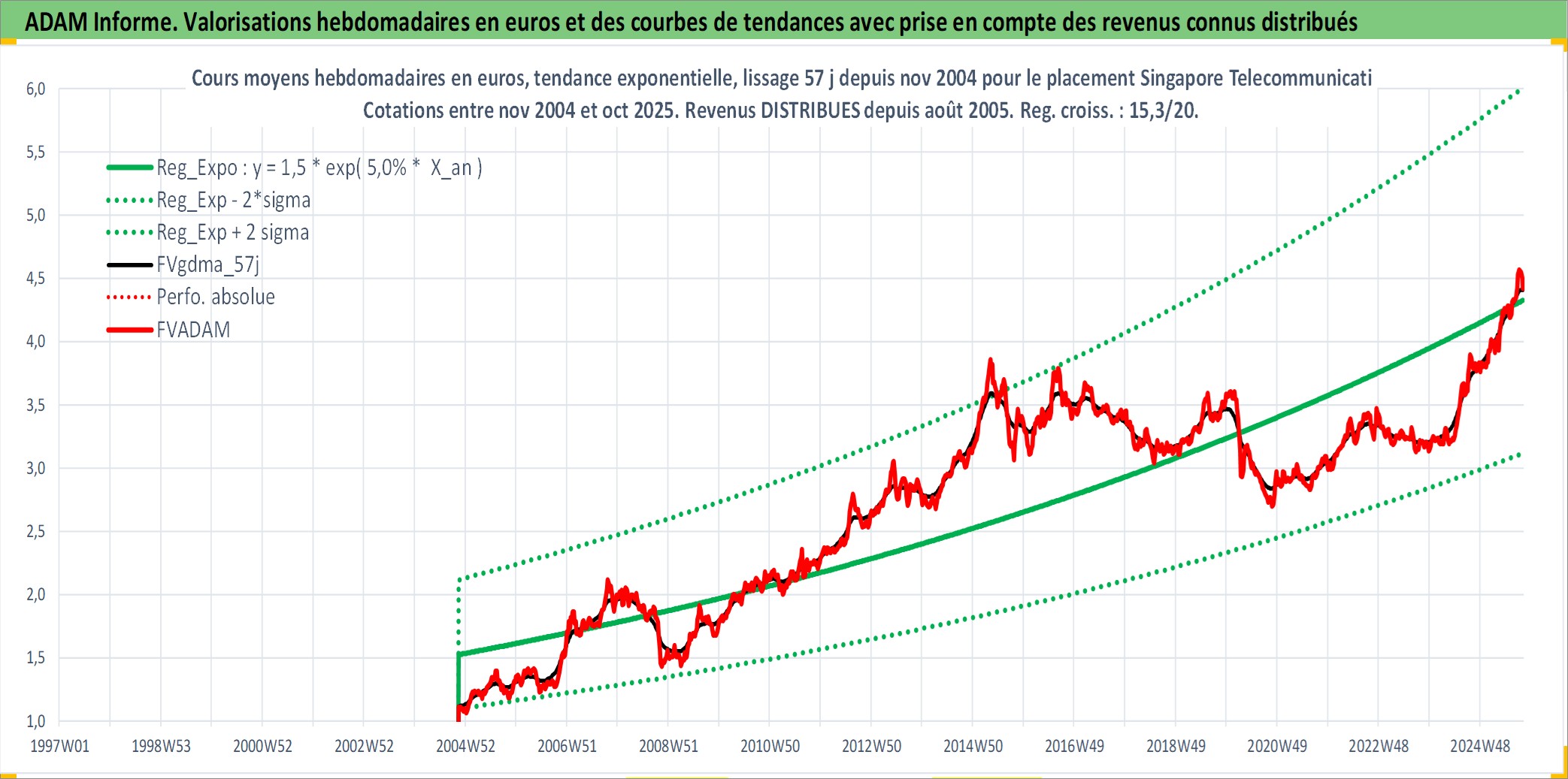 Site dédié aux investisseursPage dédiée sur site financeAnalyse des valorisations hebdomadaires de l'action Singapore Telecommunications Limited. Cet actif est cote en SGD. Les valorisations sont en contrevaleur EURO et couvrent les semaines 2004W45 a 2025W40. Les revenus de cet actif financier sont pris en compte depuis la semaine 2005W31. La note globale ESG de cet actif est estimee a 11.0 (apres rebasage entre 0 et 20).