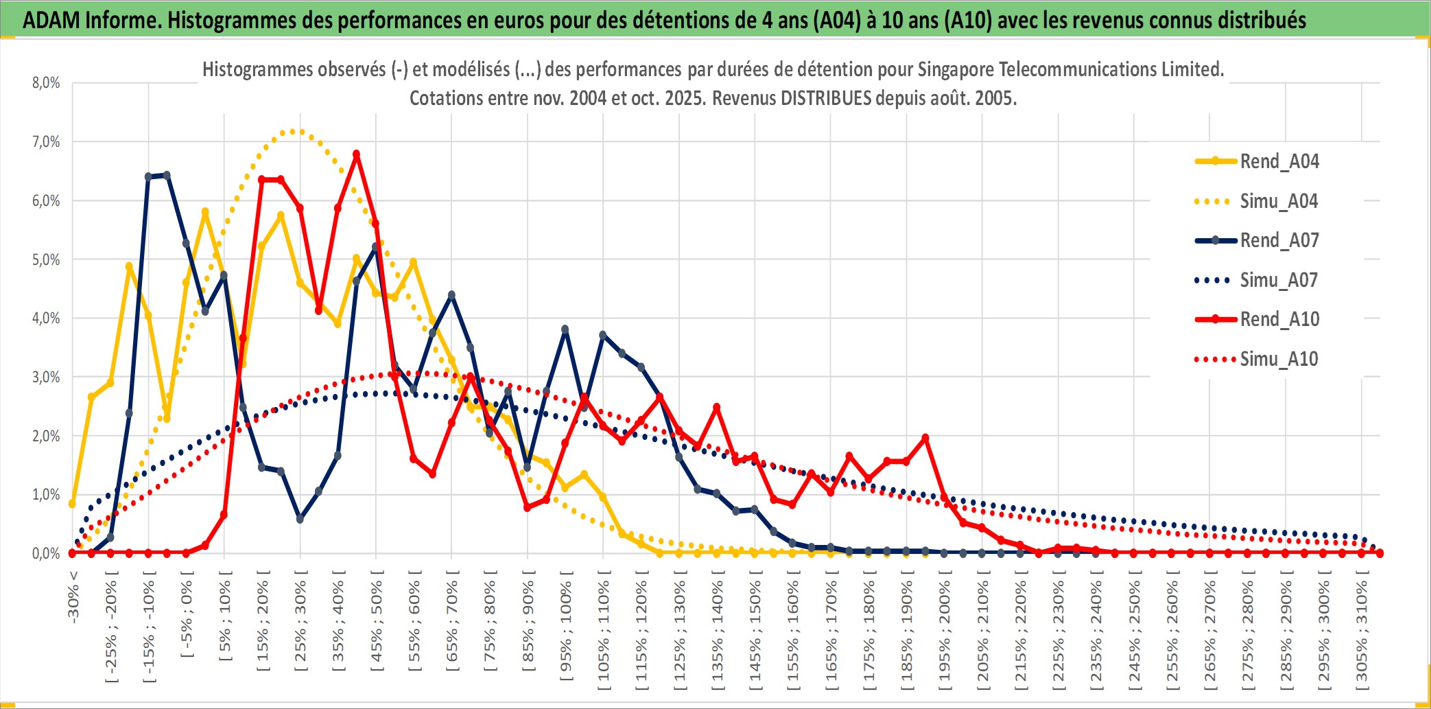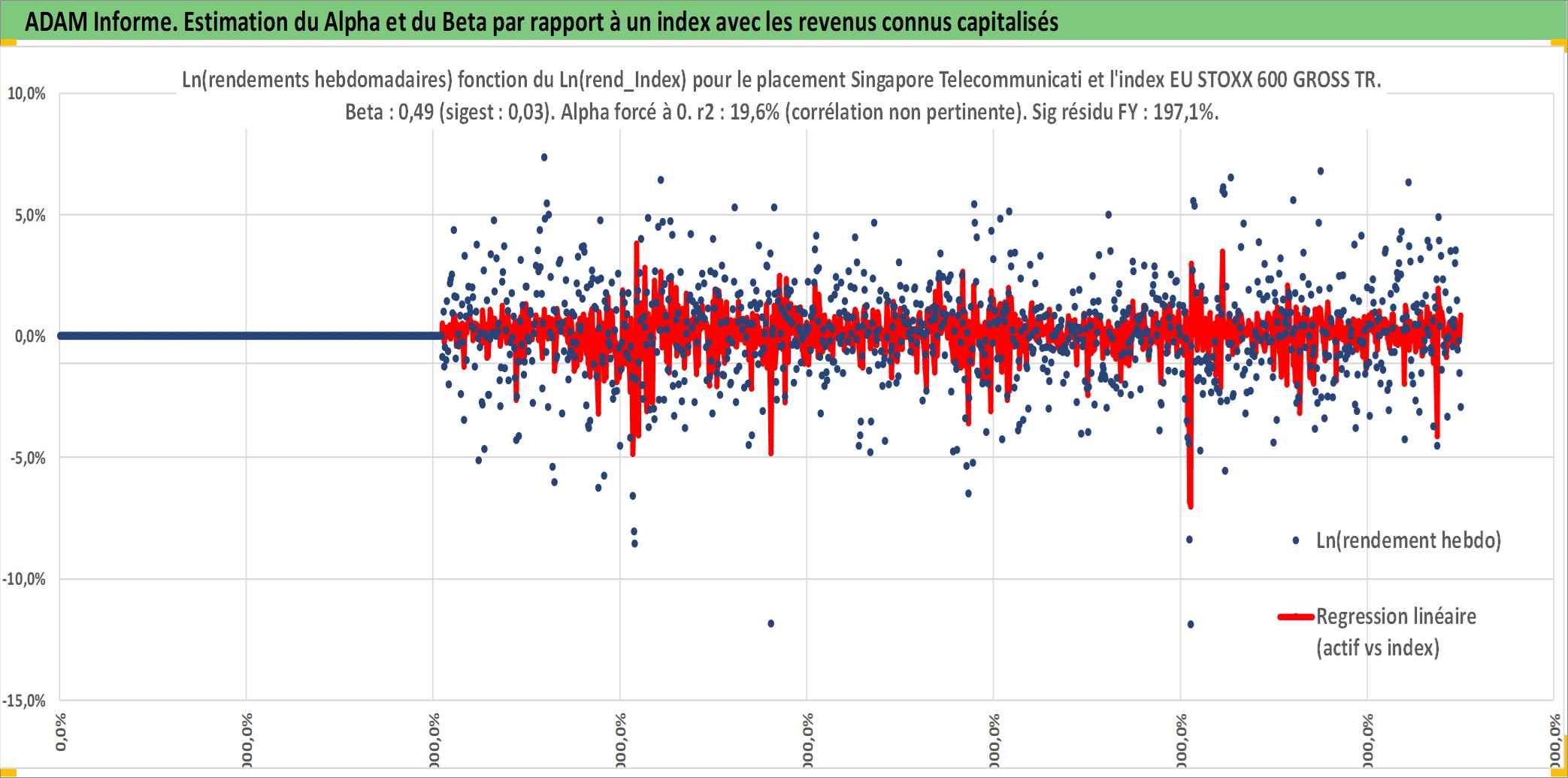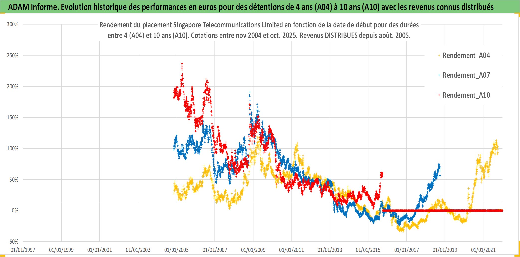 Site dédié aux investisseursPage dédiée sur site financeAnalyse des valorisations hebdomadaires de l'action Singapore Telecommunications Limited. Cet actif est cote en SGD. Les valorisations sont en contrevaleur EURO et couvrent les semaines 2004W45 a 2025W40. Les revenus de cet actif financier sont pris en compte depuis la semaine 2005W31. La note globale ESG de cet actif est estimee a 11.0 (apres rebasage entre 0 et 20).