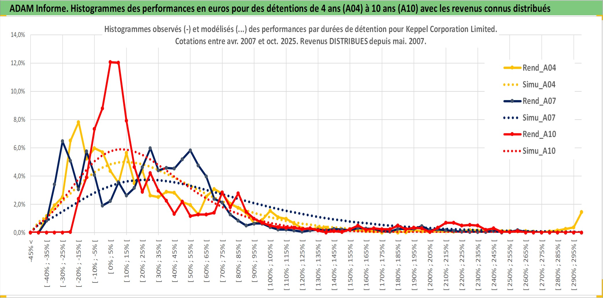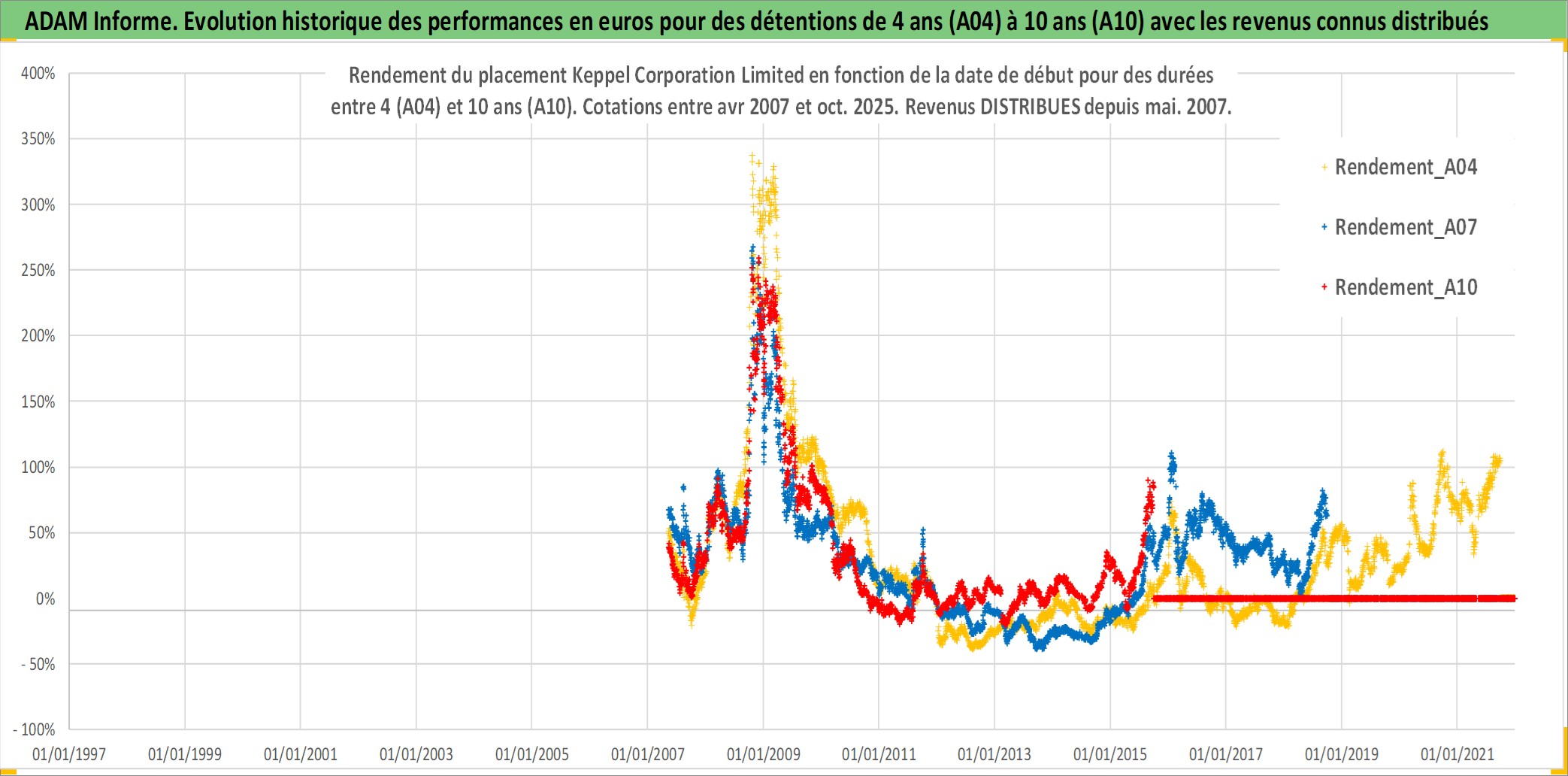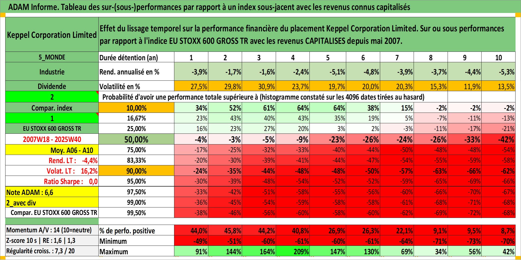 Site dédié aux investisseursPage dédiée sur site financeAnalyse des valorisations hebdomadaires de l'action Keppel Corporation Limited. Cet actif est cote en SGD. Les valorisations sont en contrevaleur EURO et couvrent les semaines 2007W18 a 2025W40. Les revenus de cet actif financier sont pris en compte depuis la semaine 2007W18. La note globale ESG de cet actif est estimee a 2.0 (apres rebasage entre 0 et 20).