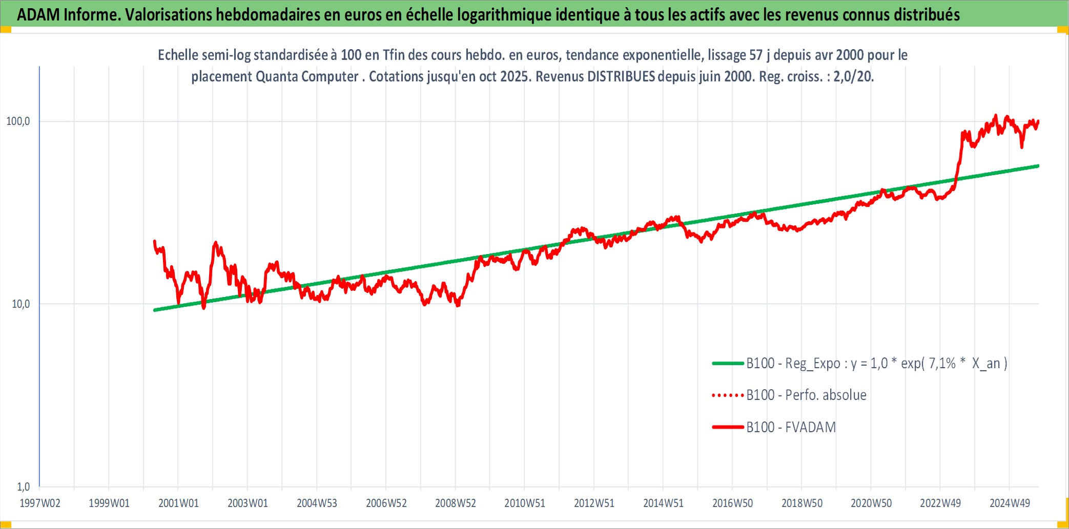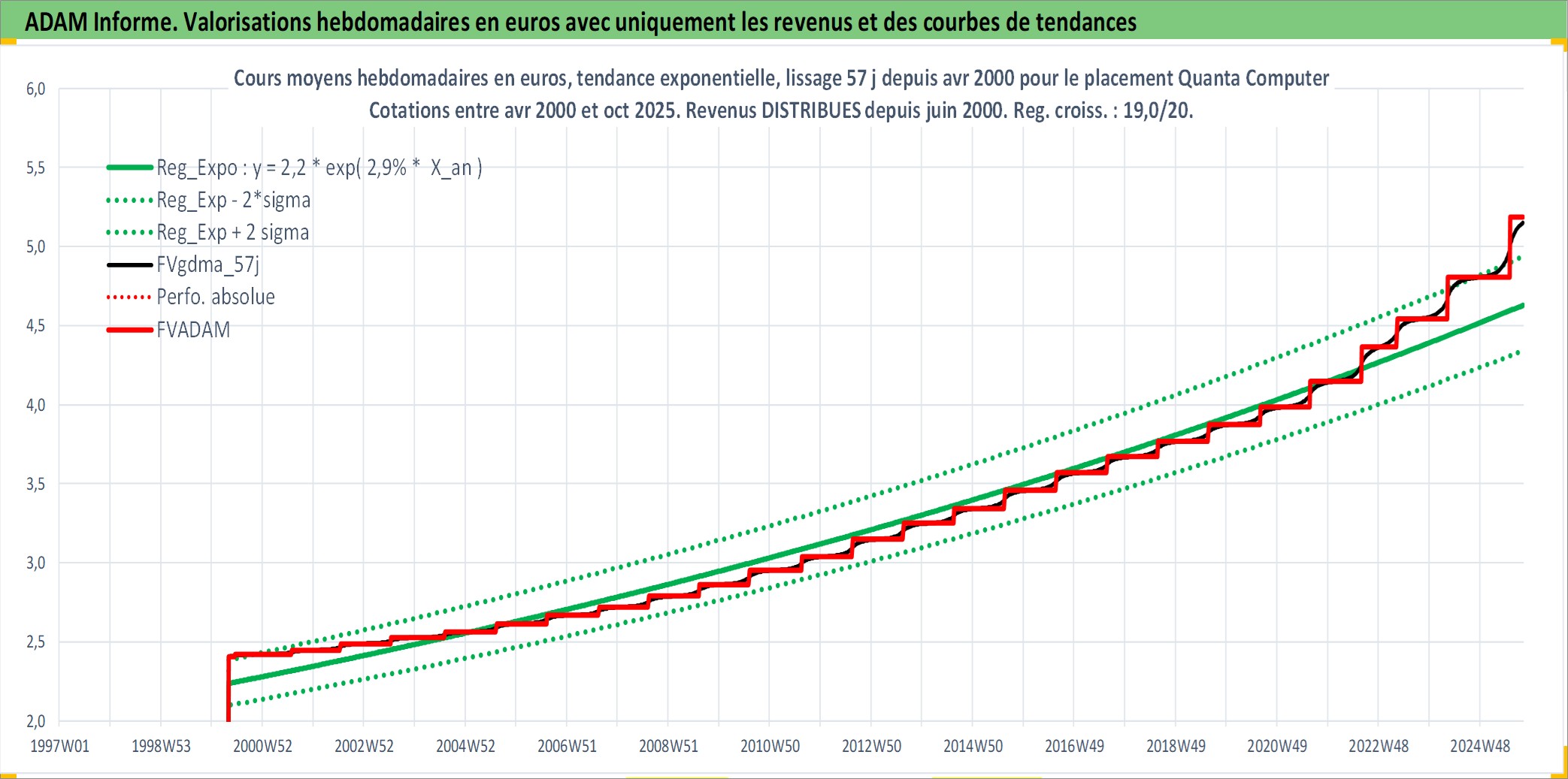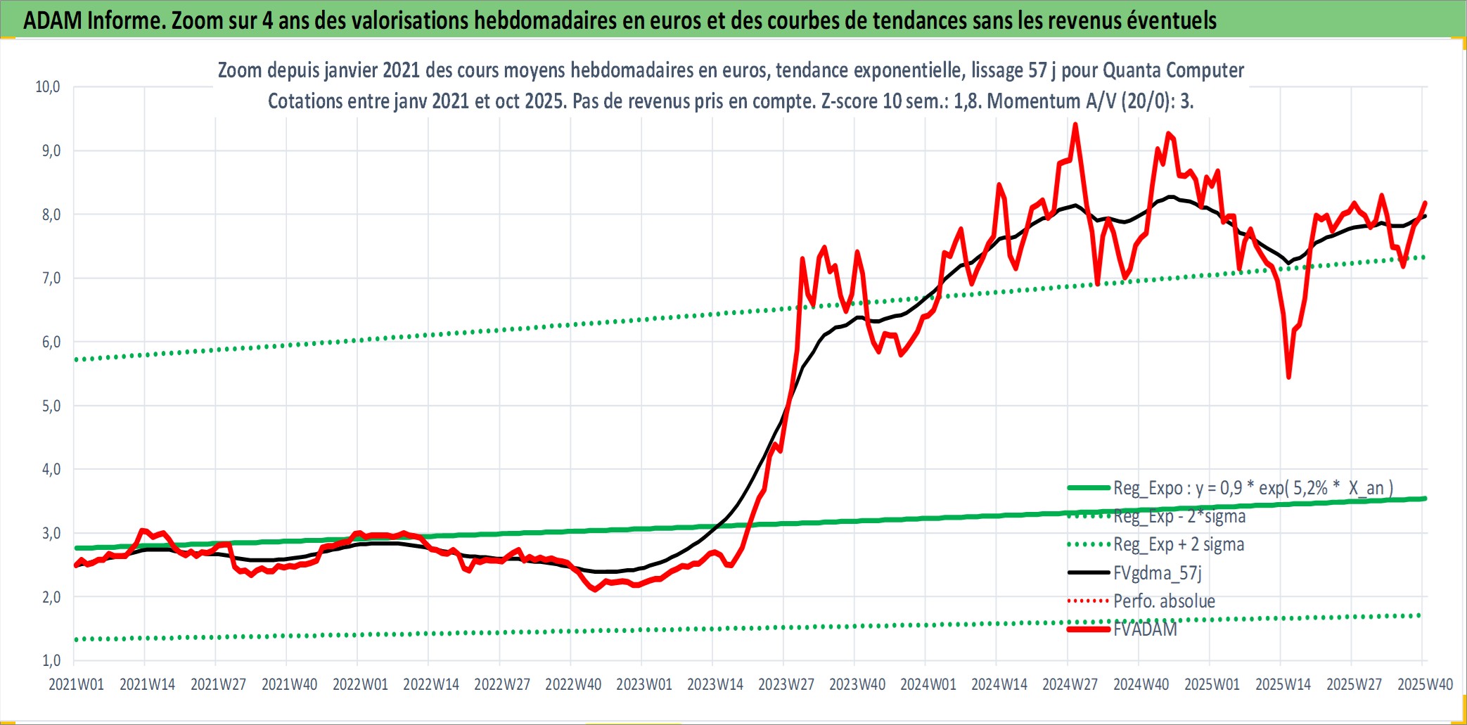 Site dédié aux investisseursPage dédiée sur site financeAnalyse des valorisations hebdomadaires de l'action Quanta Computer . Cet actif est cote en TWD. Les valorisations sont en contrevaleur EURO et couvrent les semaines 2000W17 a 2025W40. Les revenus de cet actif financier sont pris en compte depuis la semaine 2000W24. La note globale ESG de cet actif est estimee a 9.0 (apres rebasage entre 0 et 20).